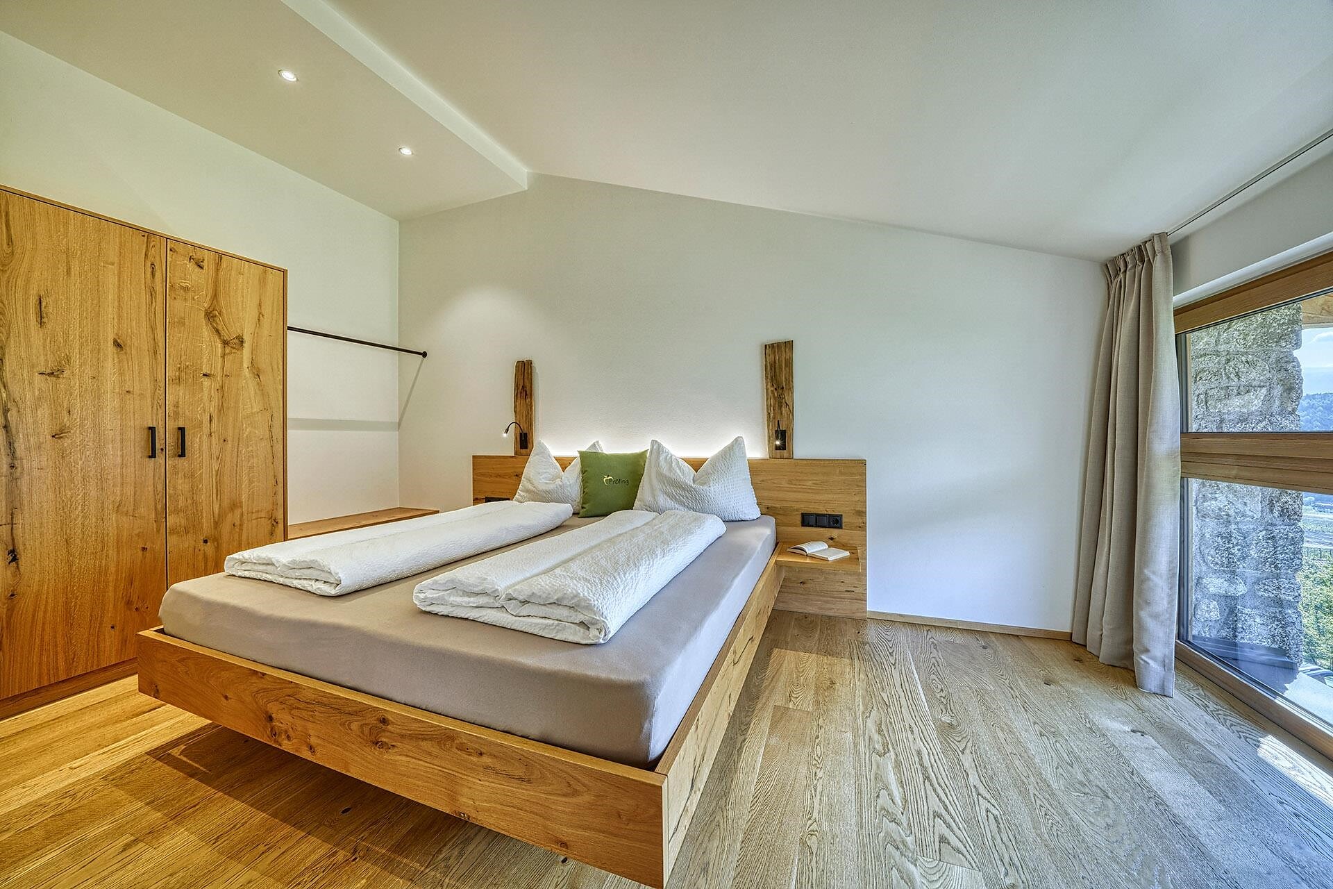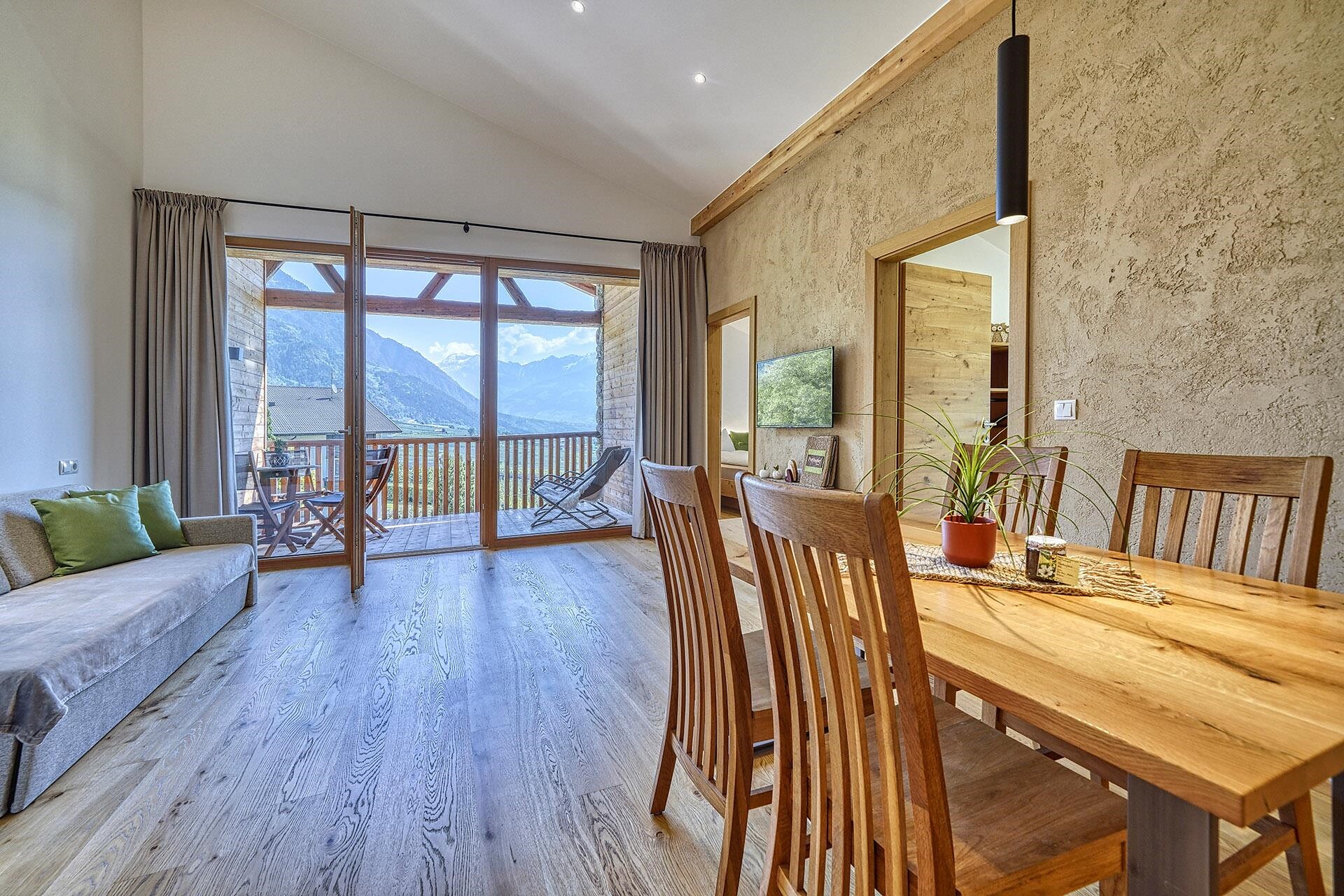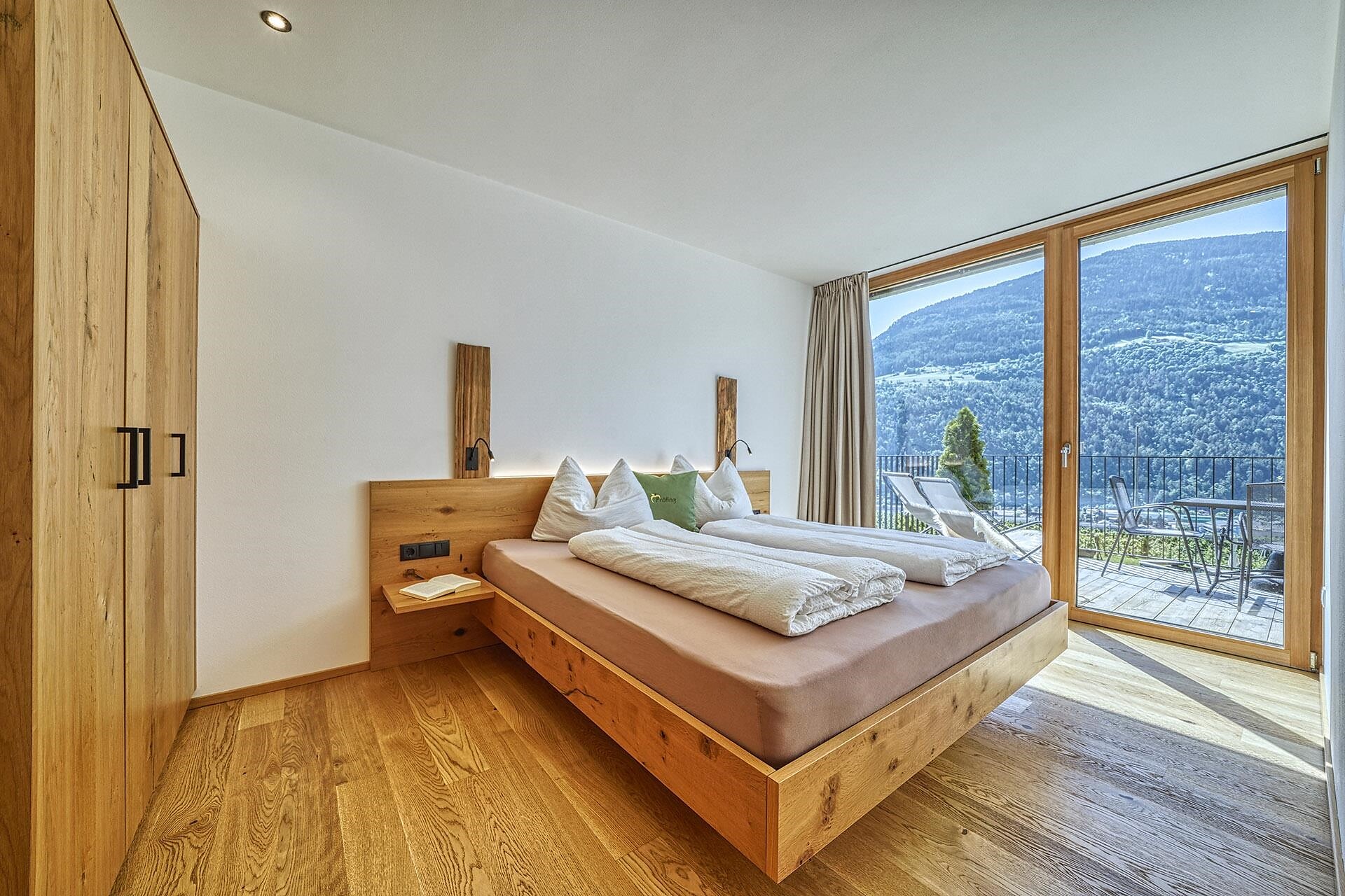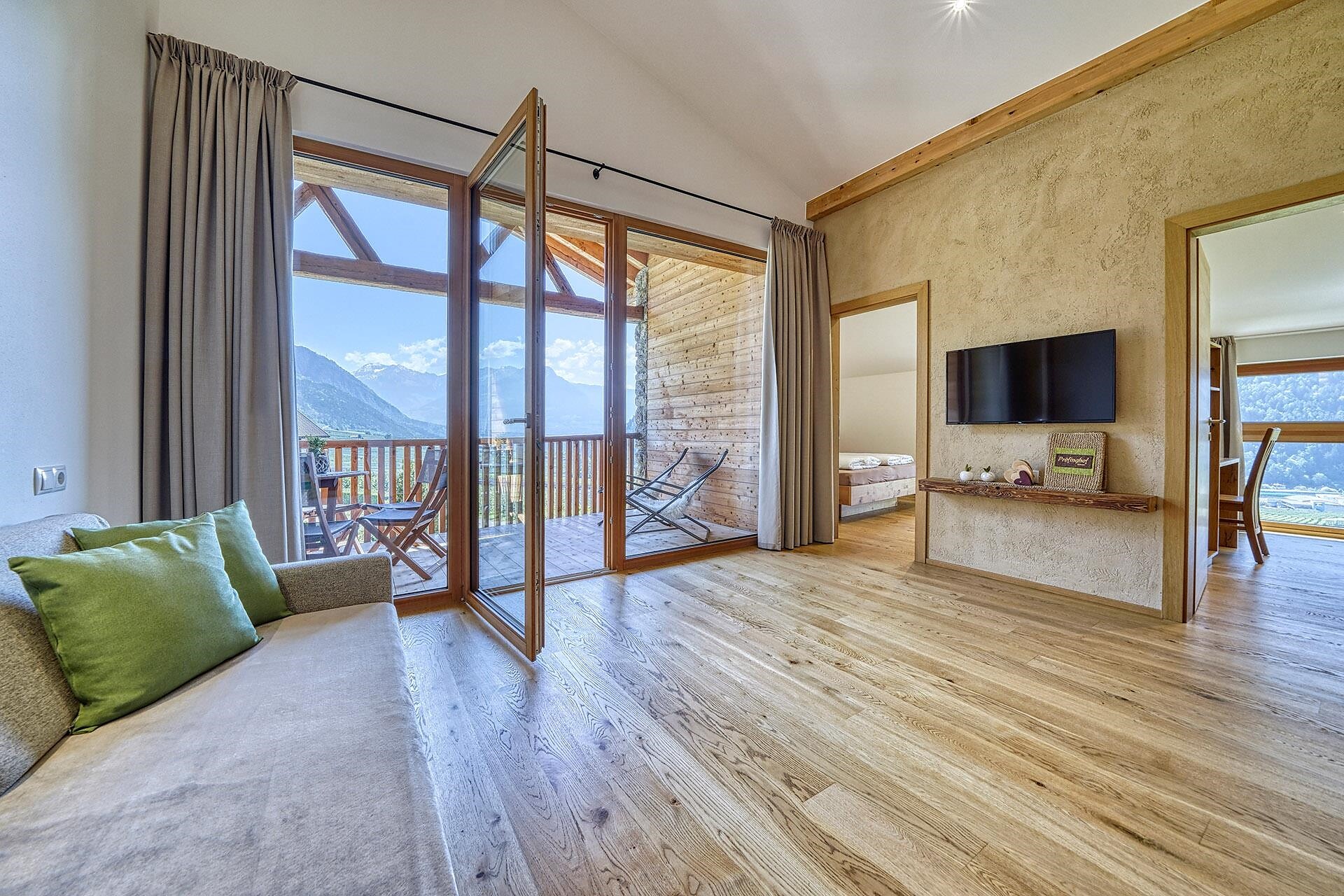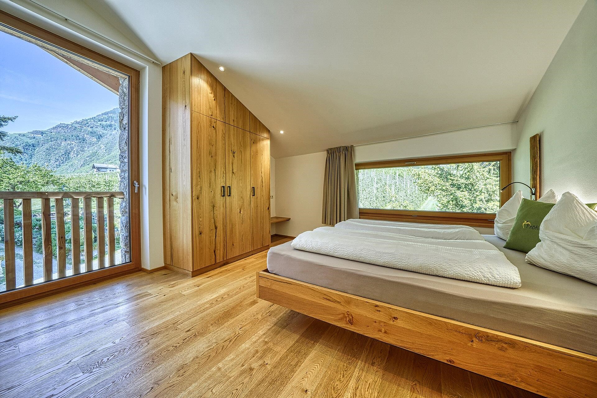 The dreamy "Epflplua" (South Tyrolean apple blossom) is located on the ground floor of our barn and offers 2 separate sleeping areas (a bedroom with a double bed and a bedroom with a double bed), floor-to-ceiling window facades facing south and a wonderful panoramic south-facing balcony (approx. 10 m²) a very special holiday experience.
