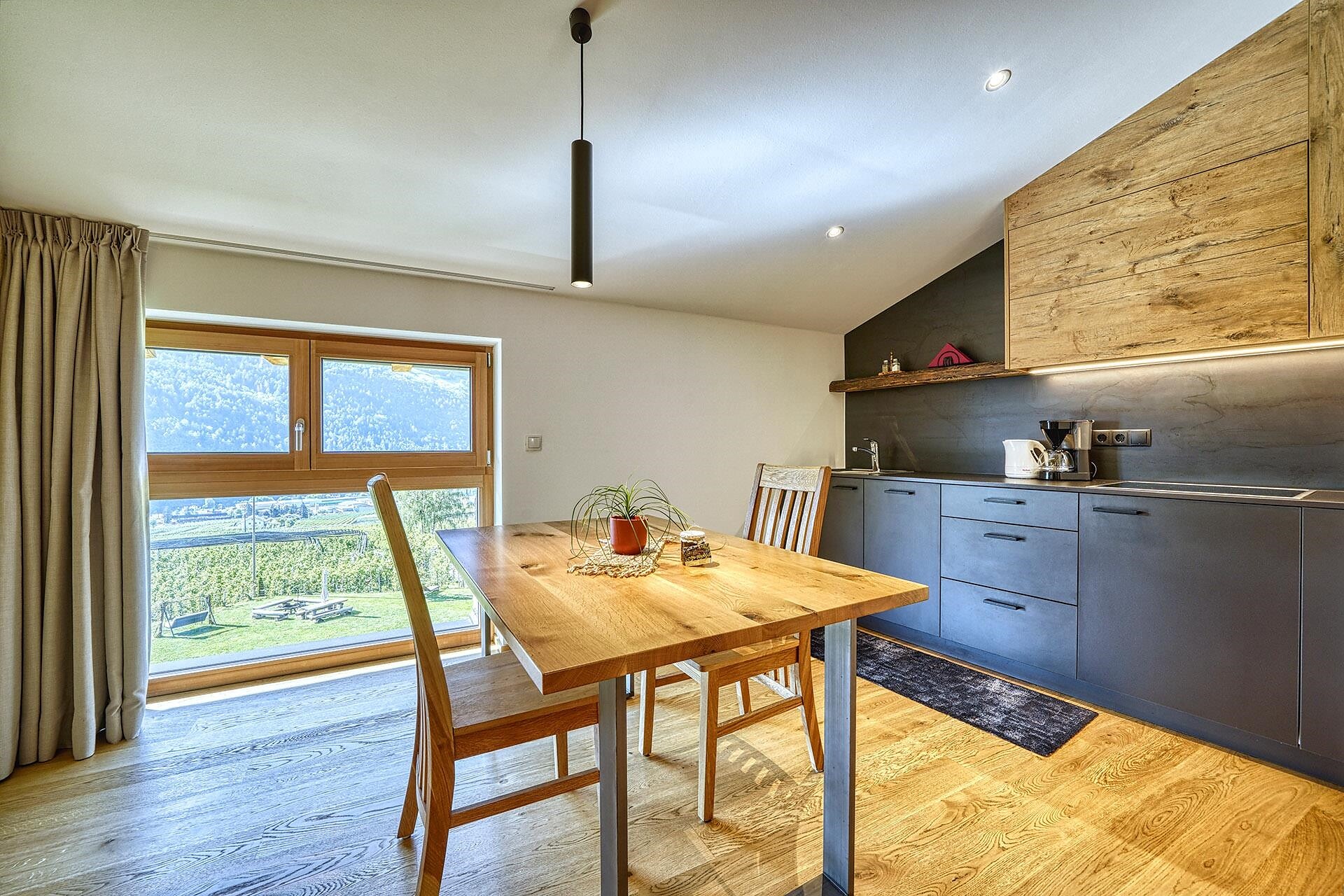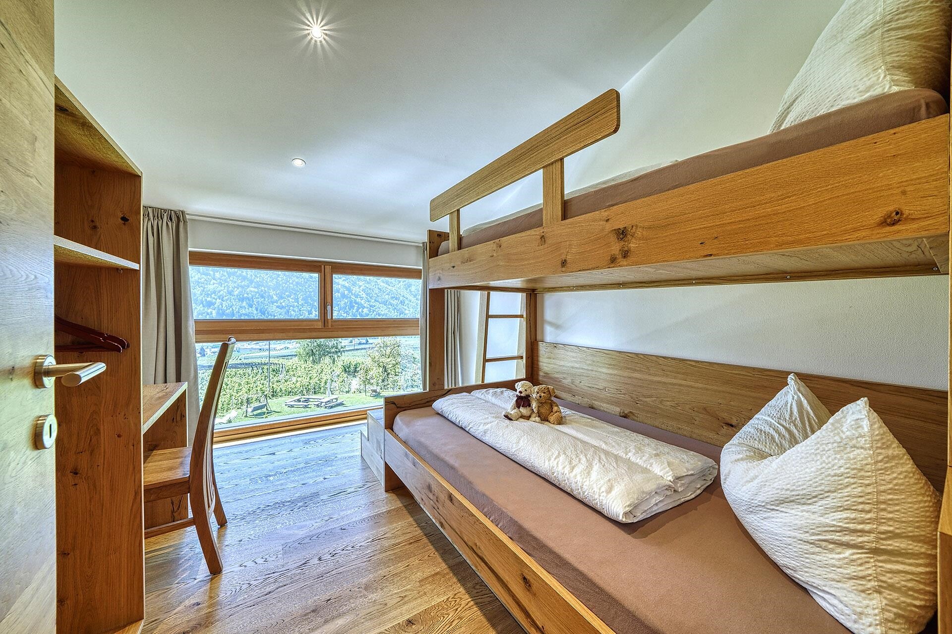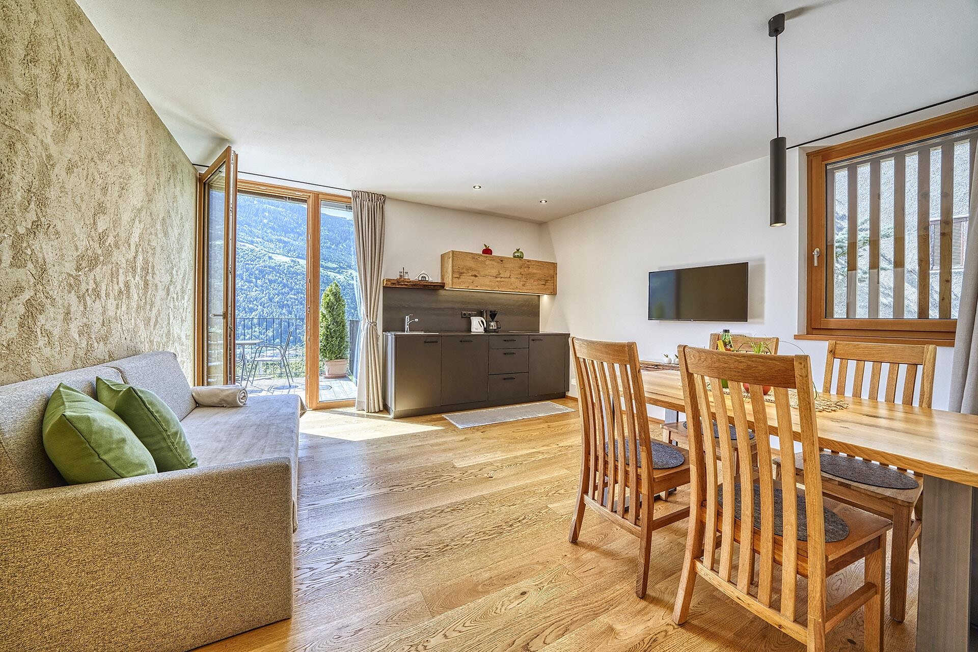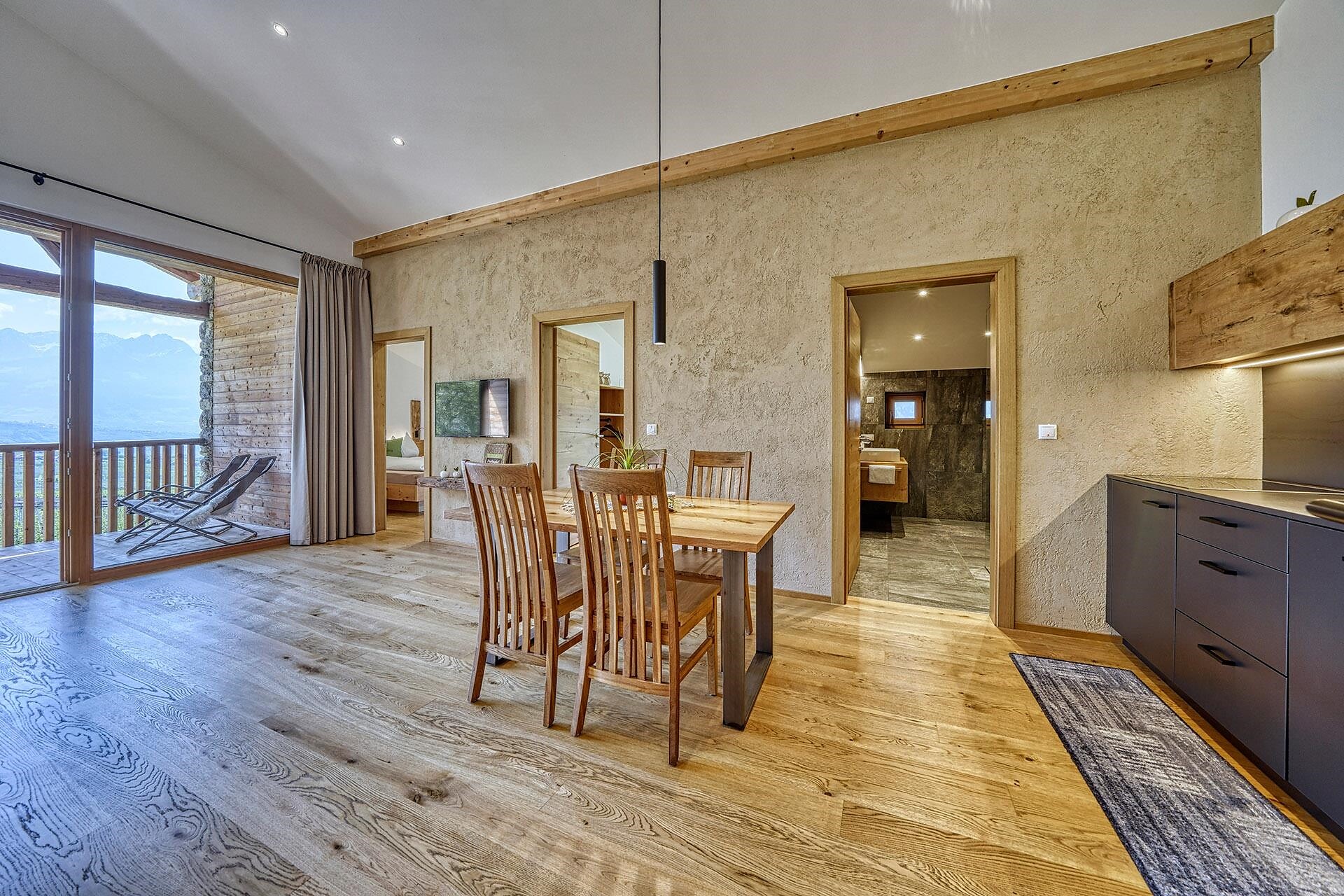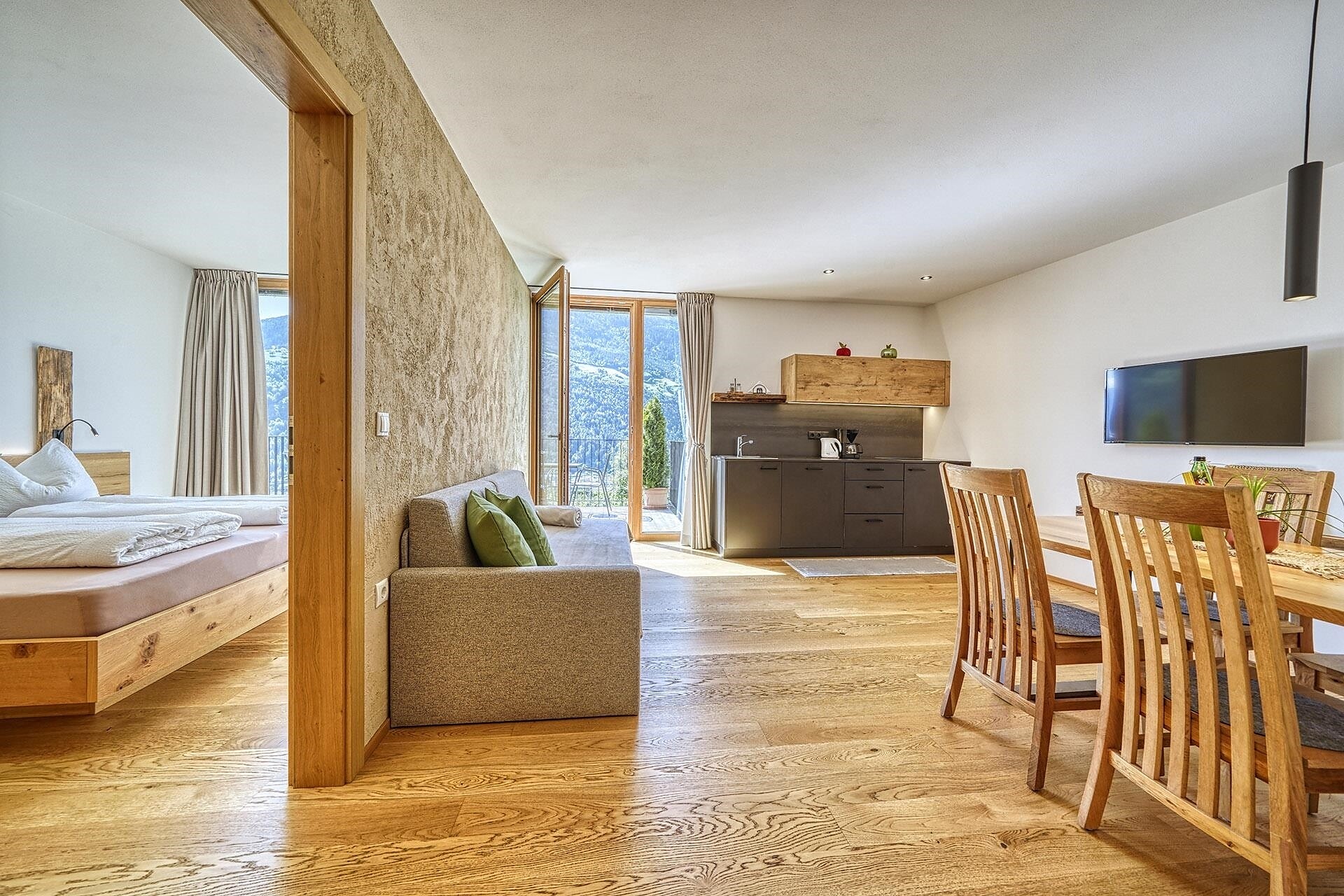 The dreamy "Epflplua" (South Tyrolean apple blossom) is located on the ground floor of our barn and offers 2 separate sleeping areas (a bedroom with a double bed and a bedroom with a double bed), floor-to-ceiling window facades facing south and a wonderful panoramic south-facing balcony (approx. 10 m²) a very special holiday experience.