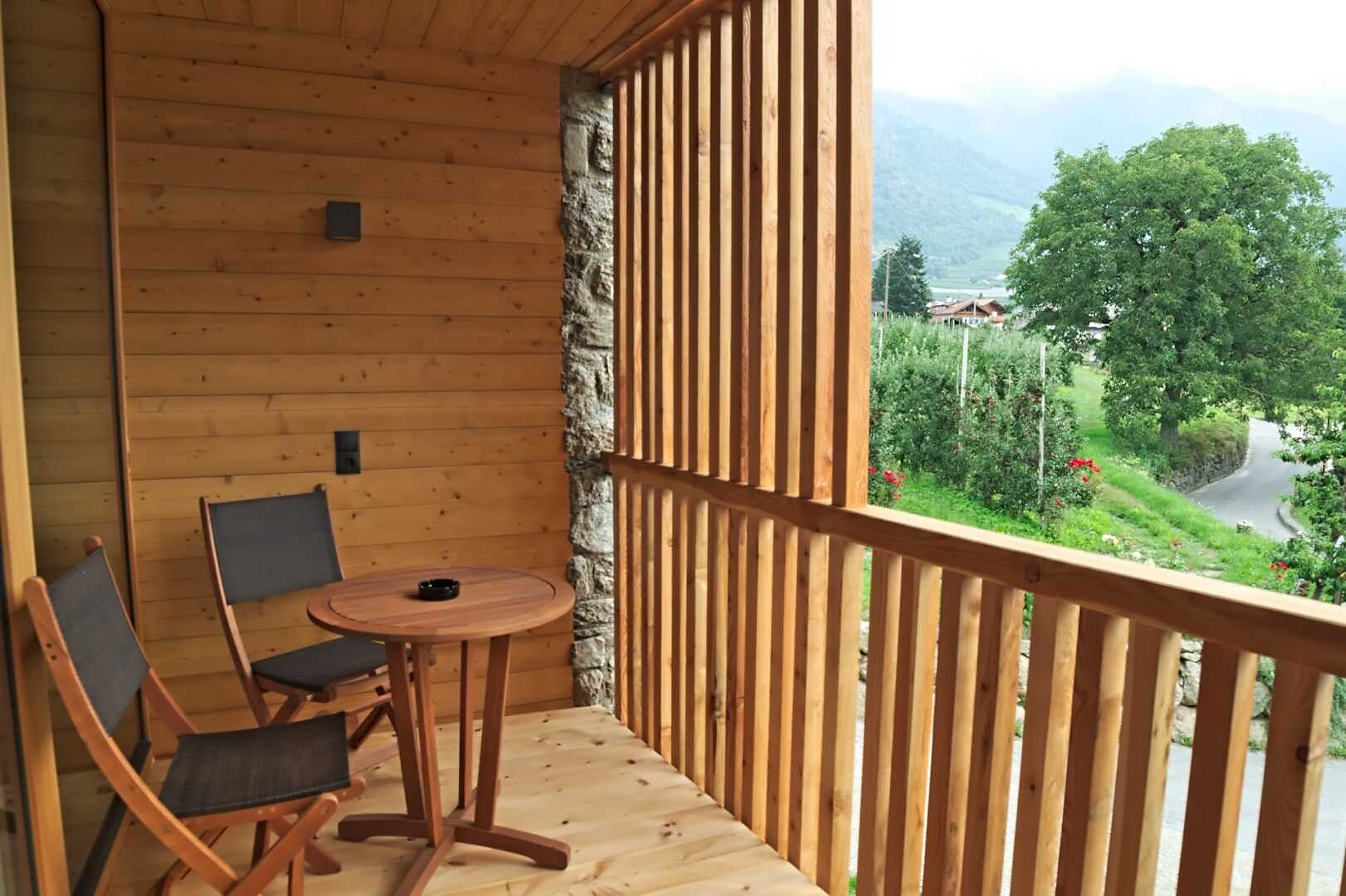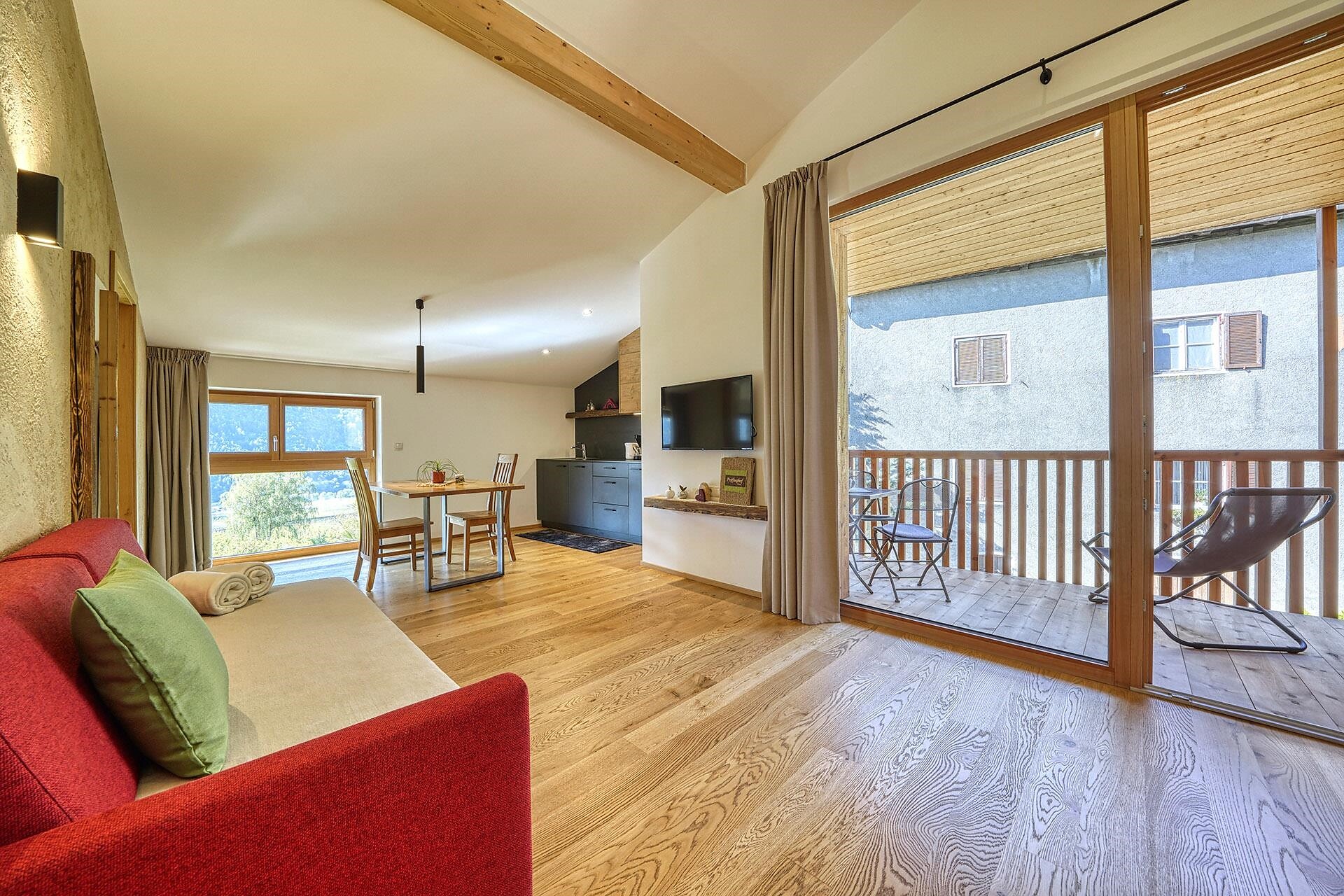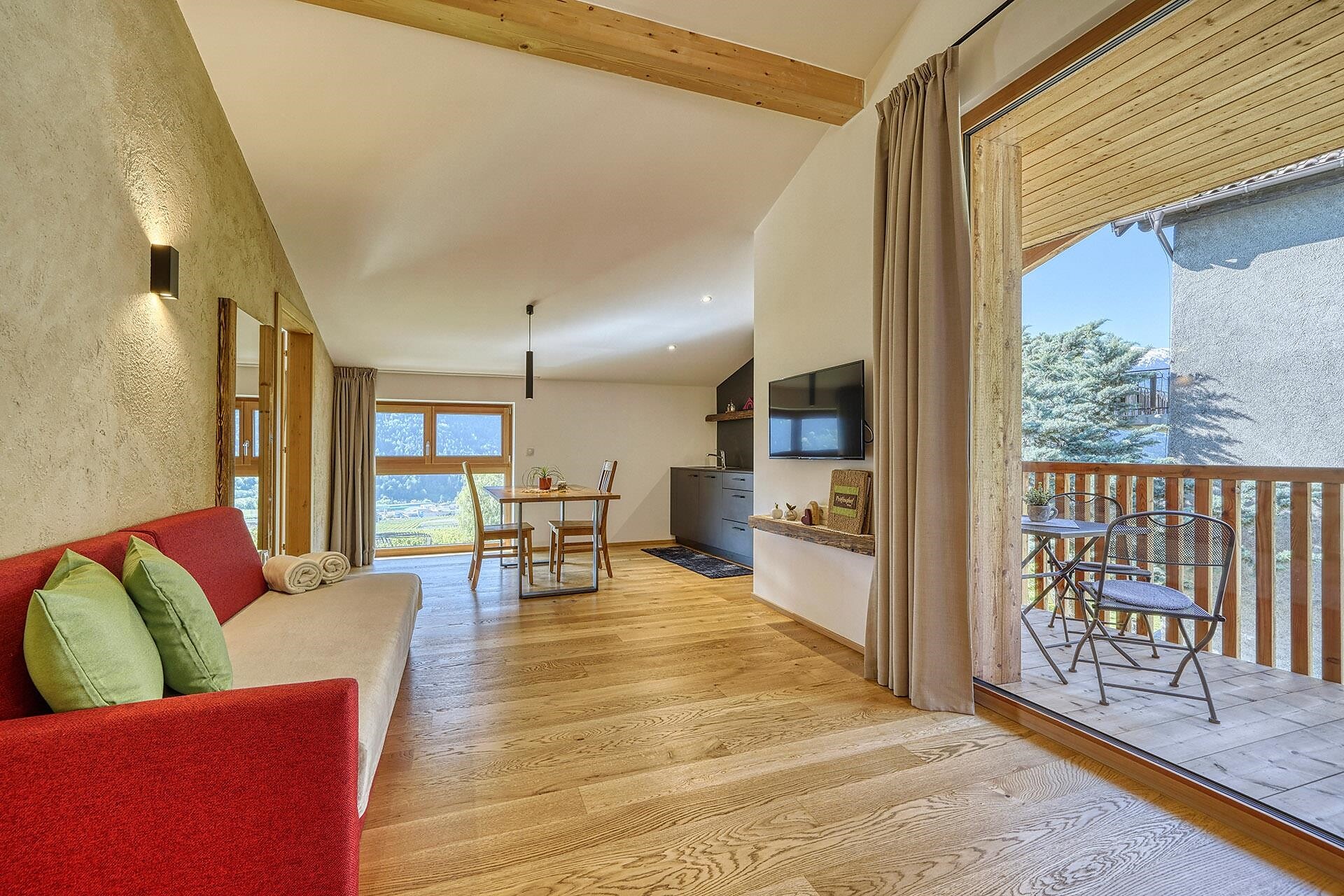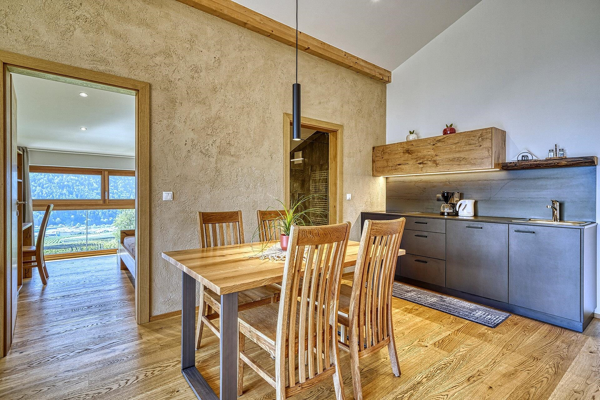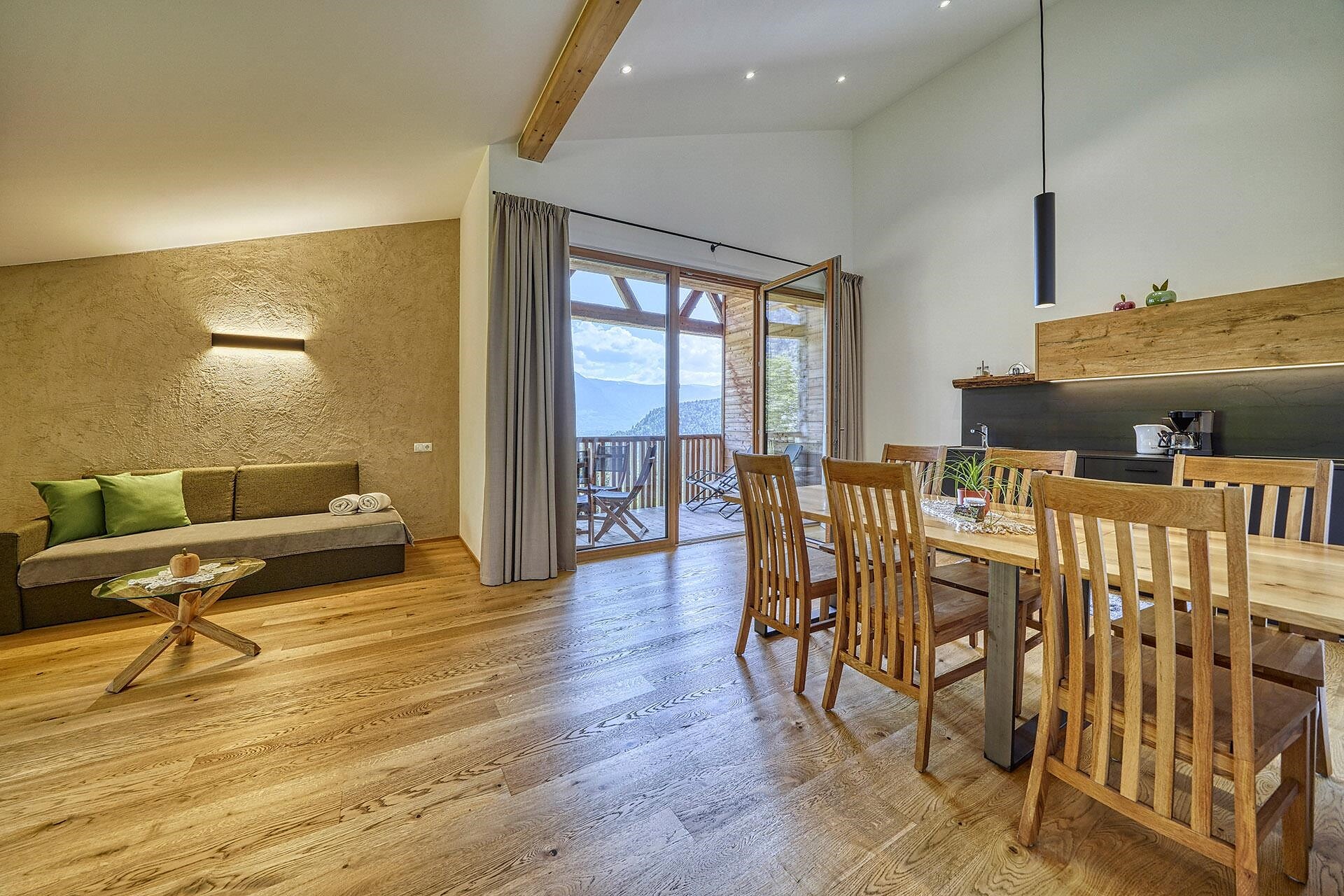 The dreamy "Epflplua" (South Tyrolean apple blossom) is located on the ground floor of our barn and offers 2 separate sleeping areas (a bedroom with a double bed and a bedroom with a double bed), floor-to-ceiling window facades facing south and a wonderful panoramic south-facing balcony (approx. 10 m²) a very special holiday experience.
