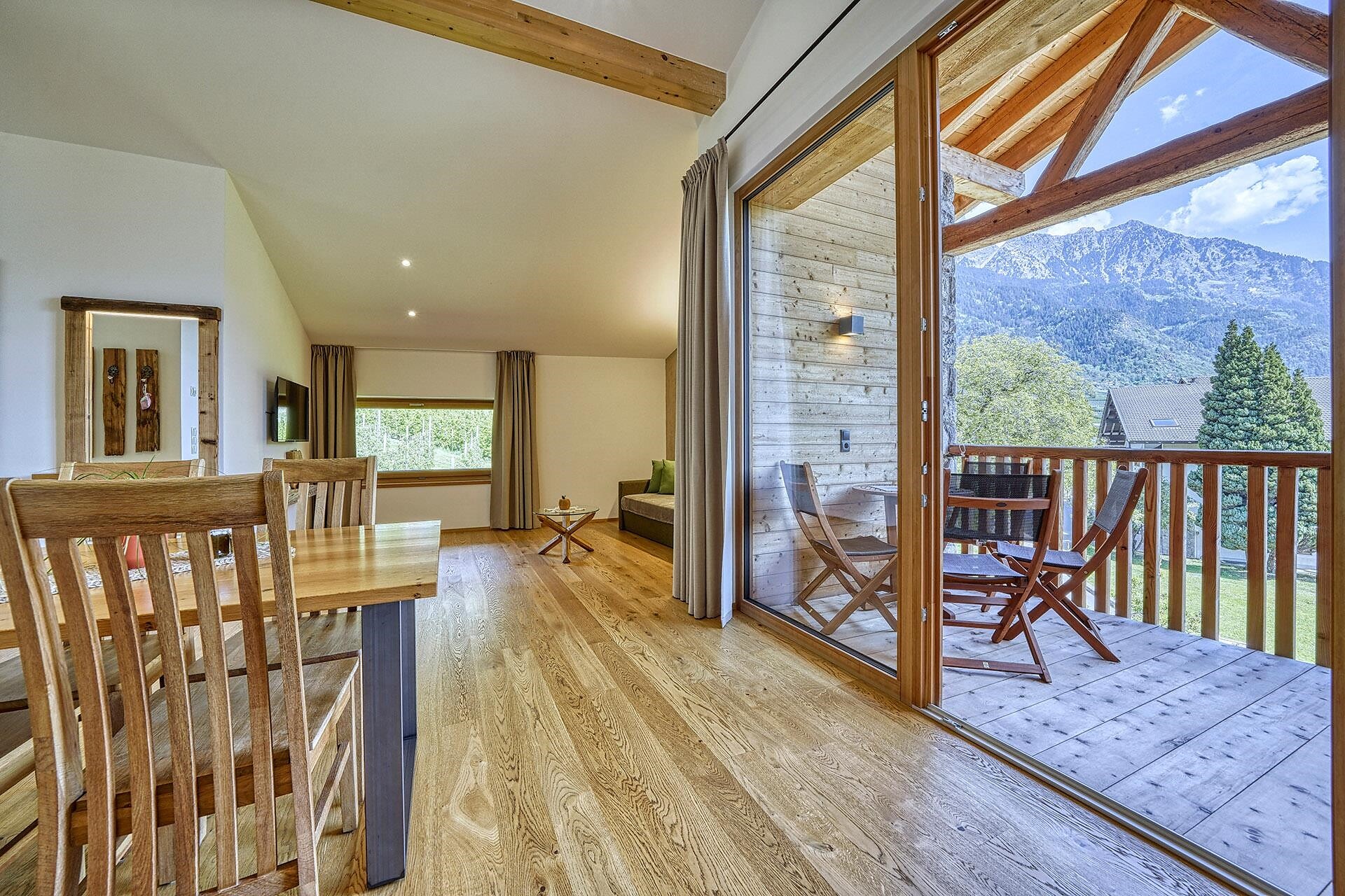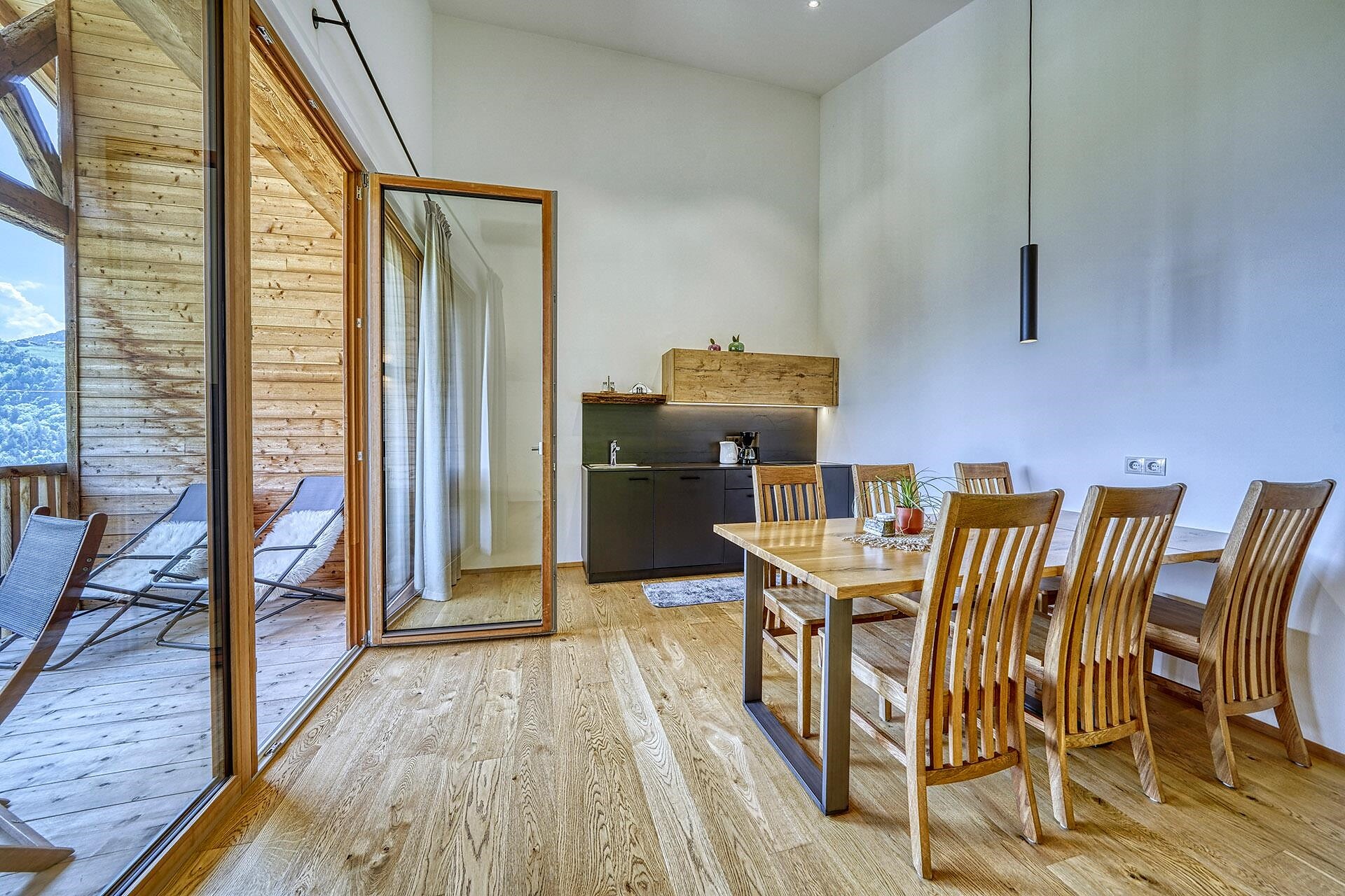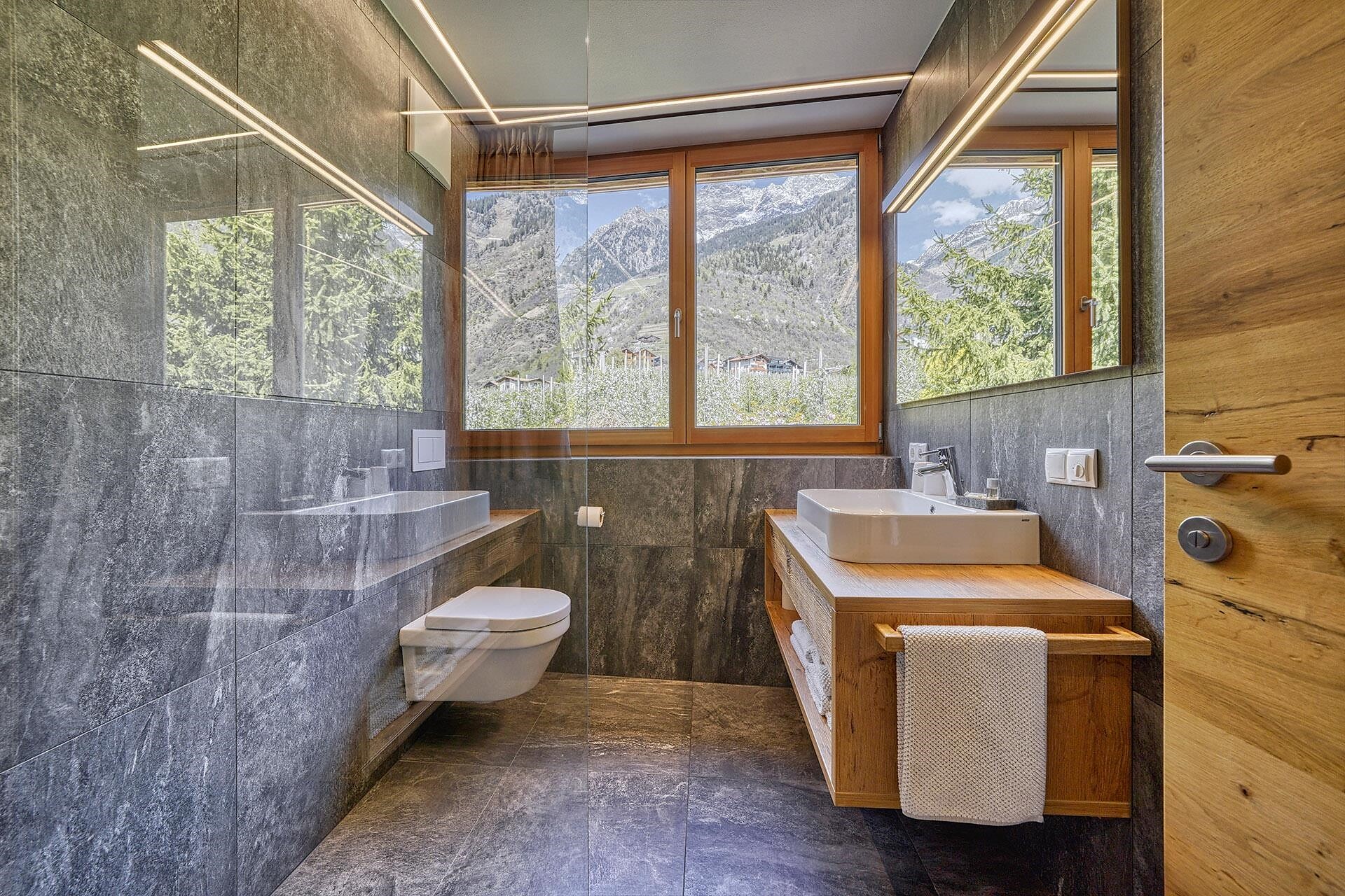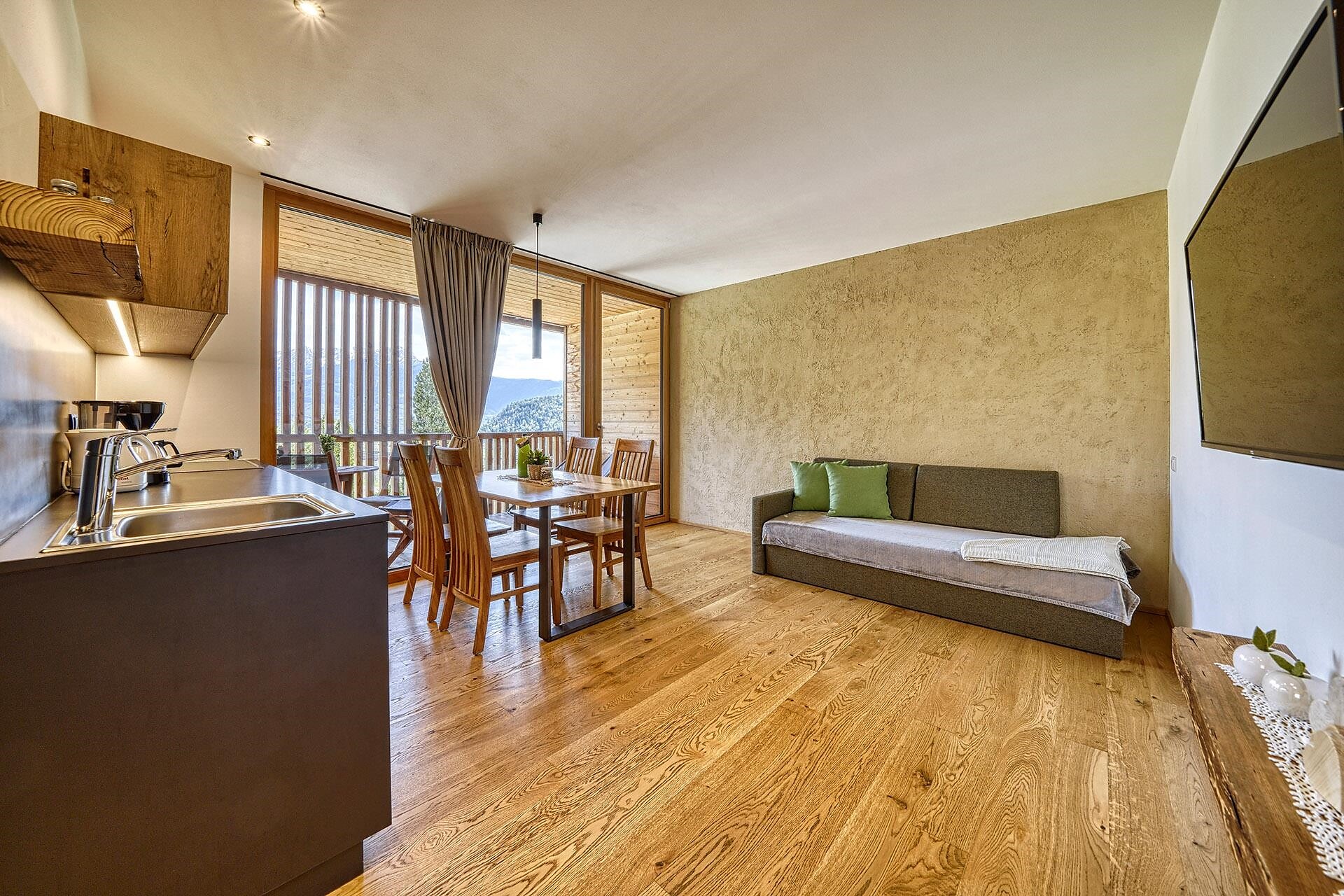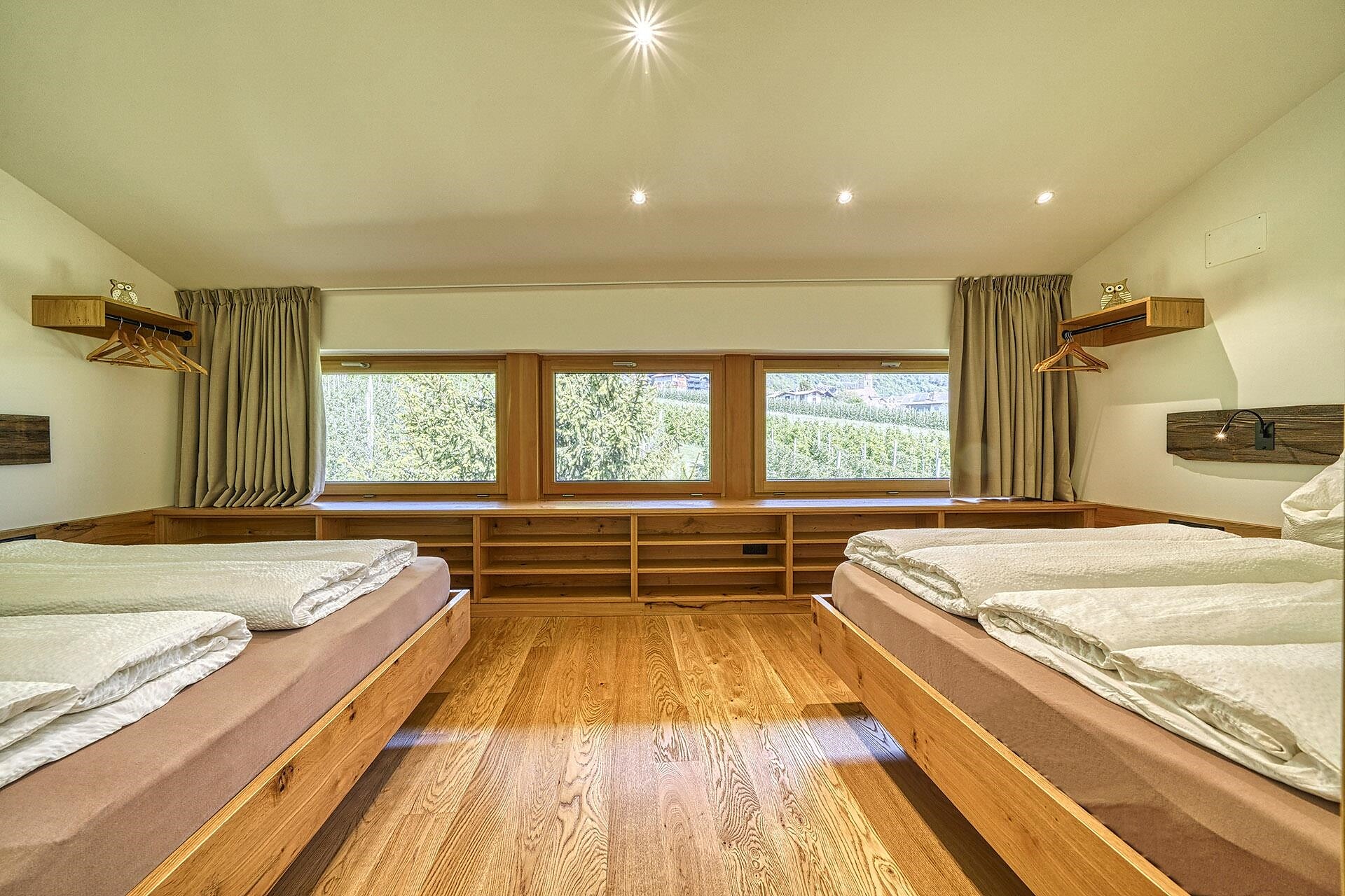 The dreamy "Epflplua" (South Tyrolean apple blossom) is located on the ground floor of our barn and offers 2 separate sleeping areas (a bedroom with a double bed and a bedroom with a double bed), floor-to-ceiling window facades facing south and a wonderful panoramic south-facing balcony (approx. 10 m²) a very special holiday experience.