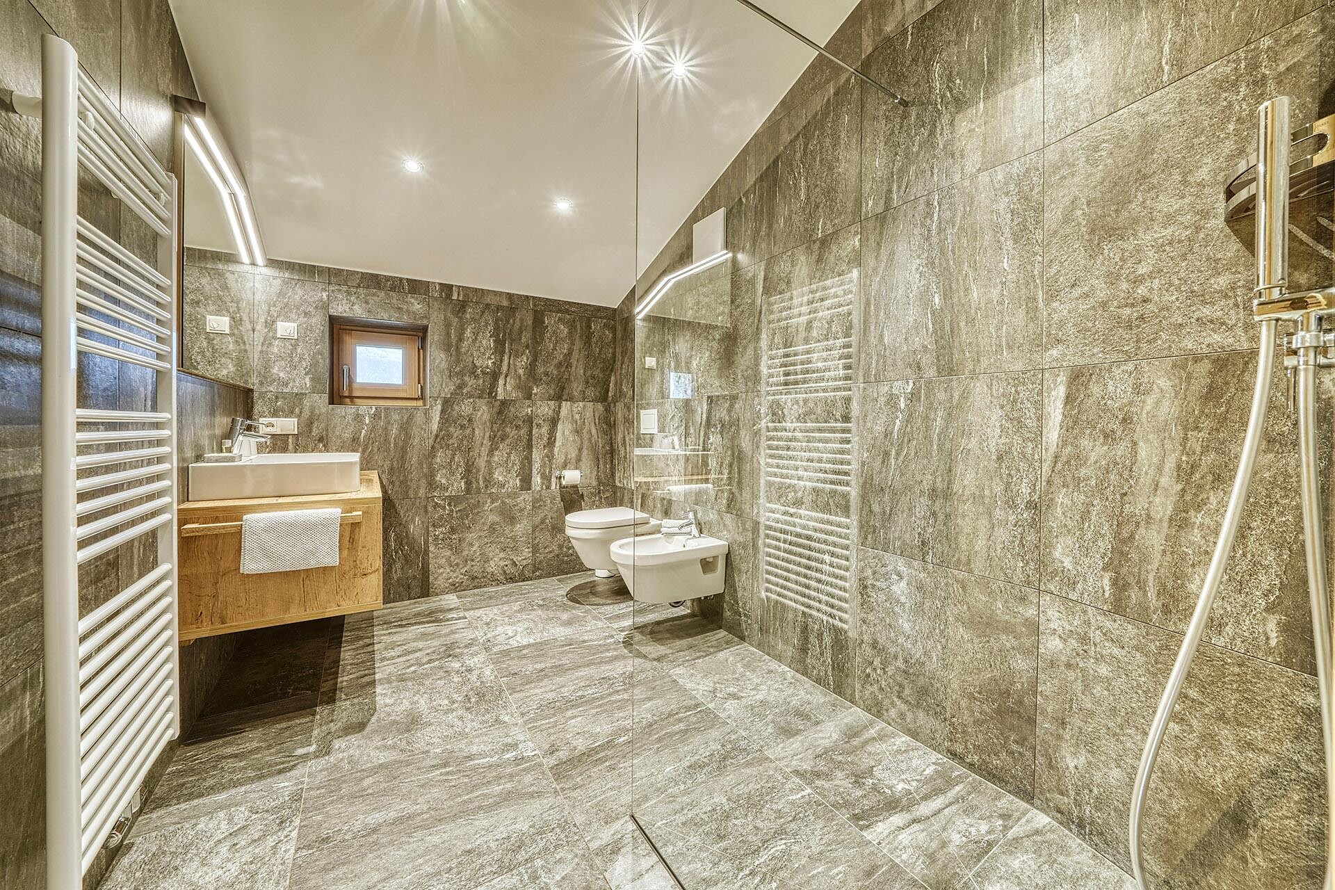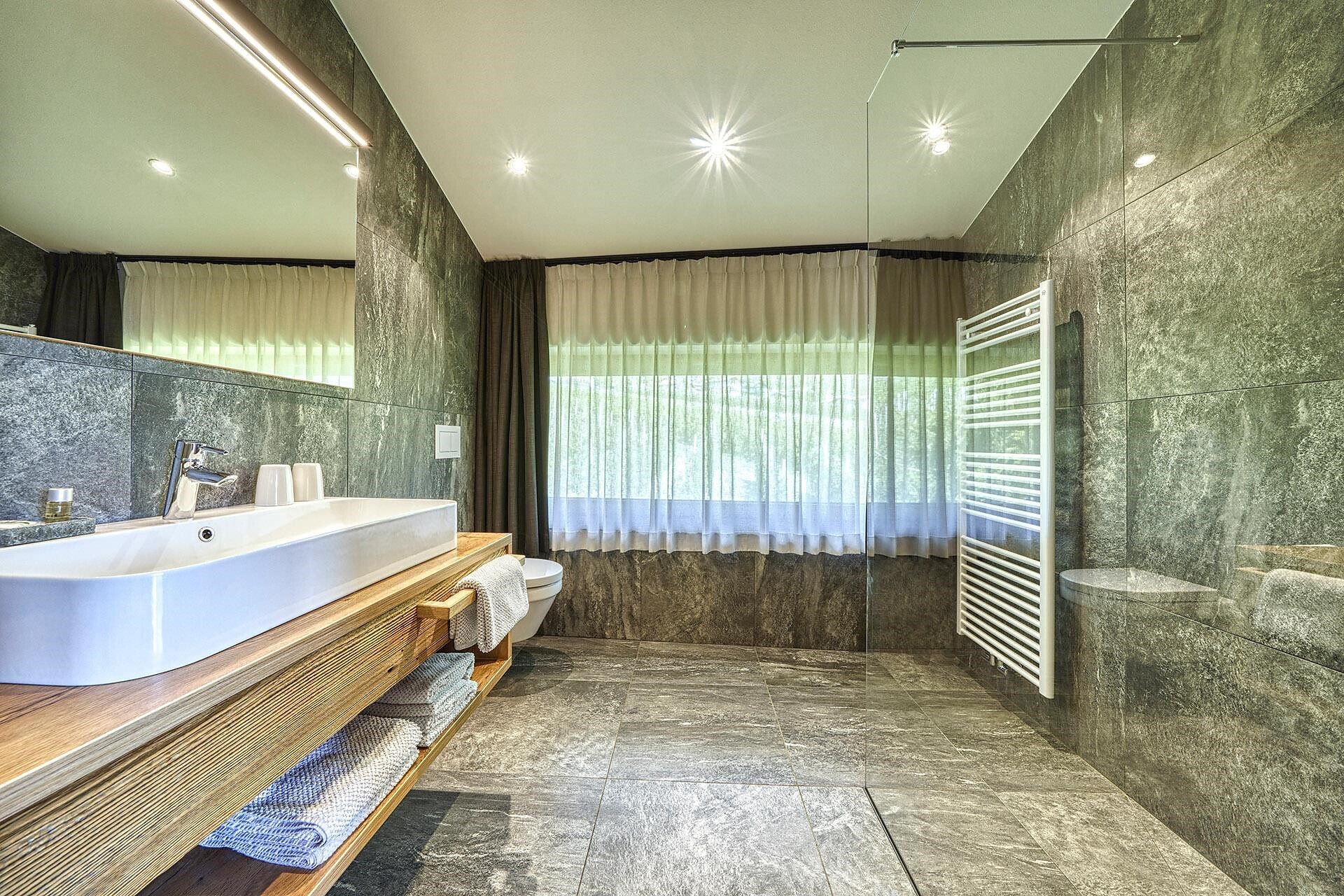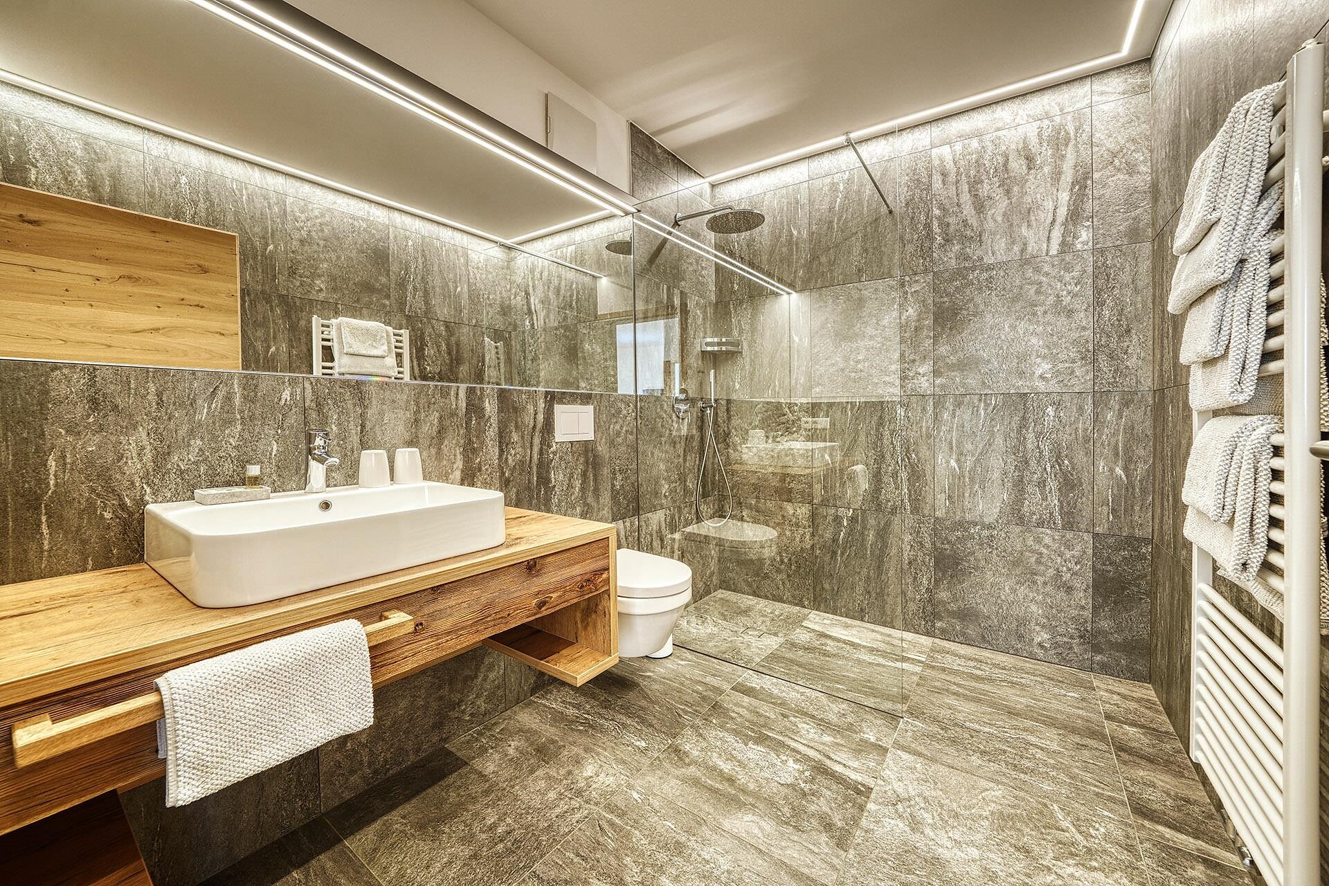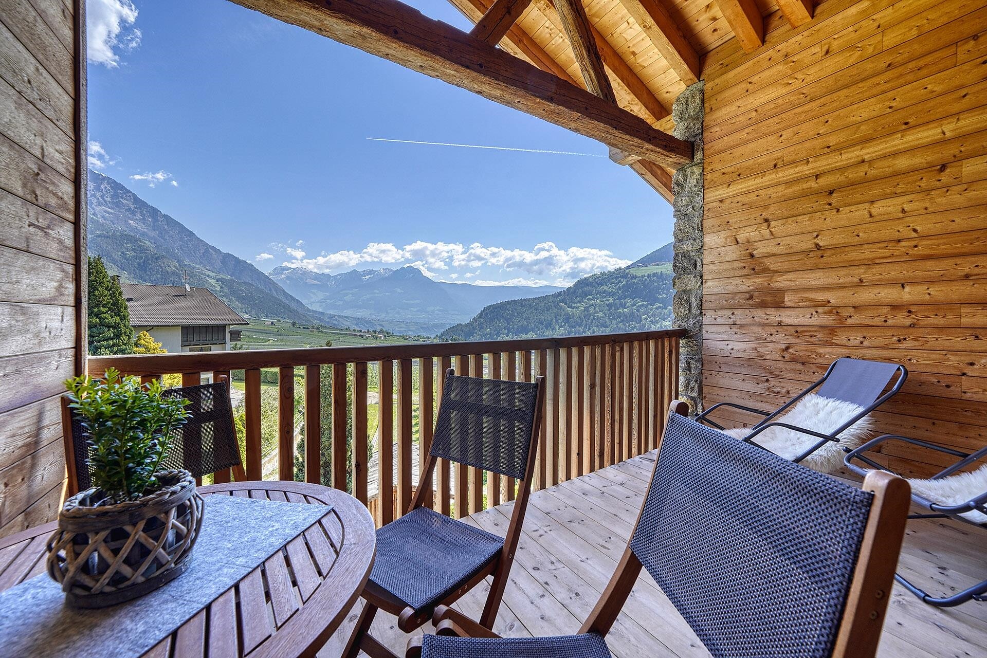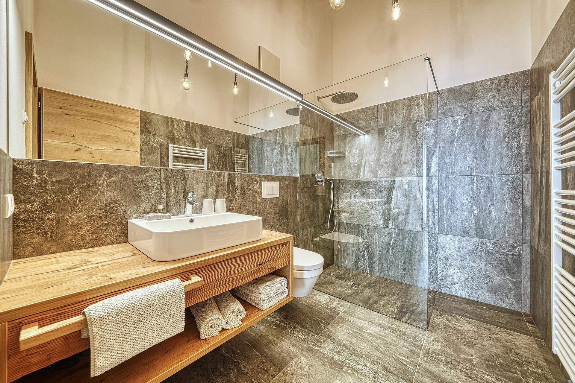 The dreamy "Epflplua" (South Tyrolean apple blossom) is located on the ground floor of our barn and offers 2 separate sleeping areas (a bedroom with a double bed and a bedroom with a double bed), floor-to-ceiling window facades facing south and a wonderful panoramic south-facing balcony (approx. 10 m²) a very special holiday experience.