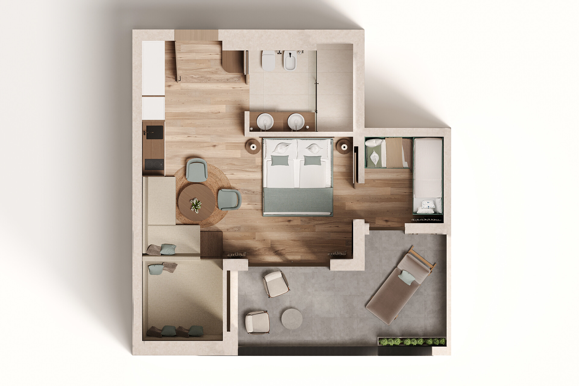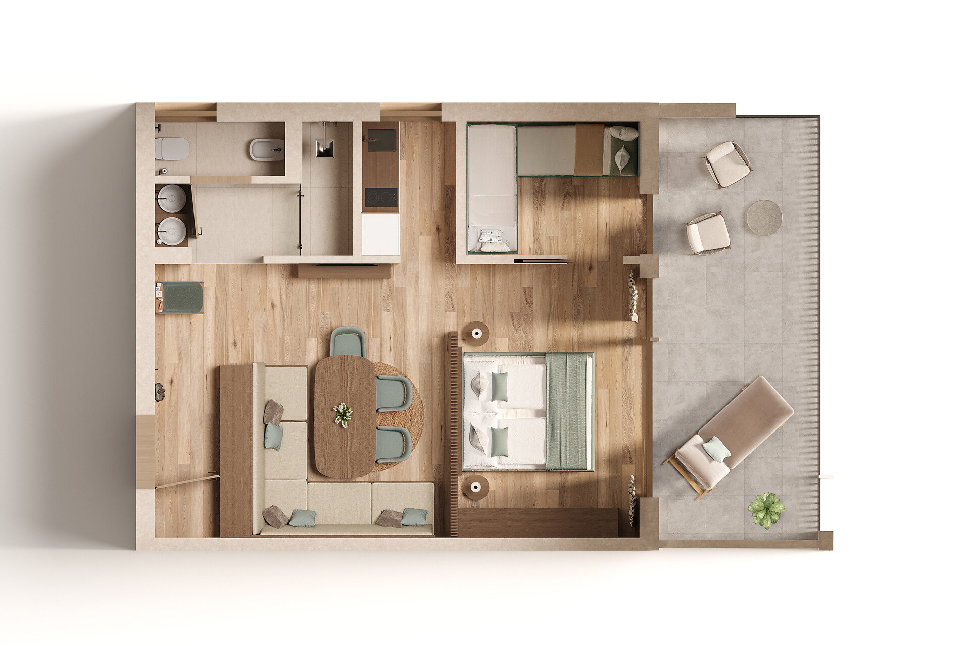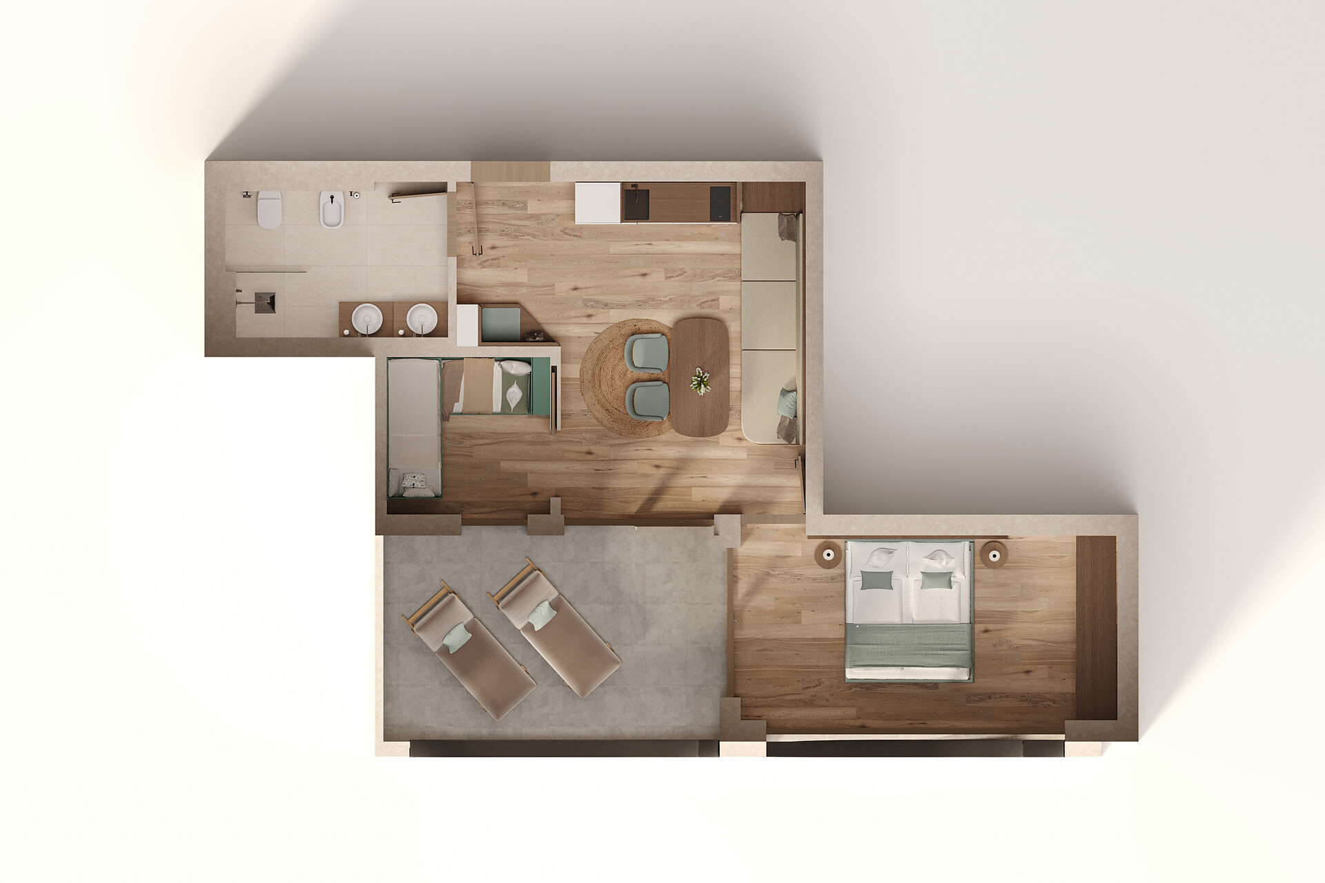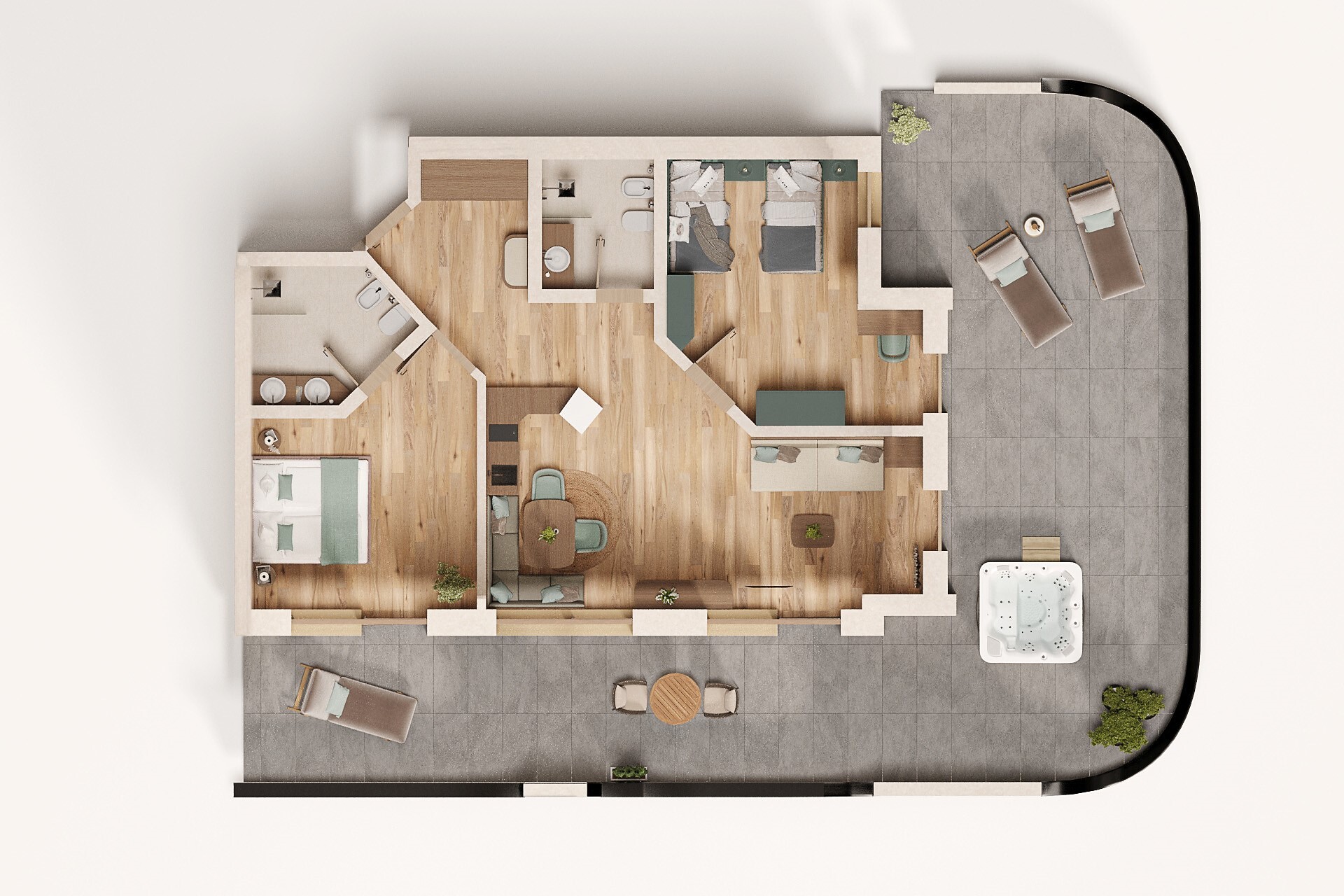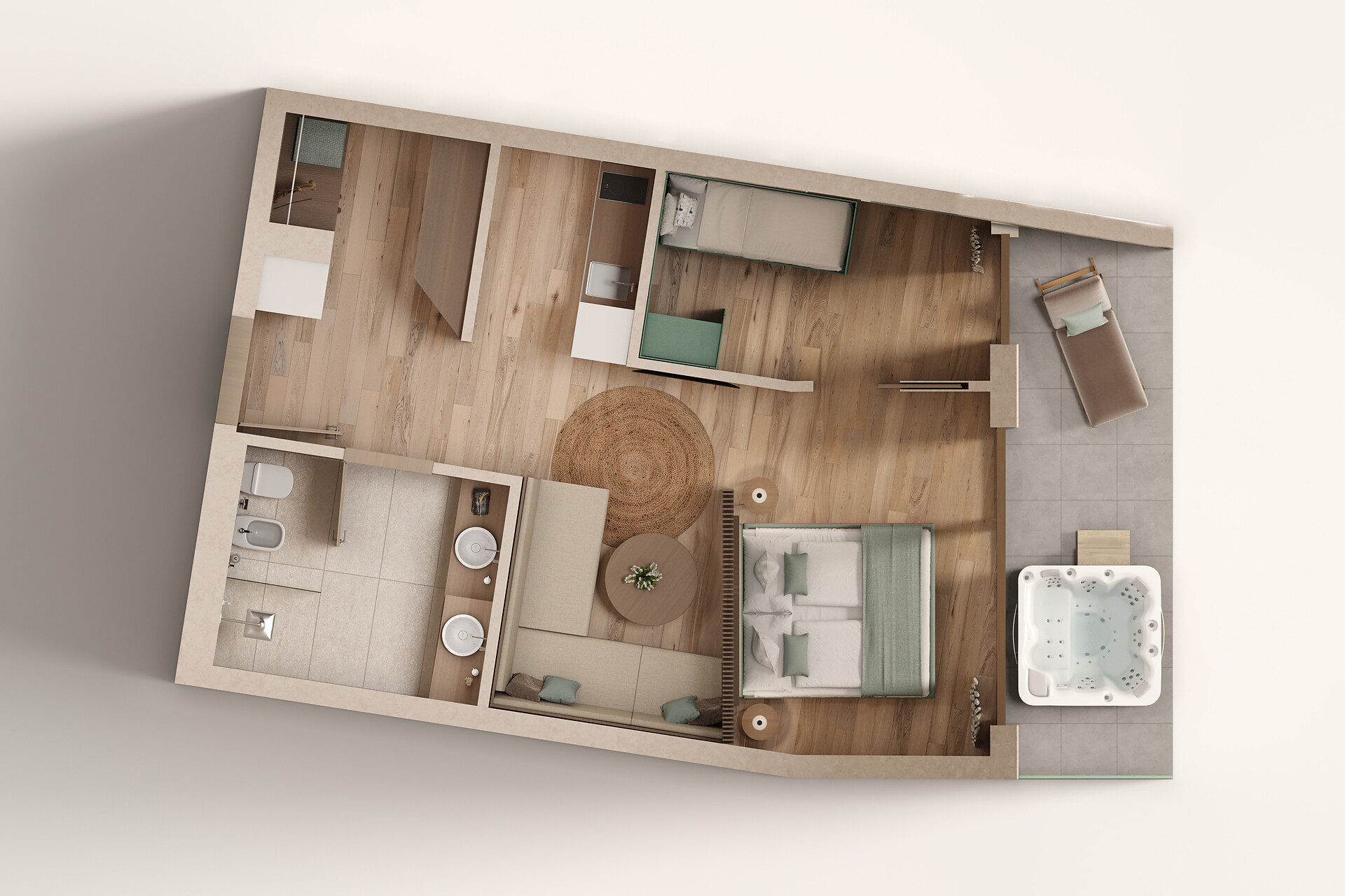 Kitchen with dining area and table, microwave, Nespresso machine, kettle, dishwasher, sofa, safe, 1 satellite TV, free Wi-Fi, bathrobes, towels, wellness bag with bath towels, 2 bathrooms with shower, toilet, bidet, children’s sink, hairdryer, bedroom with double bed, bedroom with 2 beds, spacious balcony with hot tub and sun loungers.