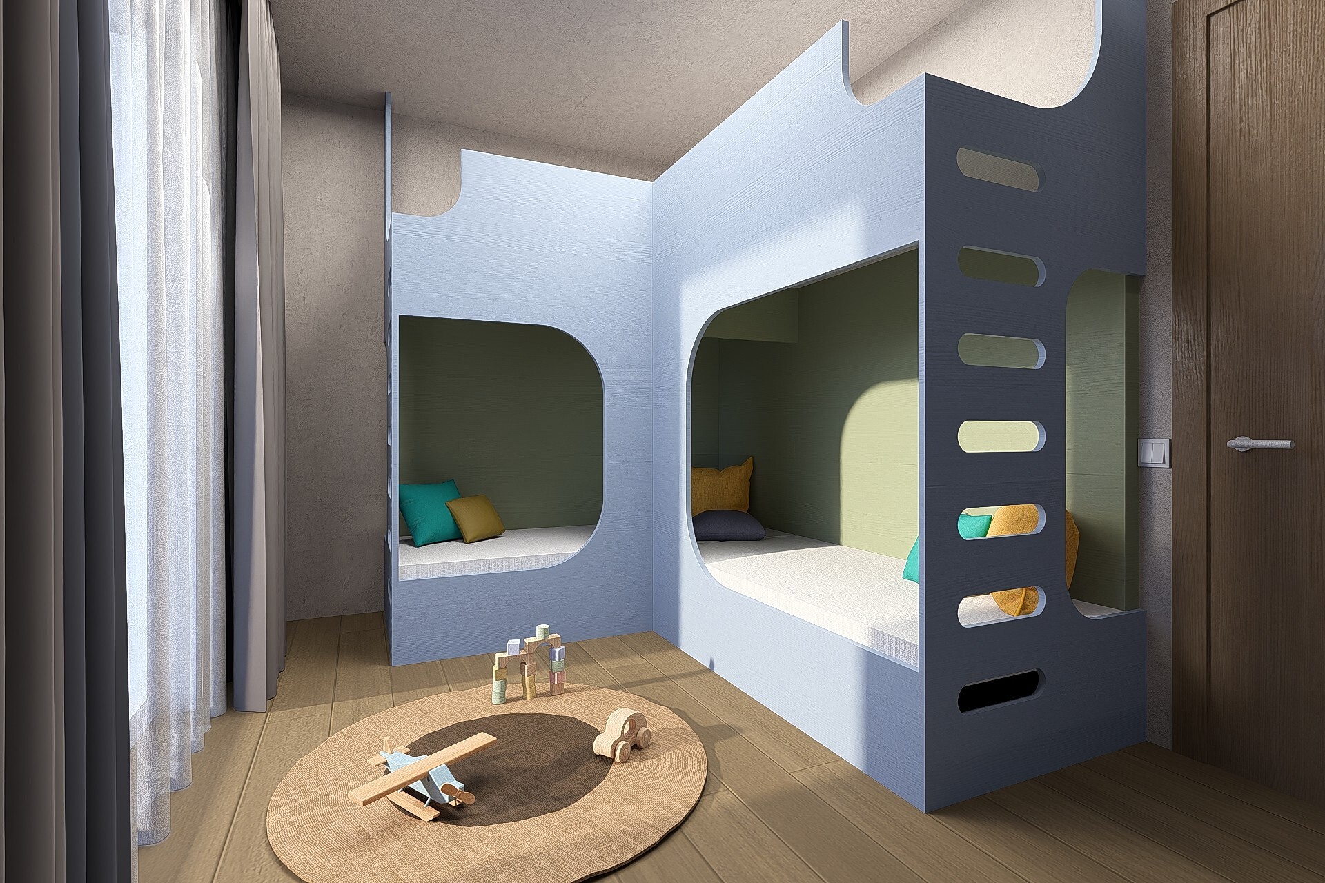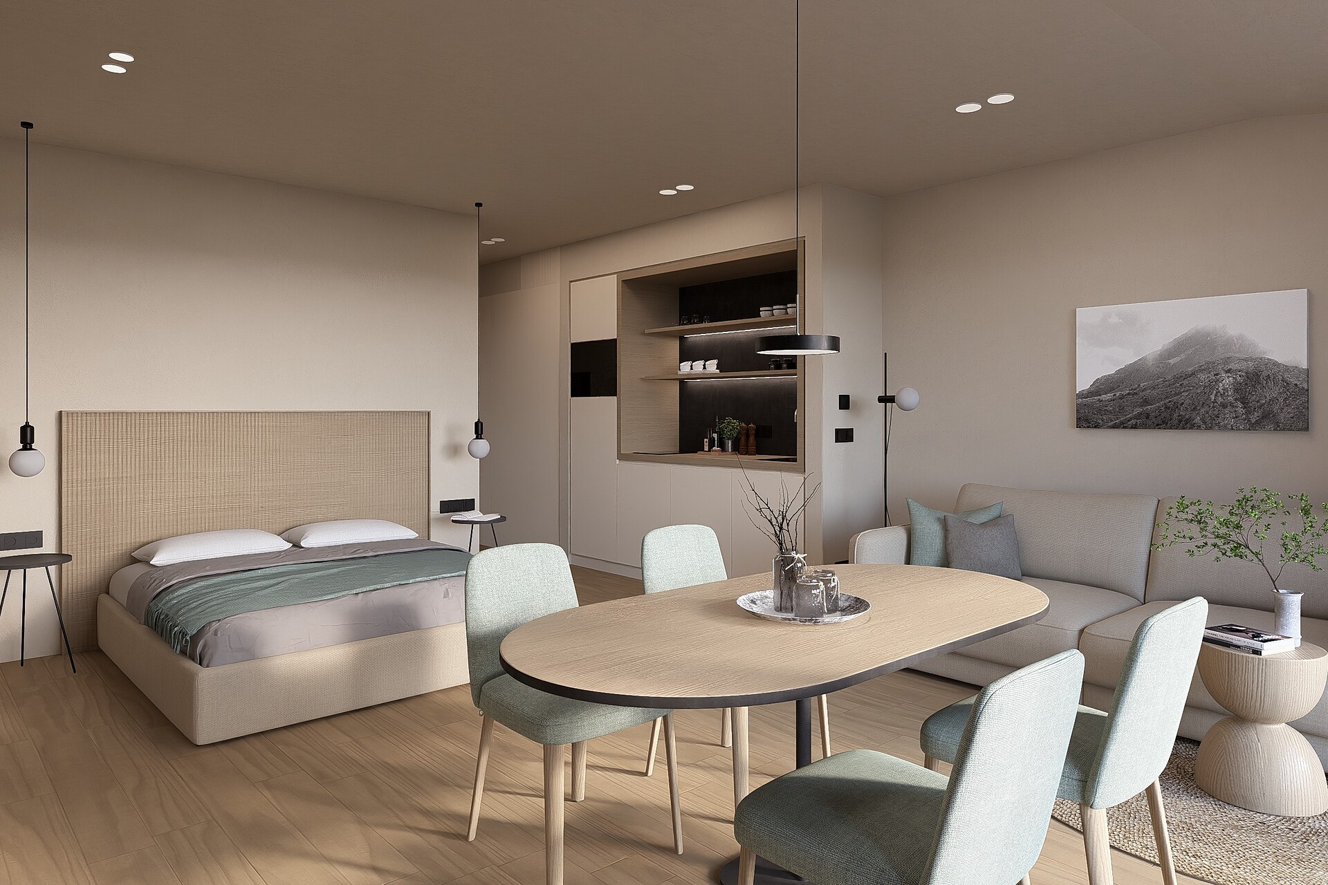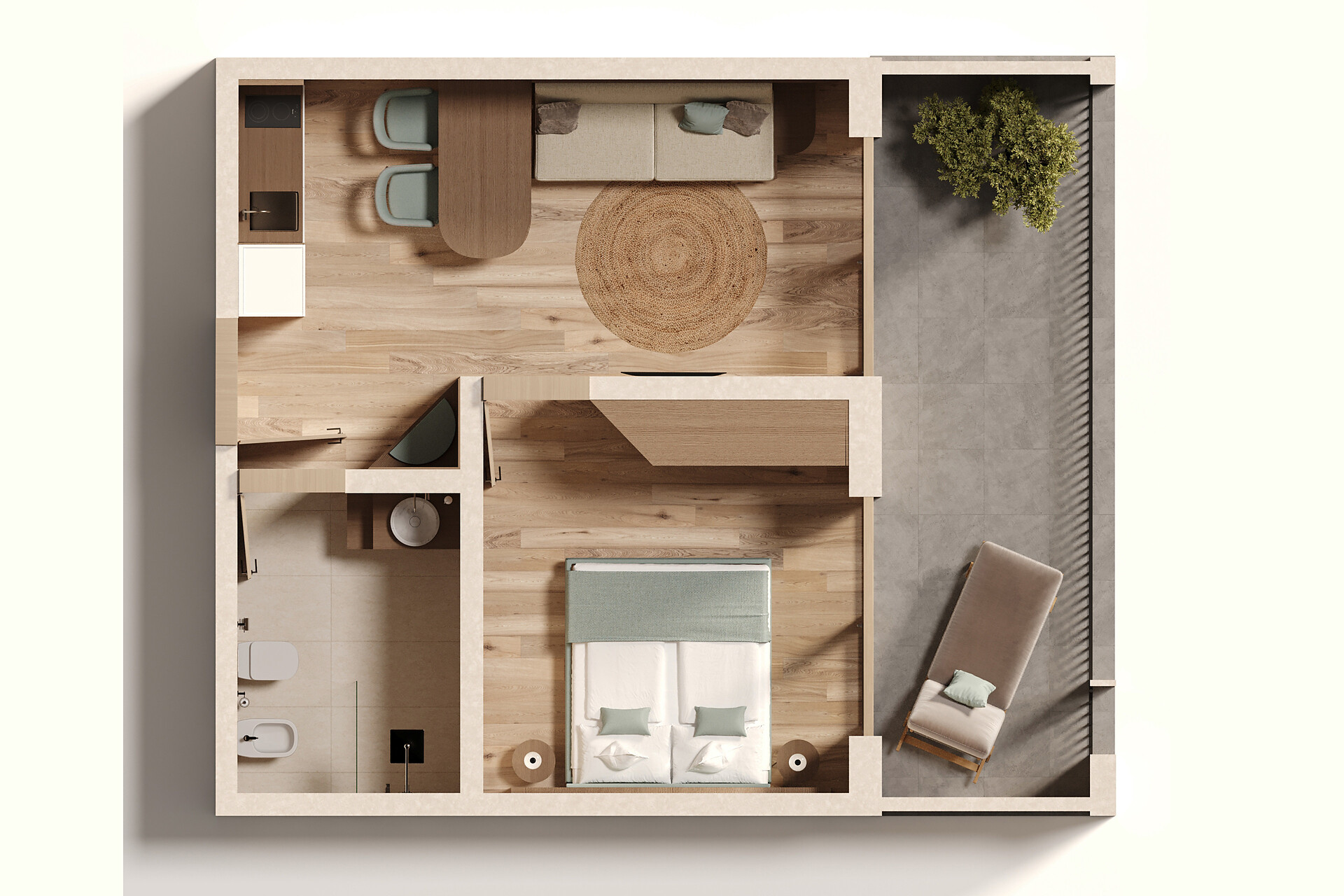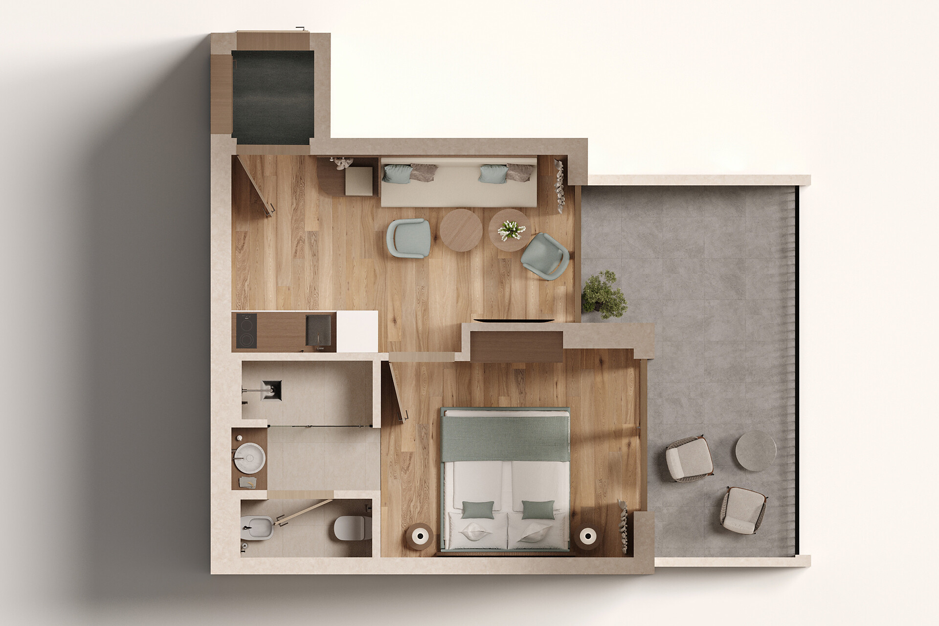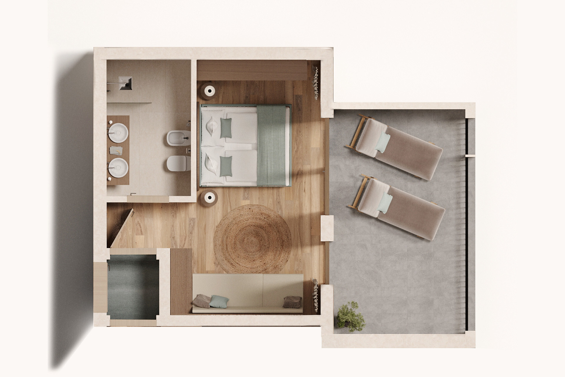 Kitchen with dining area and table, microwave, Nespresso machine, kettle, dishwasher, sofa, safe, 1 satellite TV, free Wi-Fi, bathrobes, towels, wellness bag with bath towels, 2 bathrooms with shower, toilet, bidet, children’s sink, hairdryer, bedroom with double bed, bedroom with 2 beds, spacious balcony with hot tub and sun loungers.