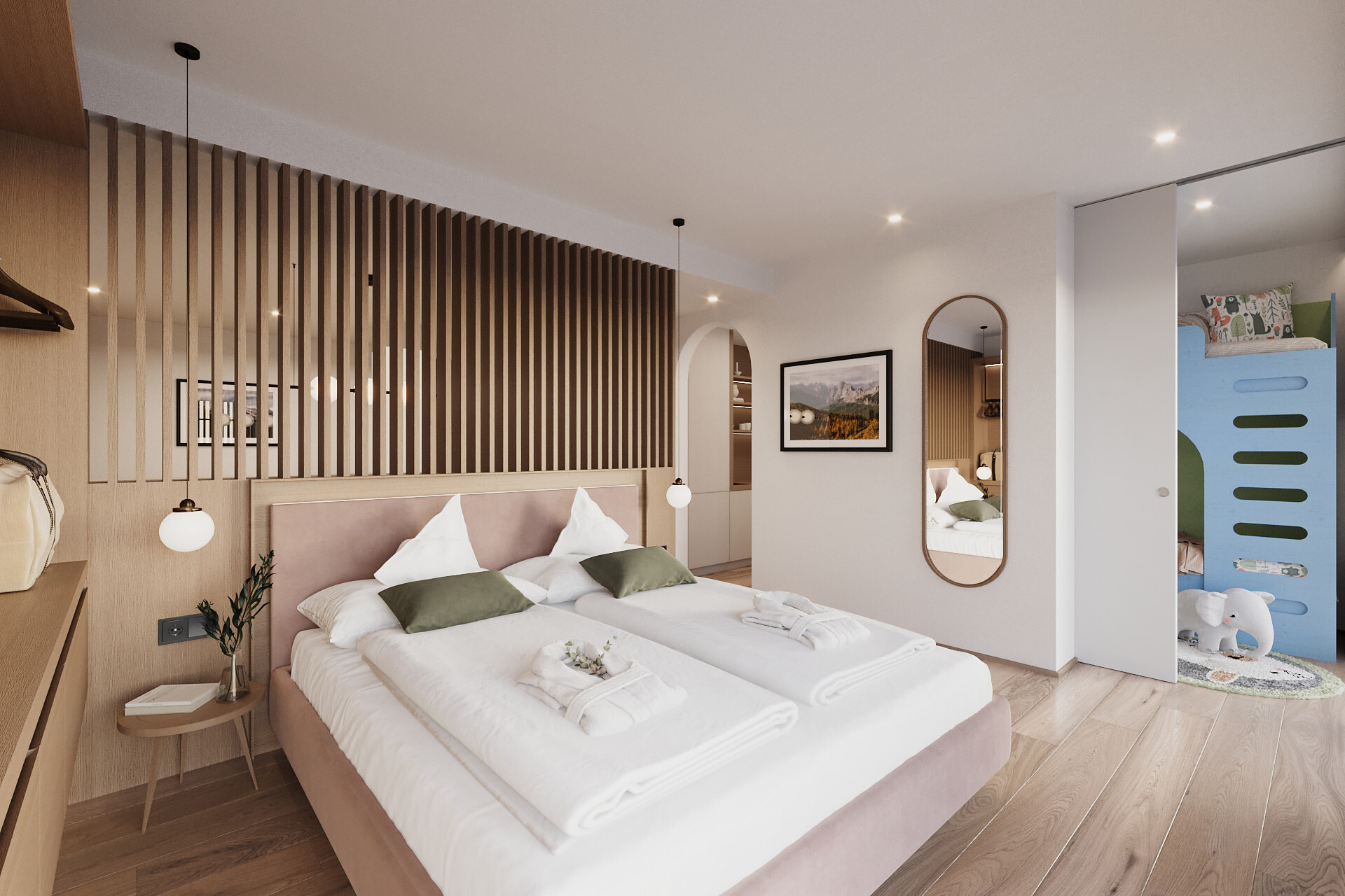 Kitchen with dining area and table, microwave, Nespresso machine, kettle, dishwasher, sofa, safe, 1 satellite TV, free Wi-Fi, bathrobes, towels, wellness bag with bath towels, 2 bathrooms with shower, toilet, bidet, children’s sink, hairdryer, bedroom with double bed, bedroom with 2 beds, spacious balcony with hot tub and sun loungers.