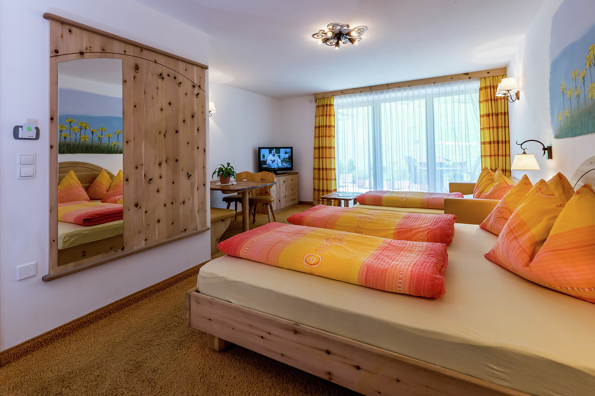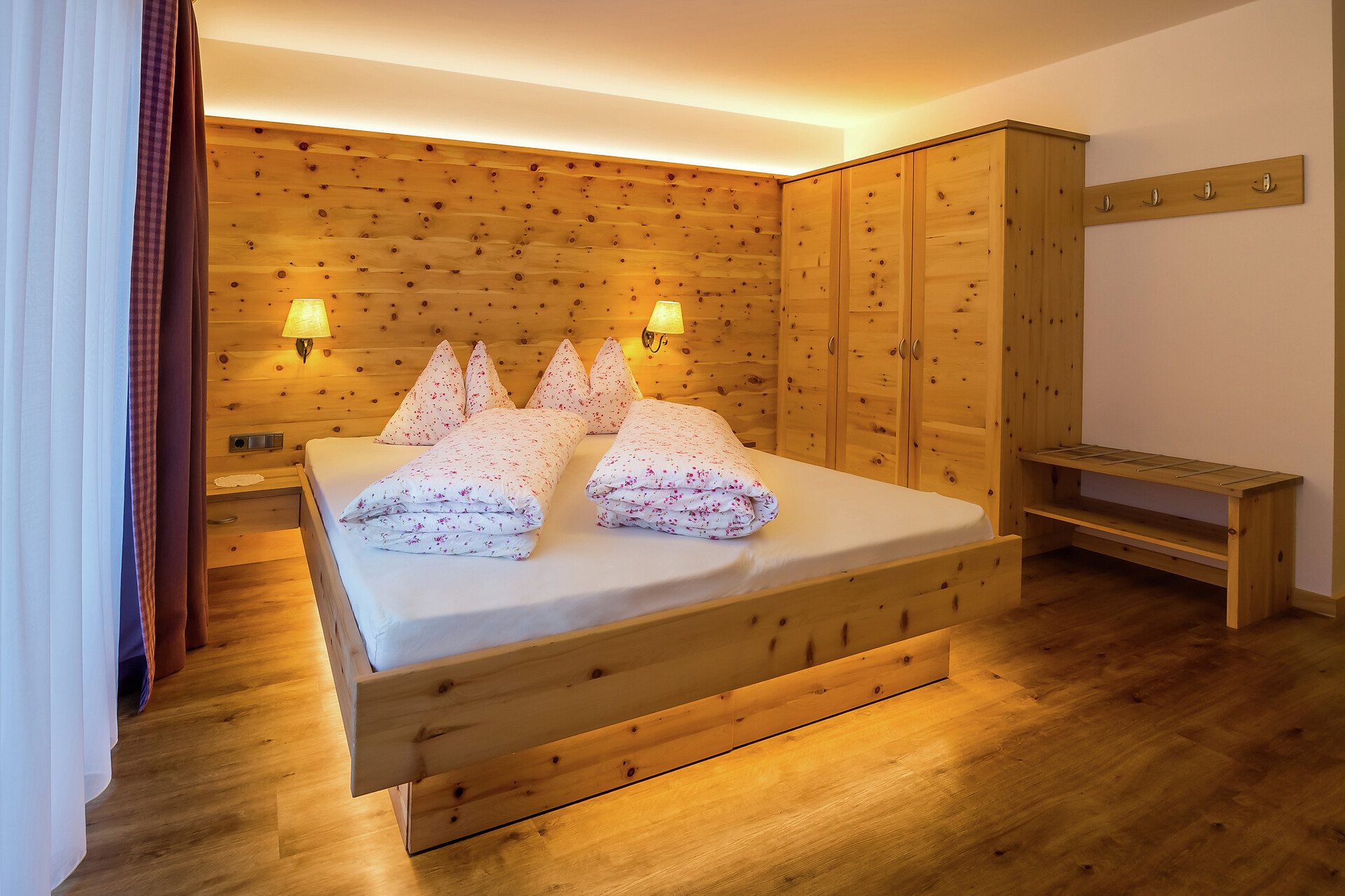 Juniorsuite Comfort-room "Arnika" (36 sqm, 2-5 sleepes) impresses through its solid wood furniture compounded of zirm and nut.
