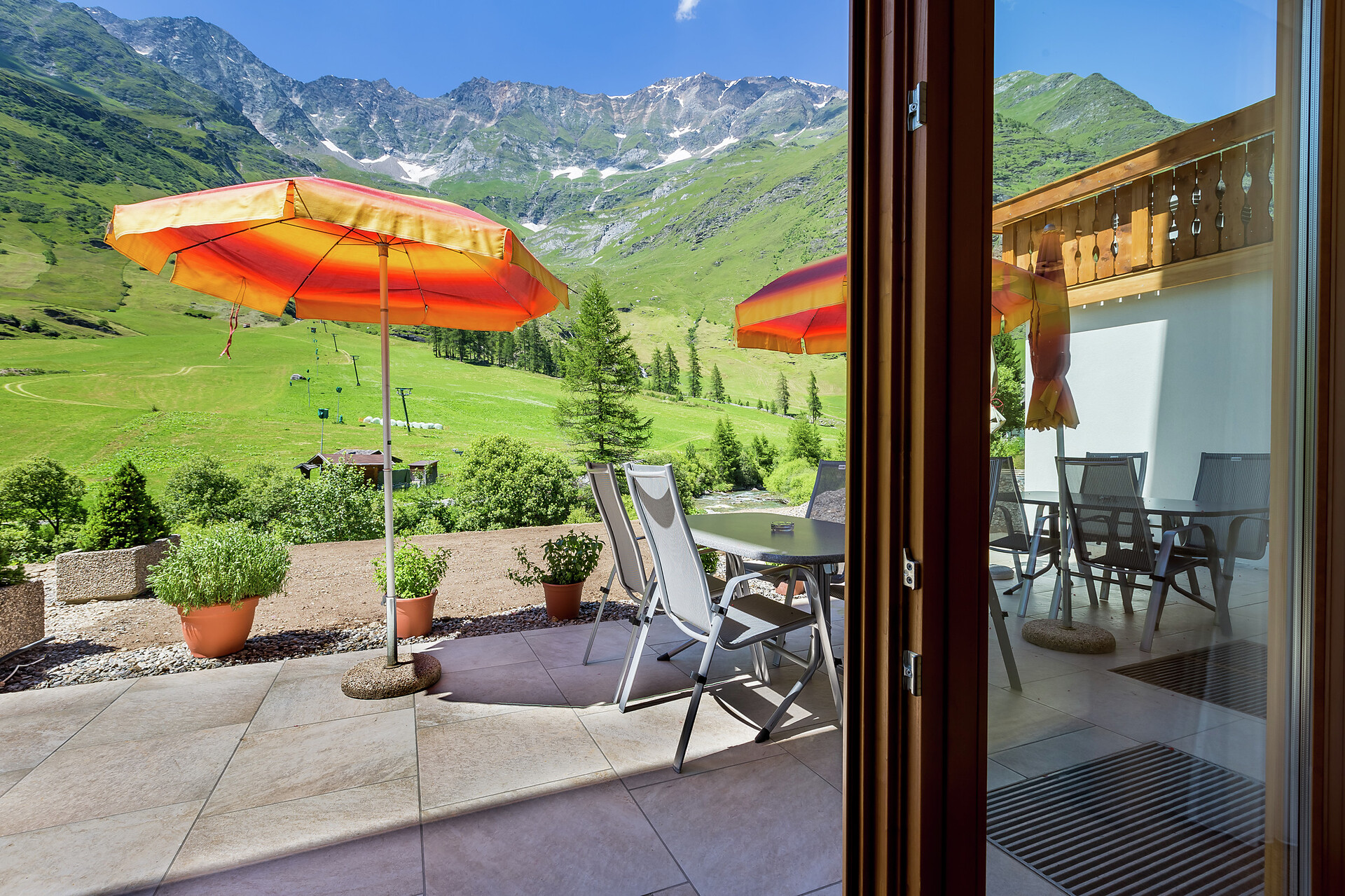 The spacious terrace offers a fascinating view onto the wonderful alpine world of Pfelders.