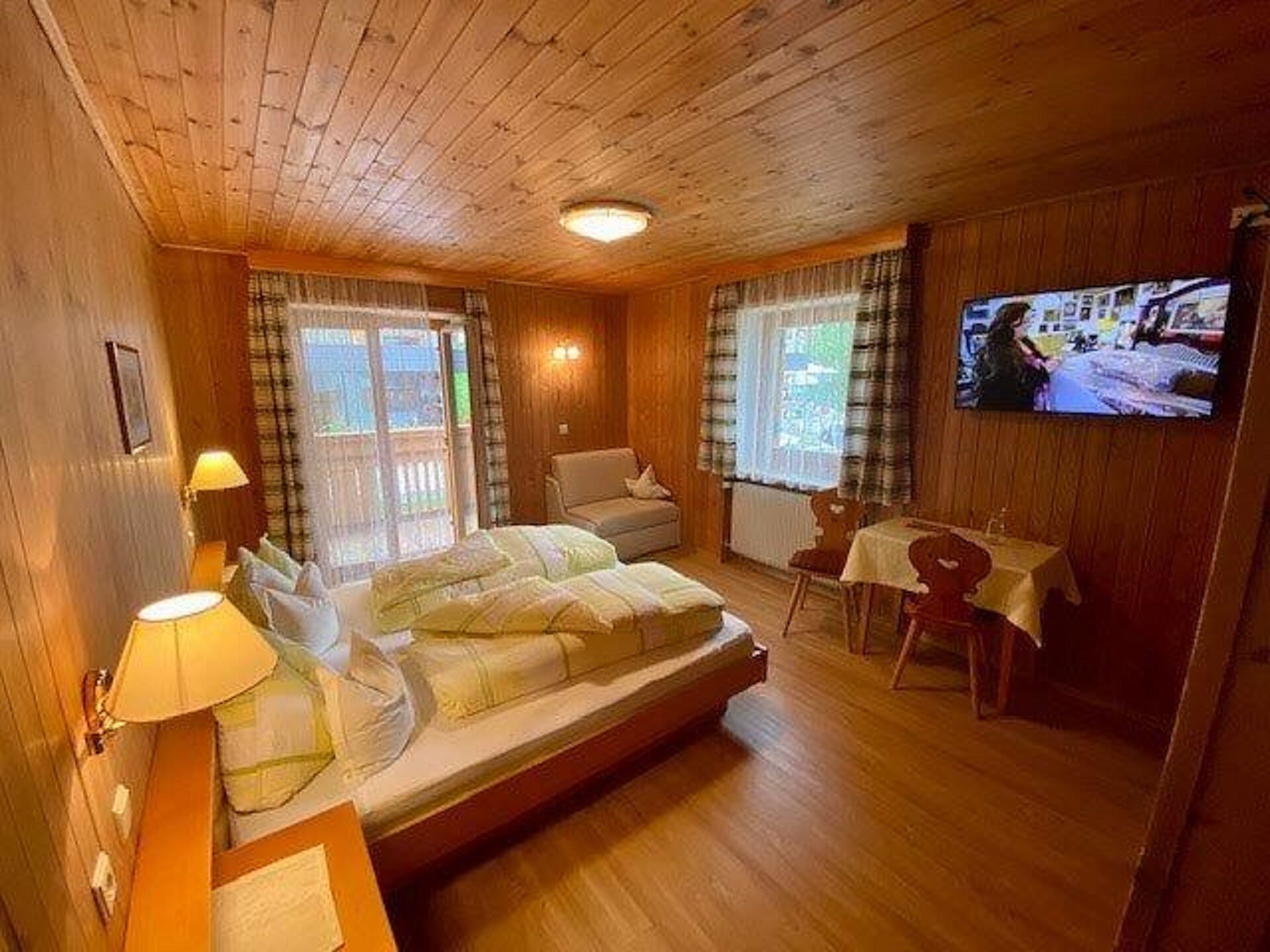 the room "Alpenveilchen" (22qm, 2-3 sleeps) with big seating corner, furniture in Swiss stone pine wood and nut wood for a healthy sleep. Panoramic balcony with view of sunrise and village-forest.
