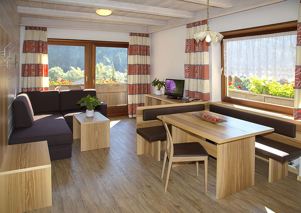 Comforts, peaceful position, intact nature and plenty space where you can relax: a holiday you will love! Spacious and well-furnished apartments for 2 to 5 people, all with bathtub/shower, WC, TV, safe, telephone, complete kitchen, bed/table linen and terrace or balcony. Elevator, sauna, swimming pool, Ping-Pong table and lawn for sunbathing. In the near vicinity to stables, tennis courts, golf courses, 20 km of cycle paths and the Hirzer cableway taking you up into the heart of marvelous mountains.