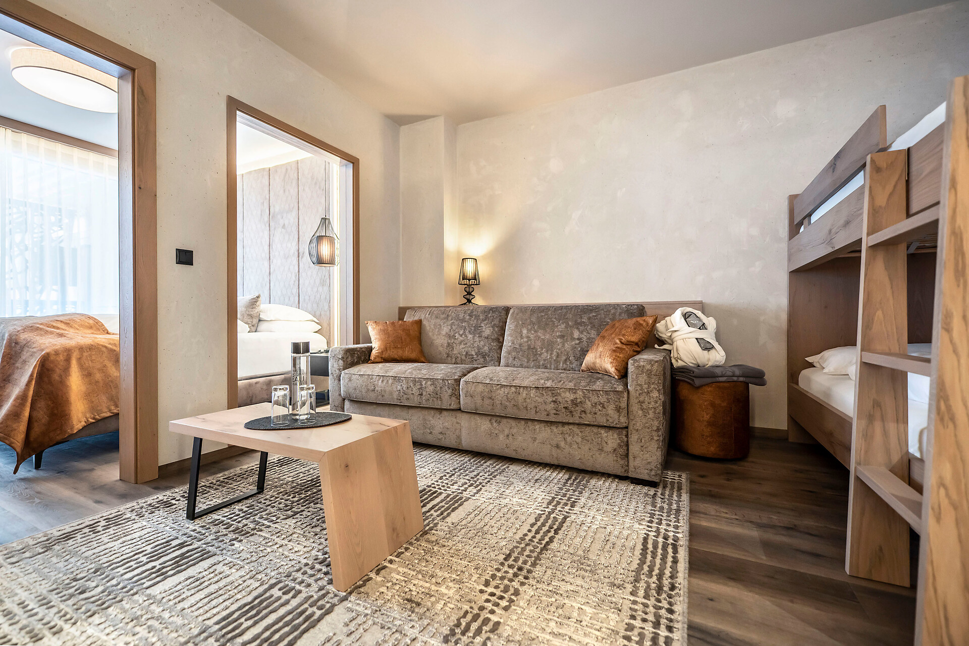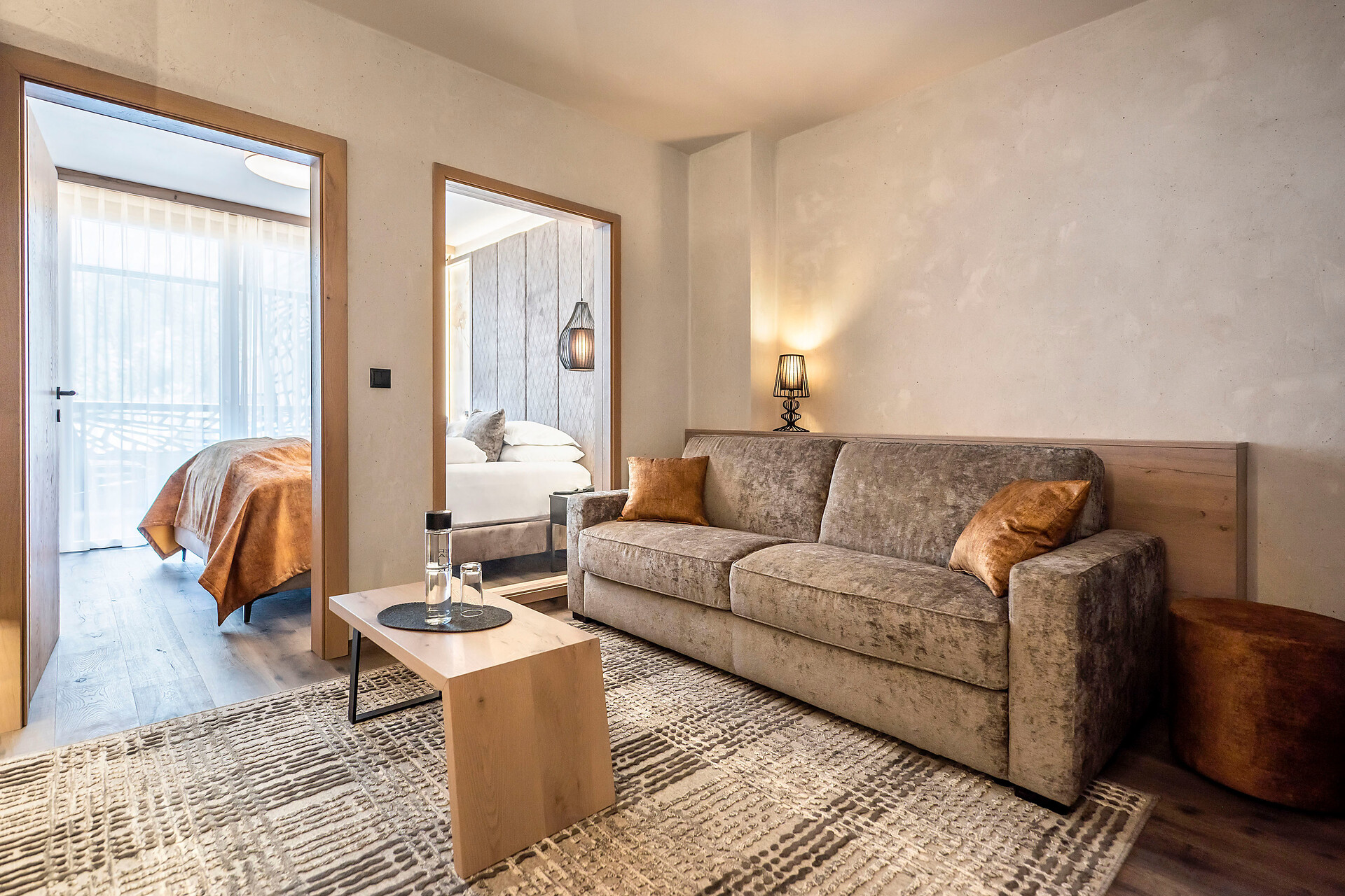 for 2-4 guests, approx. 60m² (including a 12m² loggia). Bedroom/living area with pull-out couch and separate cosy corner, bathroom with shower, some rooms with extra toilet, south-facing balcony or ground-floor terrace. Underground parking under the tennis courts included.