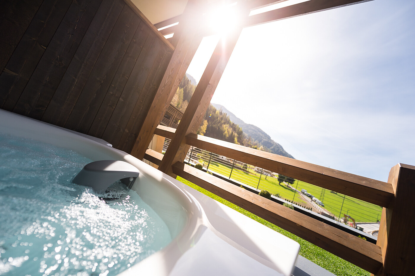 Mini Penthouse Suite (2-4 guest), ca. 85m² including 35m² balcony and terrace with Whirlpool and sauna, suite in stone pine with open bathroom with view of room, bath tub, cosy bed with scenic view, starry sky, Espresso machine.