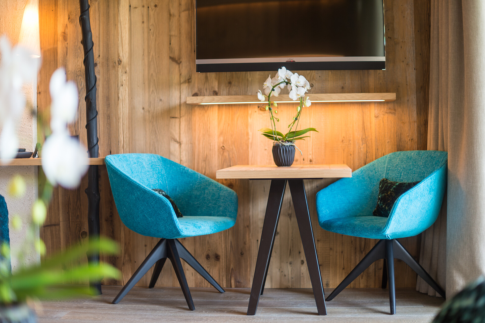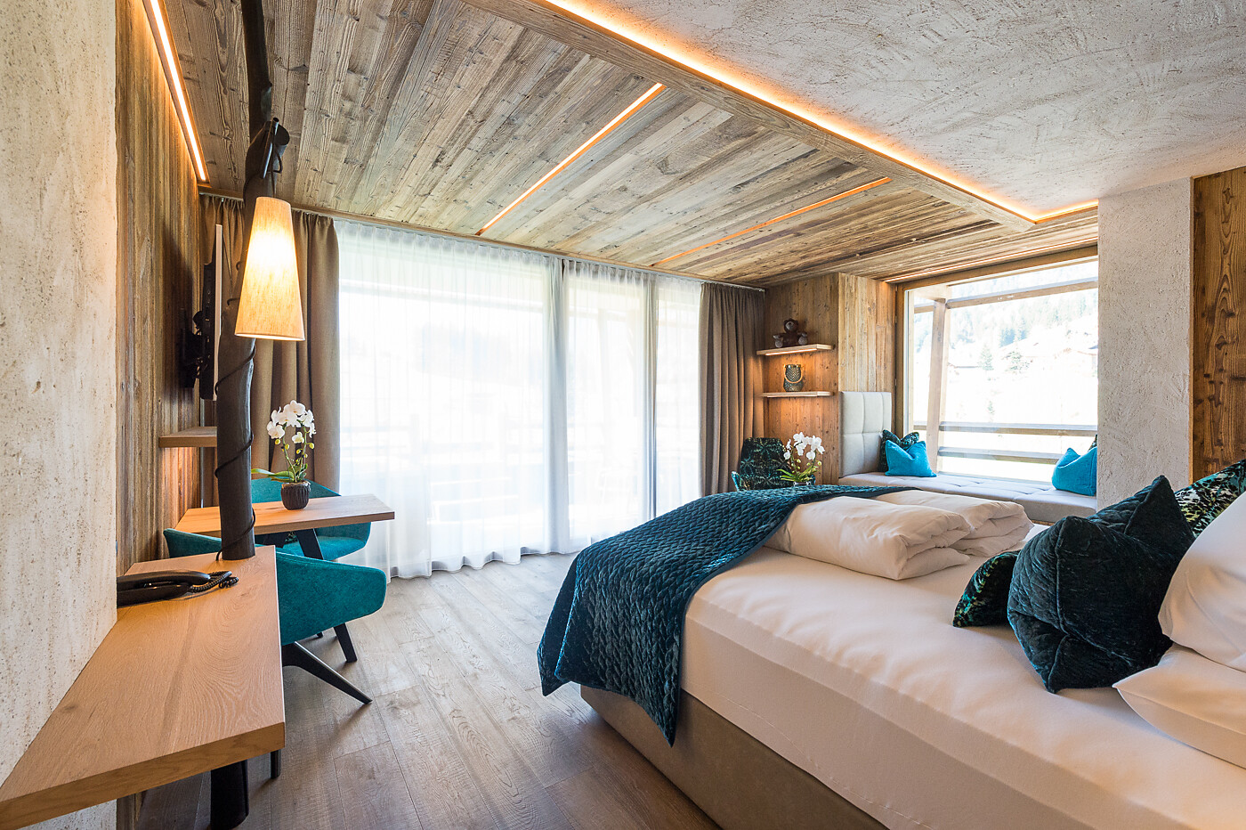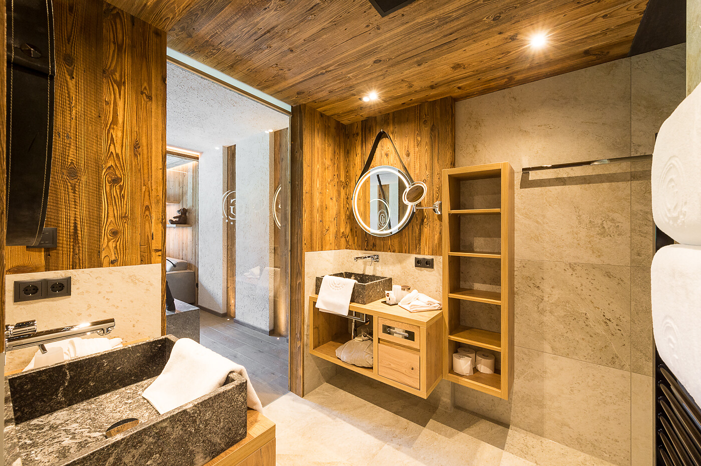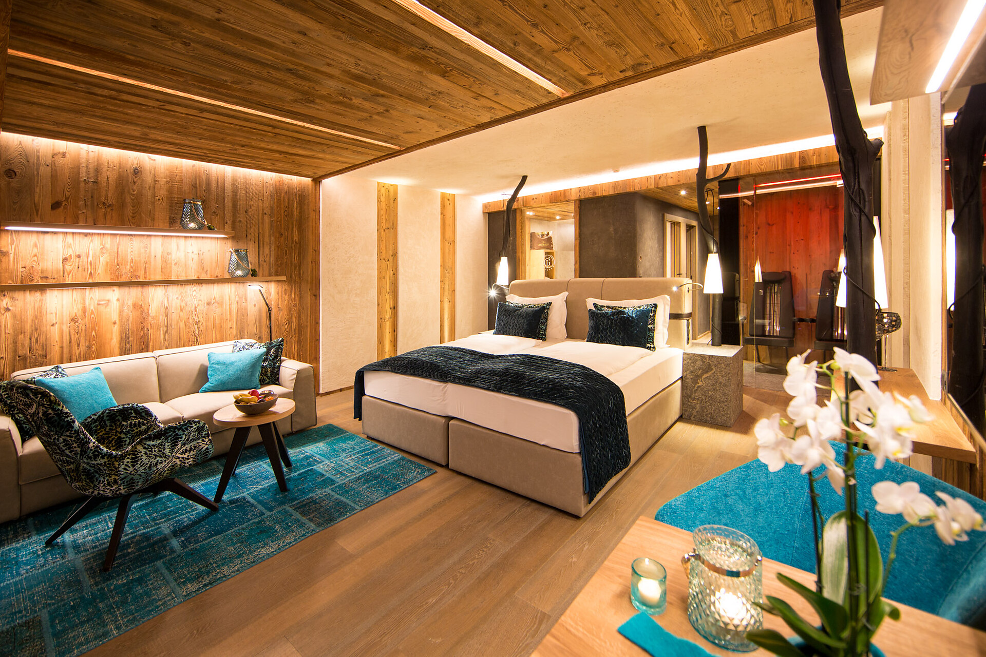 Vital Suite (2-4 guests) - ca. 87m², including 27m² balcony or terrace as the case may be, honeymoon suite in maple with separate bedroom, open fireplace wiht relaxation lounger, Espresso machine, open bathroom wiht infra-red cabin, whirl tub and make-up corner, starry sky