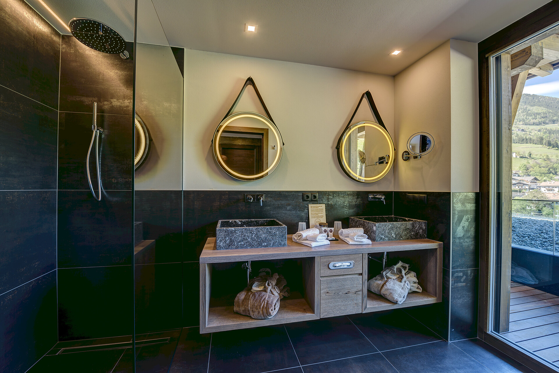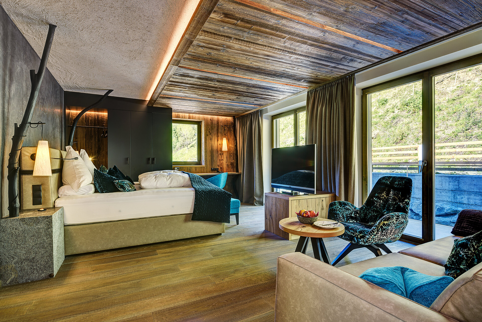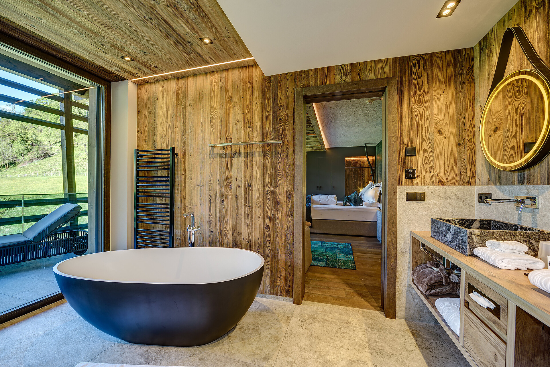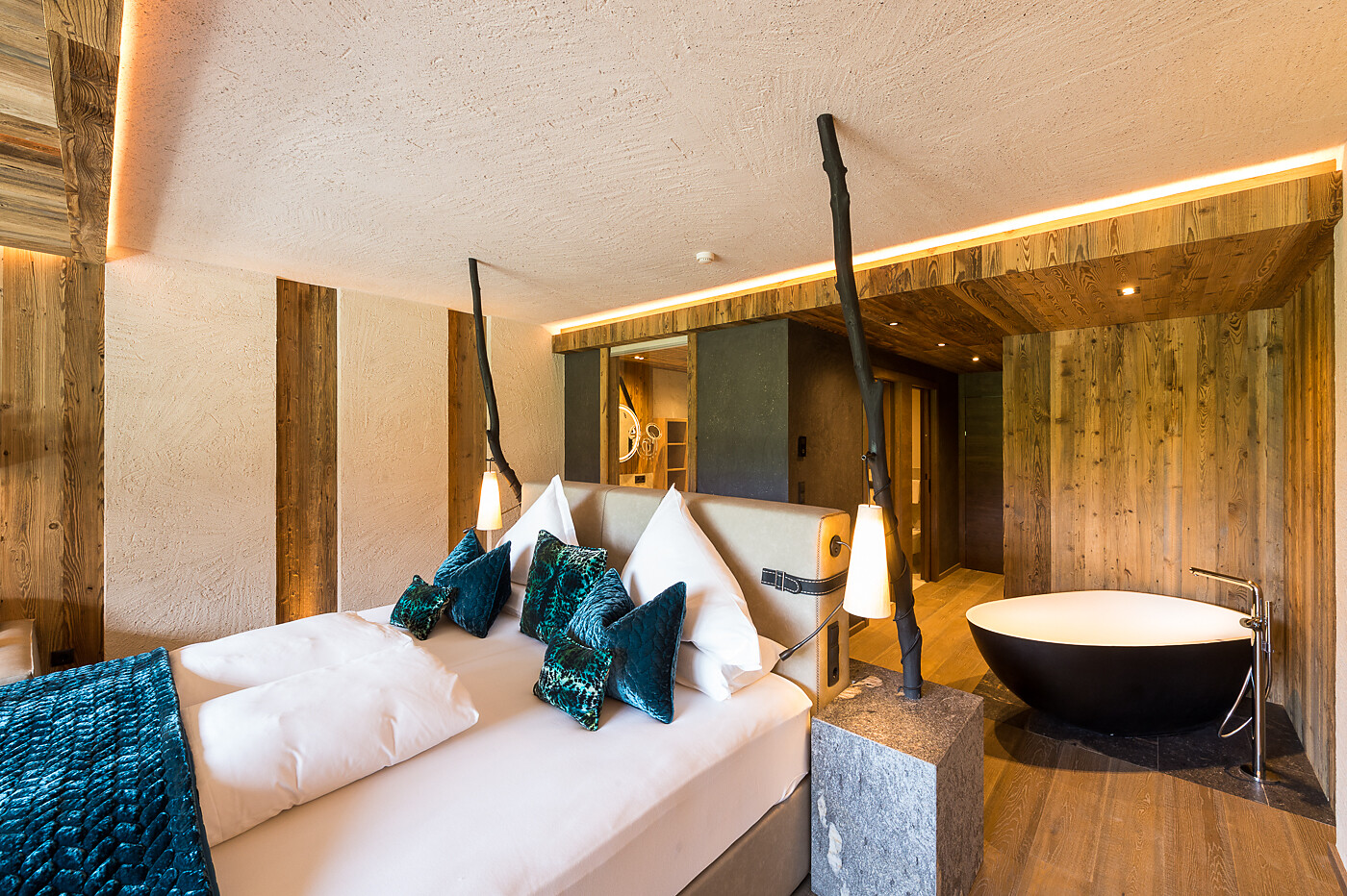 Panorama Suite (2-4 guests) - ca. 53-58m², including 8m² balcony, suite in stone pine with open bathroom with view of room, bath thub, snug bed with scenic view, starry sky.