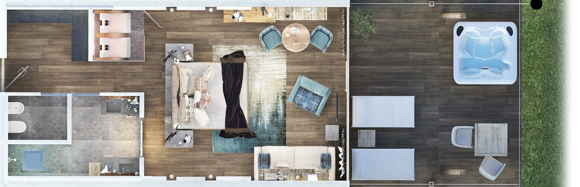 2–4 persons, approx. 60m² incl. 10m² loggia and garden terrace with hot tub