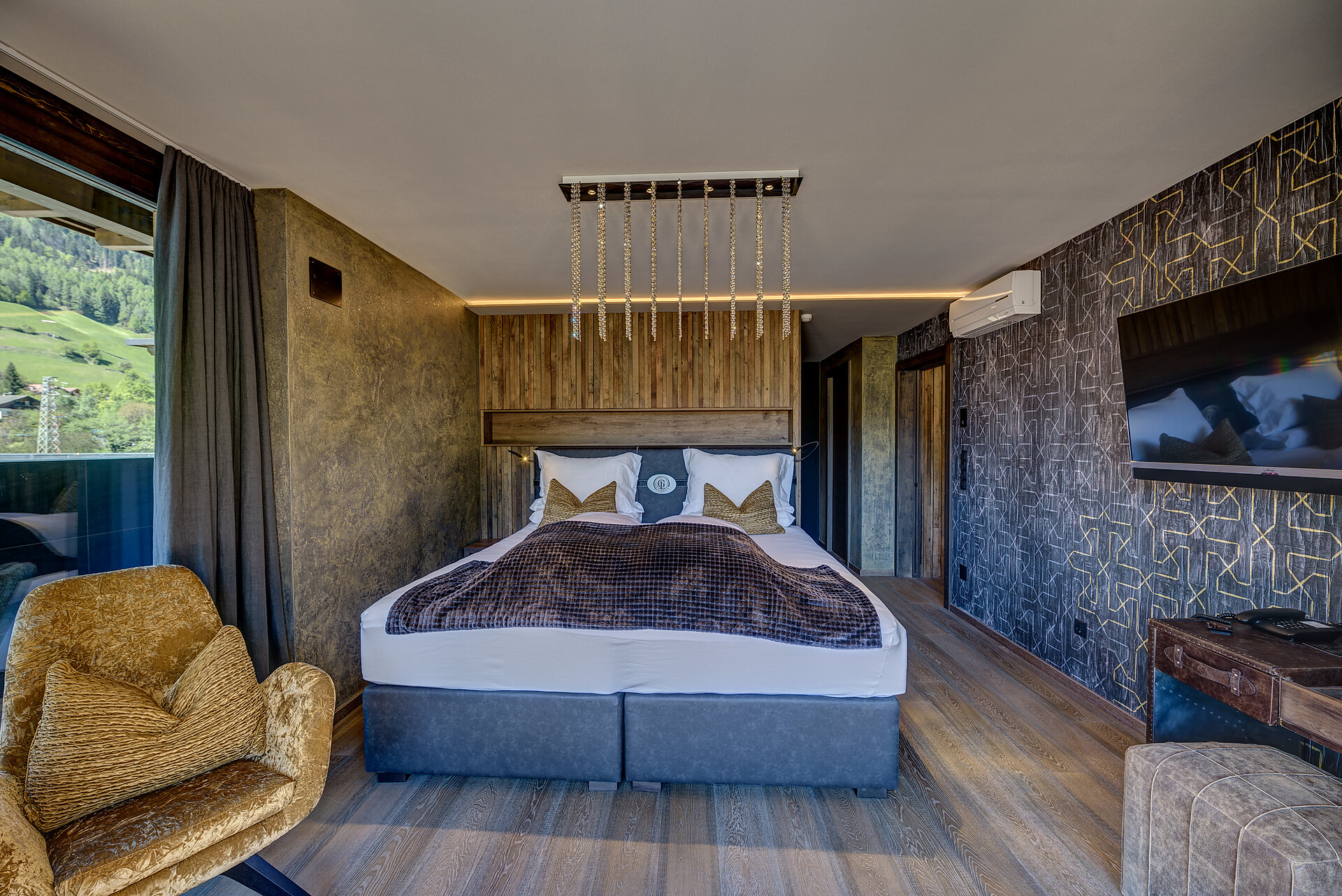 Double room, Double bed , Balcony, Air conditioning, Living area, Anti-allergic room, Mini-bar, Safe, Shower / Bath tub, Hair dryer, Bathrobe, TV, WLAN, Main building, Panoramic view