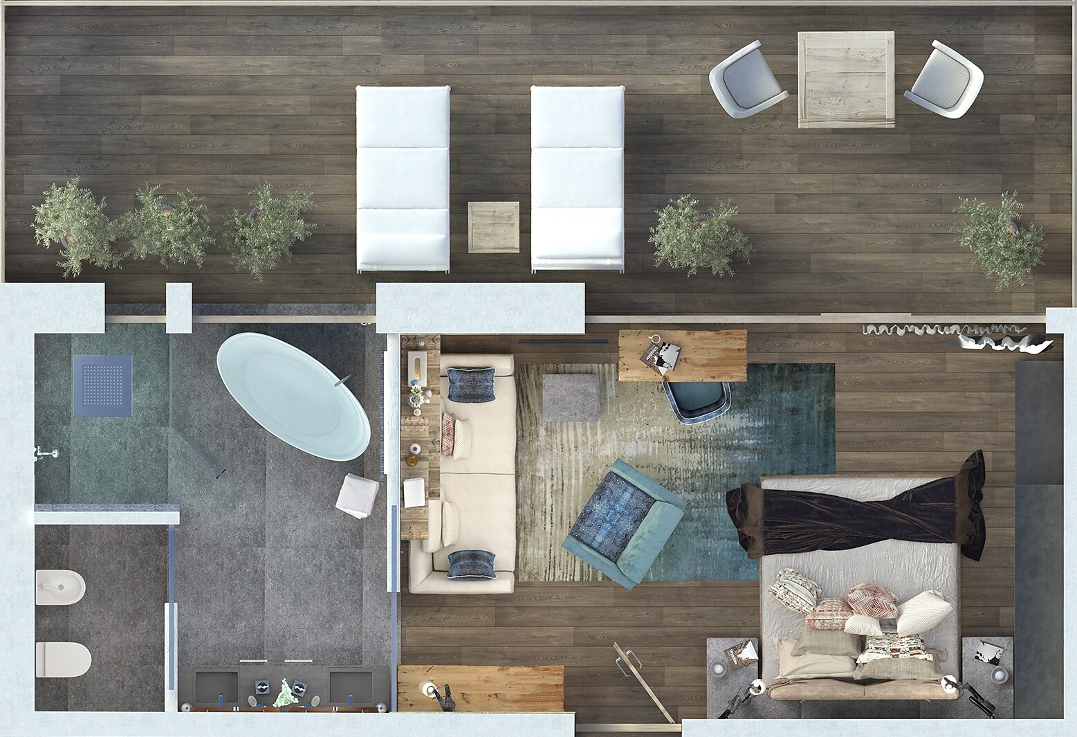 from the living and sleeping areas, comprising 2 bedrooms each with a bathroom (one of them very luxurious) and living room with air conditioning.