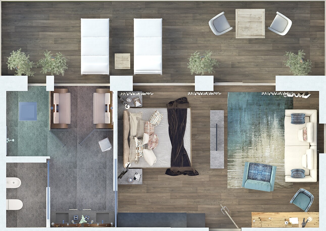 2-5 people - Approx. 60 m² including a 5 m² loggia with whirlpool facing south. Ideal for families – spacious for 2 people with separate sleeping options. Family suite with air conditioning consisting of a double bedroom with nature view, children’s room with up to three beds, with window and access to the loggia, two bathrooms with shower, 2 separate WCs, coffee machine, and kettle.