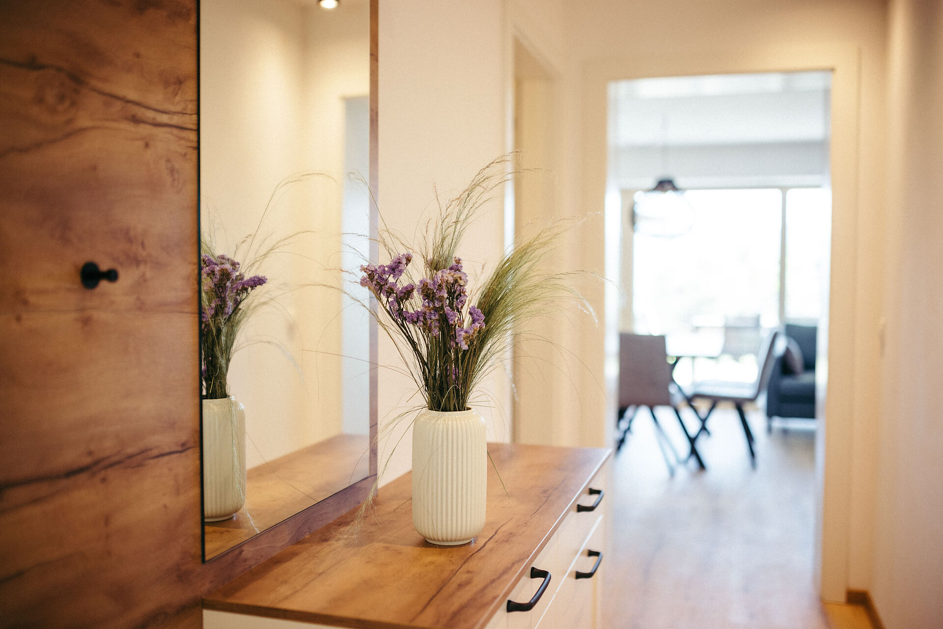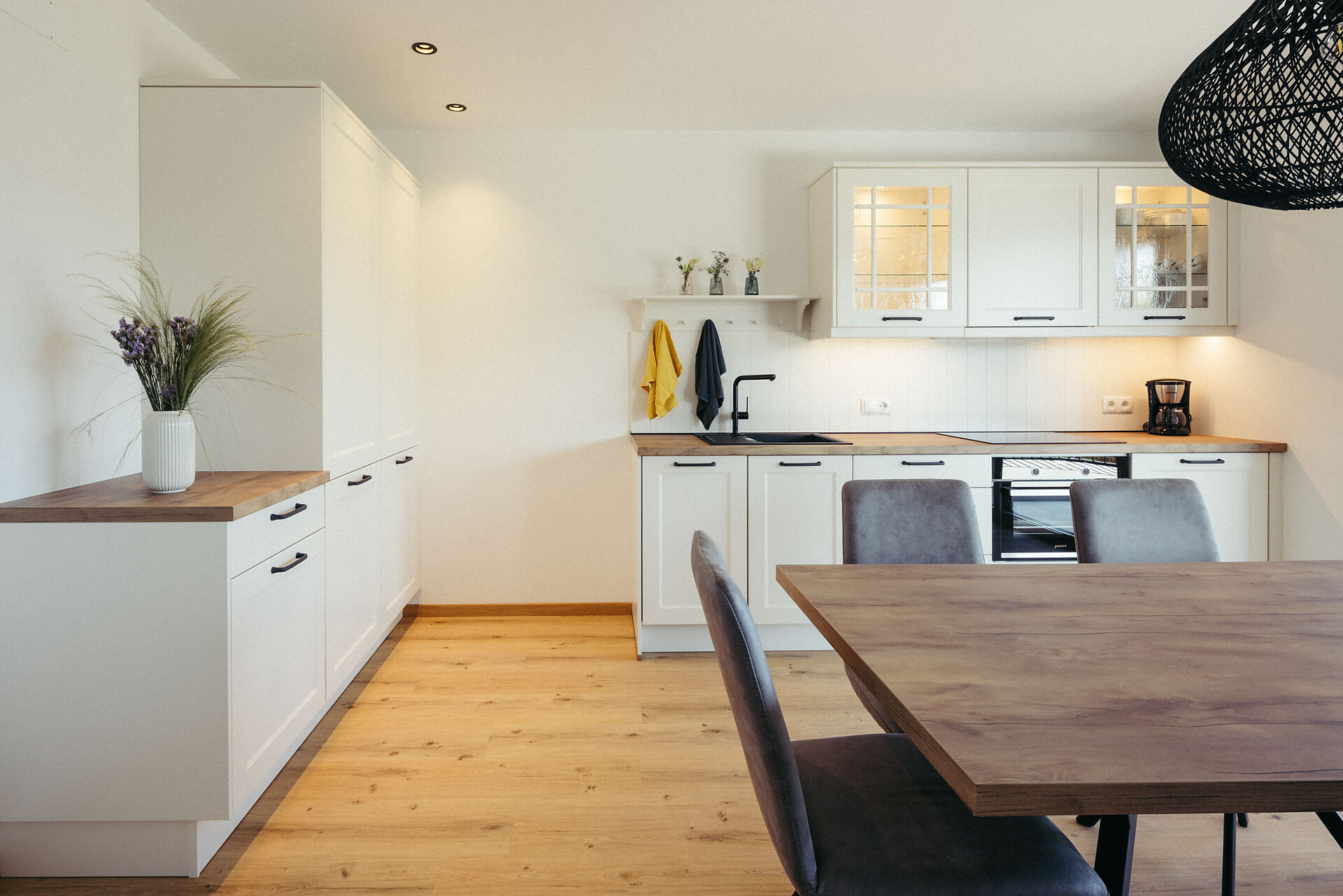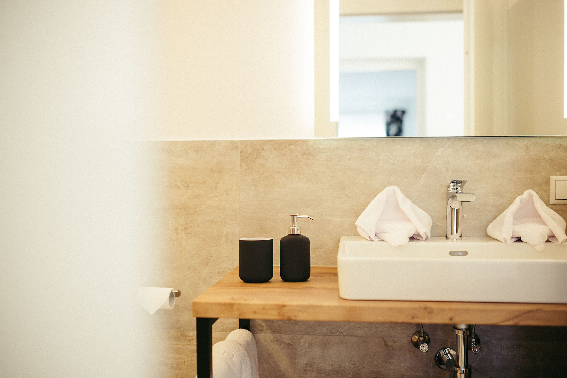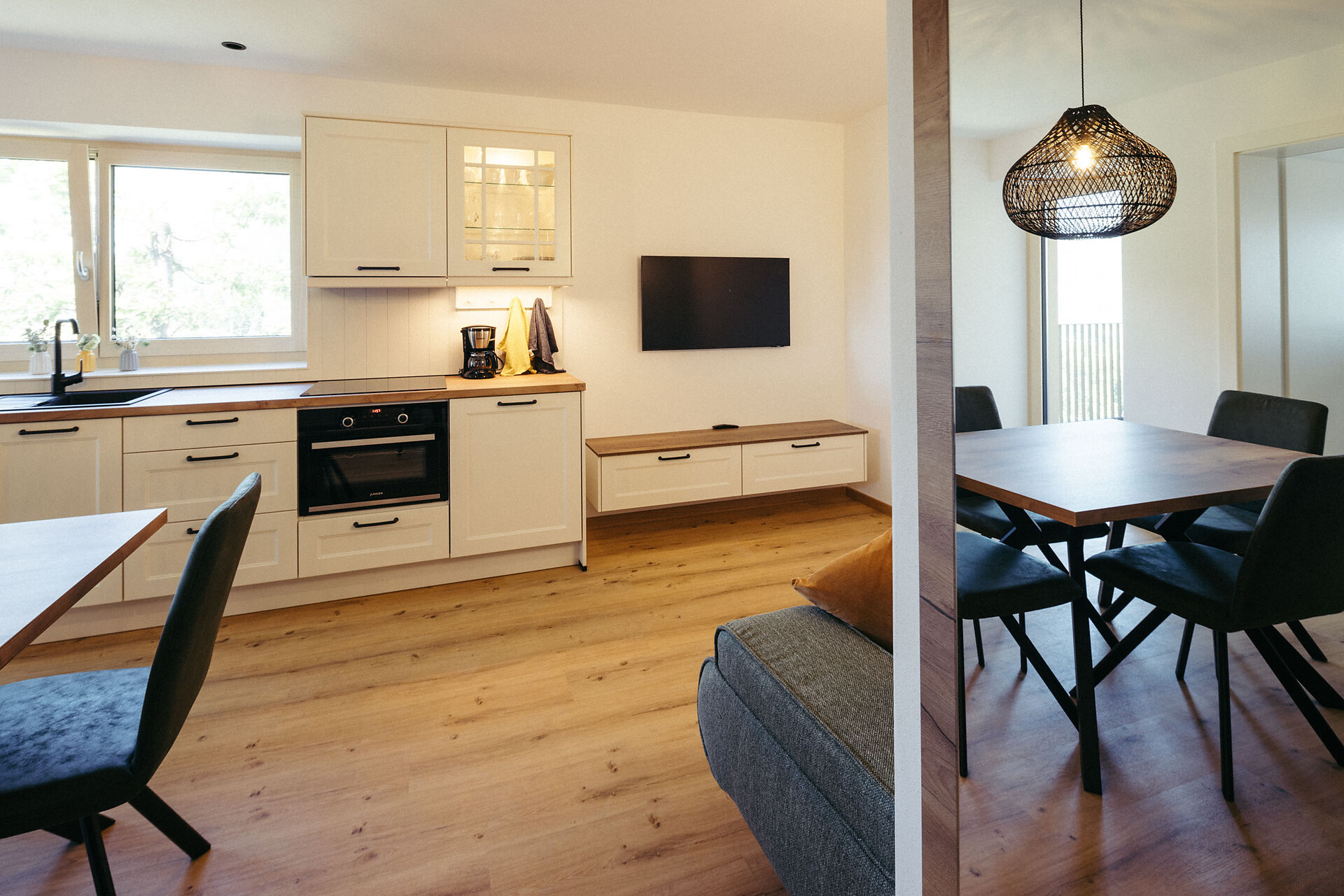 The Kuens Apartment (approx. 150 m², with 75 m² of living space) is located on the ground floor and is fully accessible for wheelchair users, offering a high level of comfort. It features two double bedrooms, one of which can be converted into two single beds, and a pull-out sofa (1.50 x 2 m). There are two bathrooms, one with a shower and one with a bathtub and bidet.