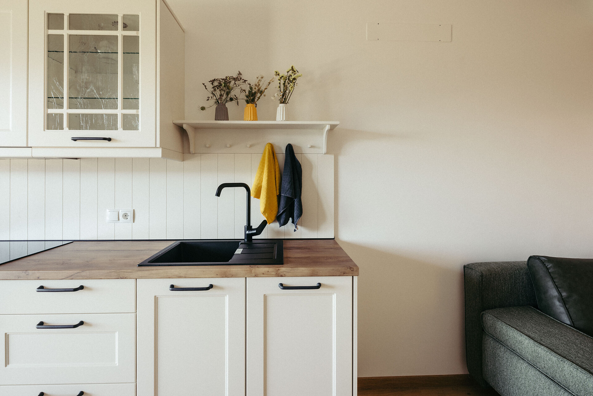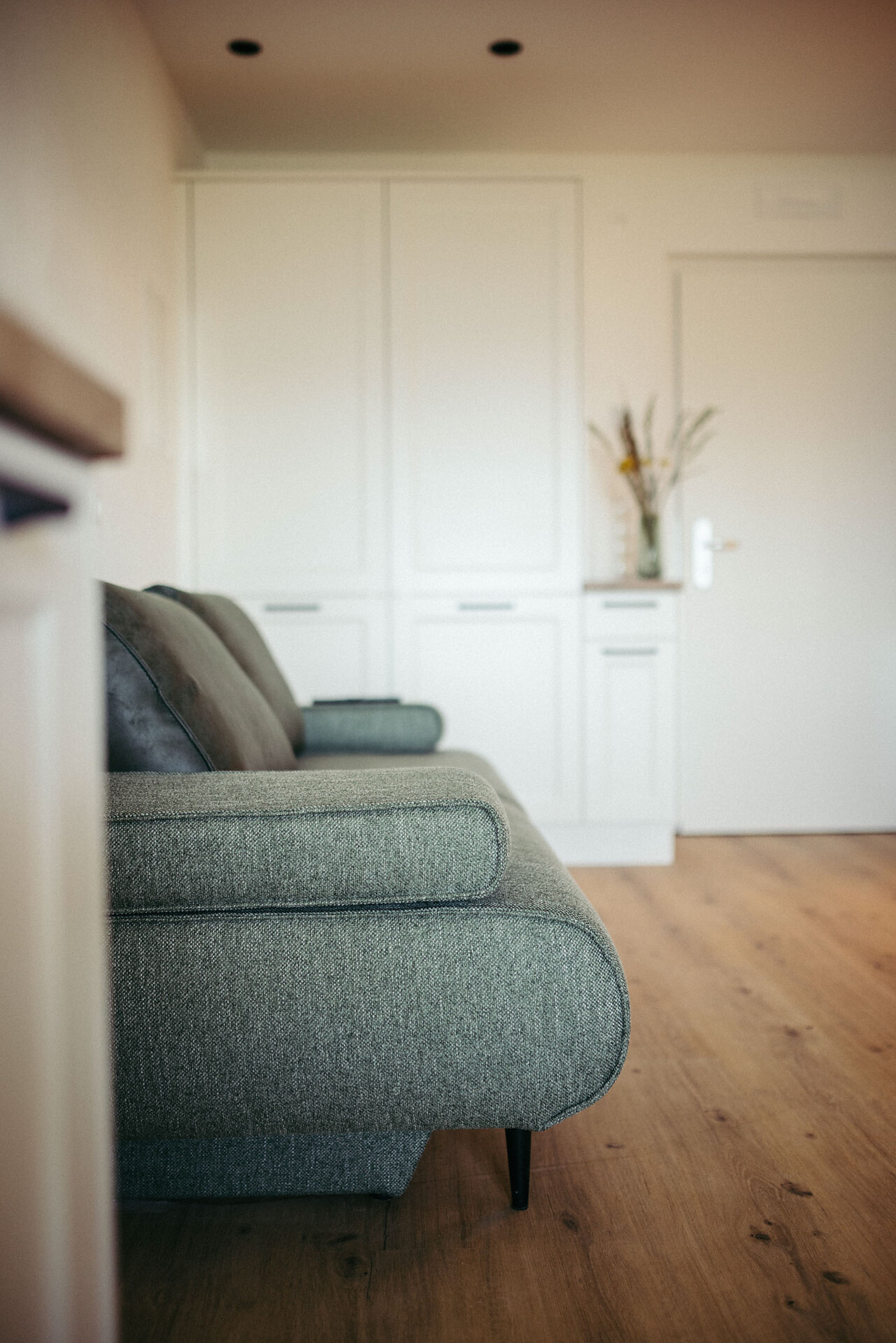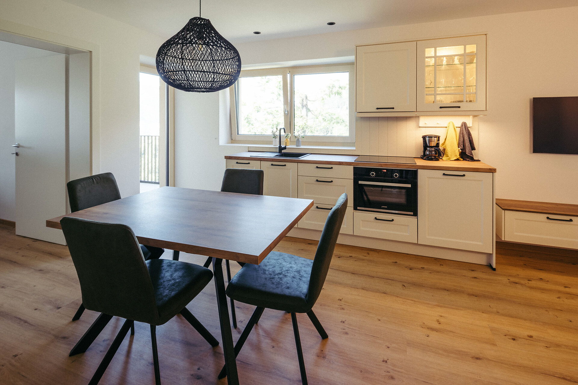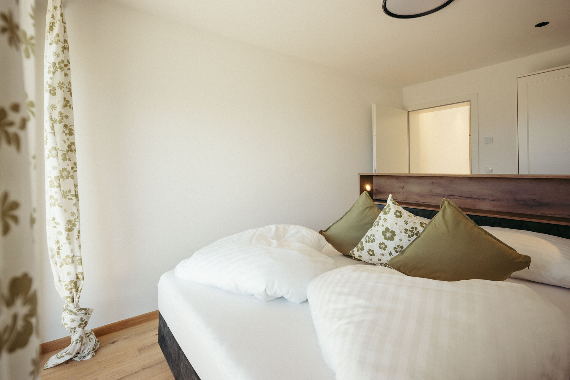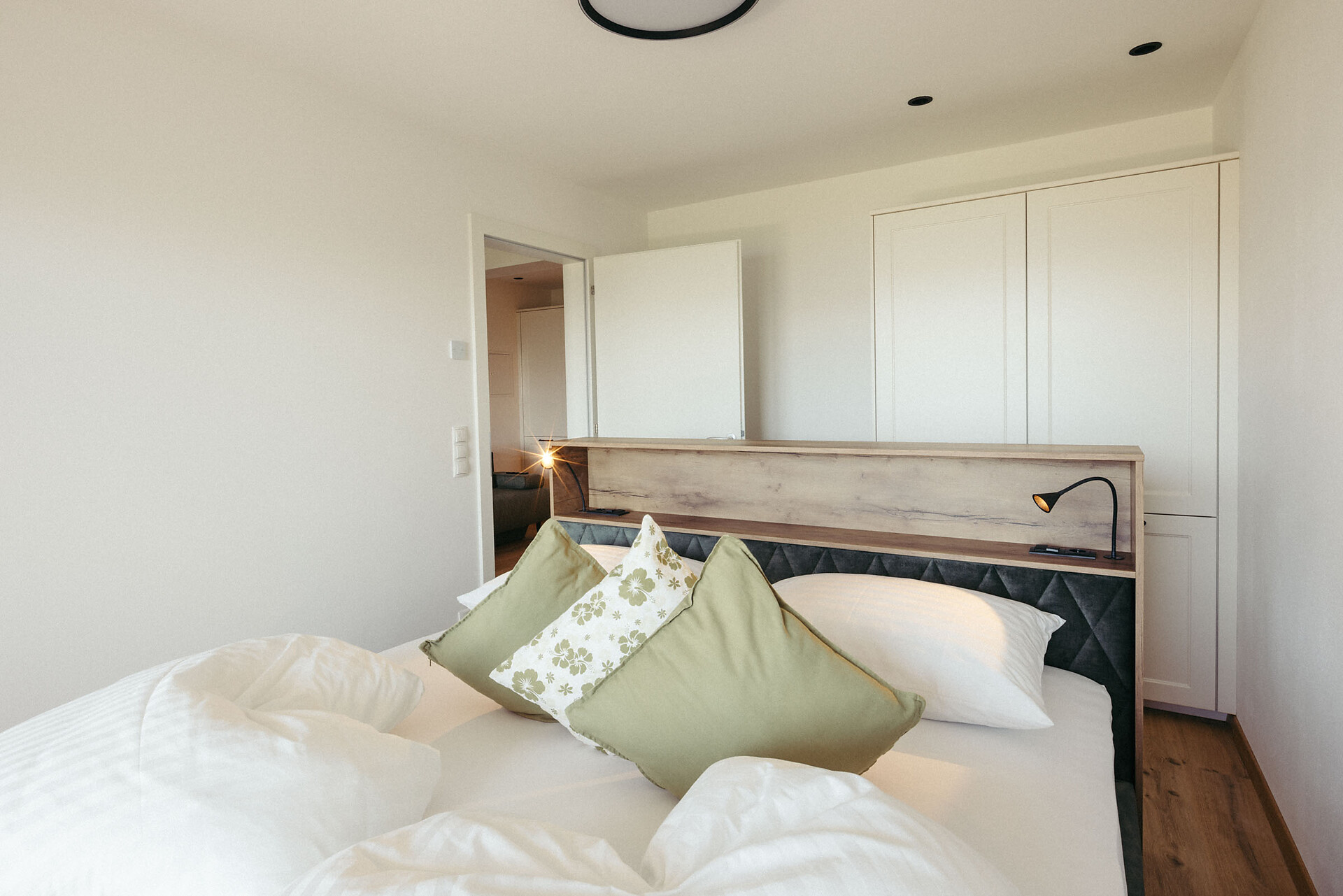 The apartment is modern and comfortably furnished, with various shades of green creating a calming atmosphere. An air conditioner provides pleasant cooling in the living area, while on cooler days underfloor heating ensures cozy warmth.