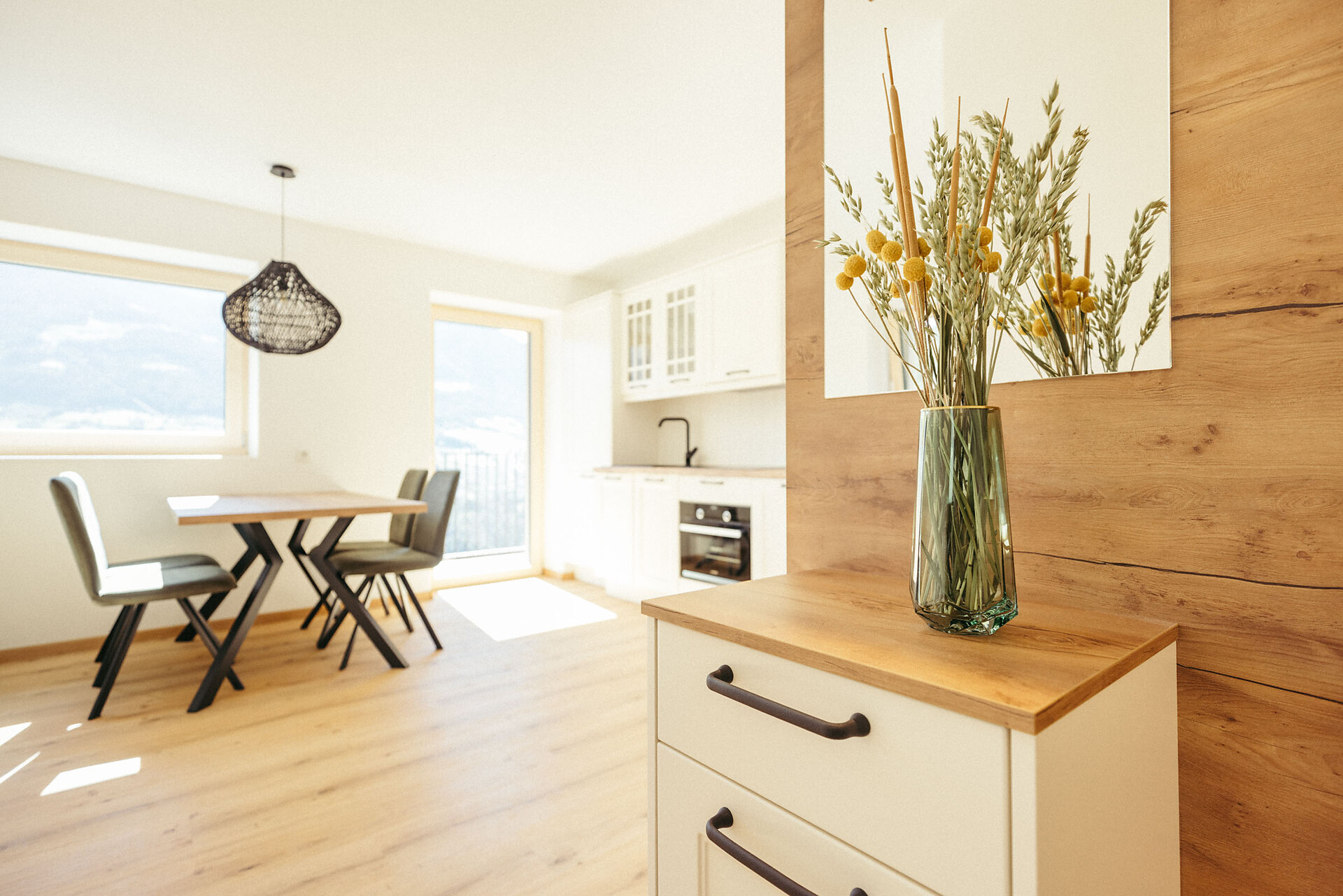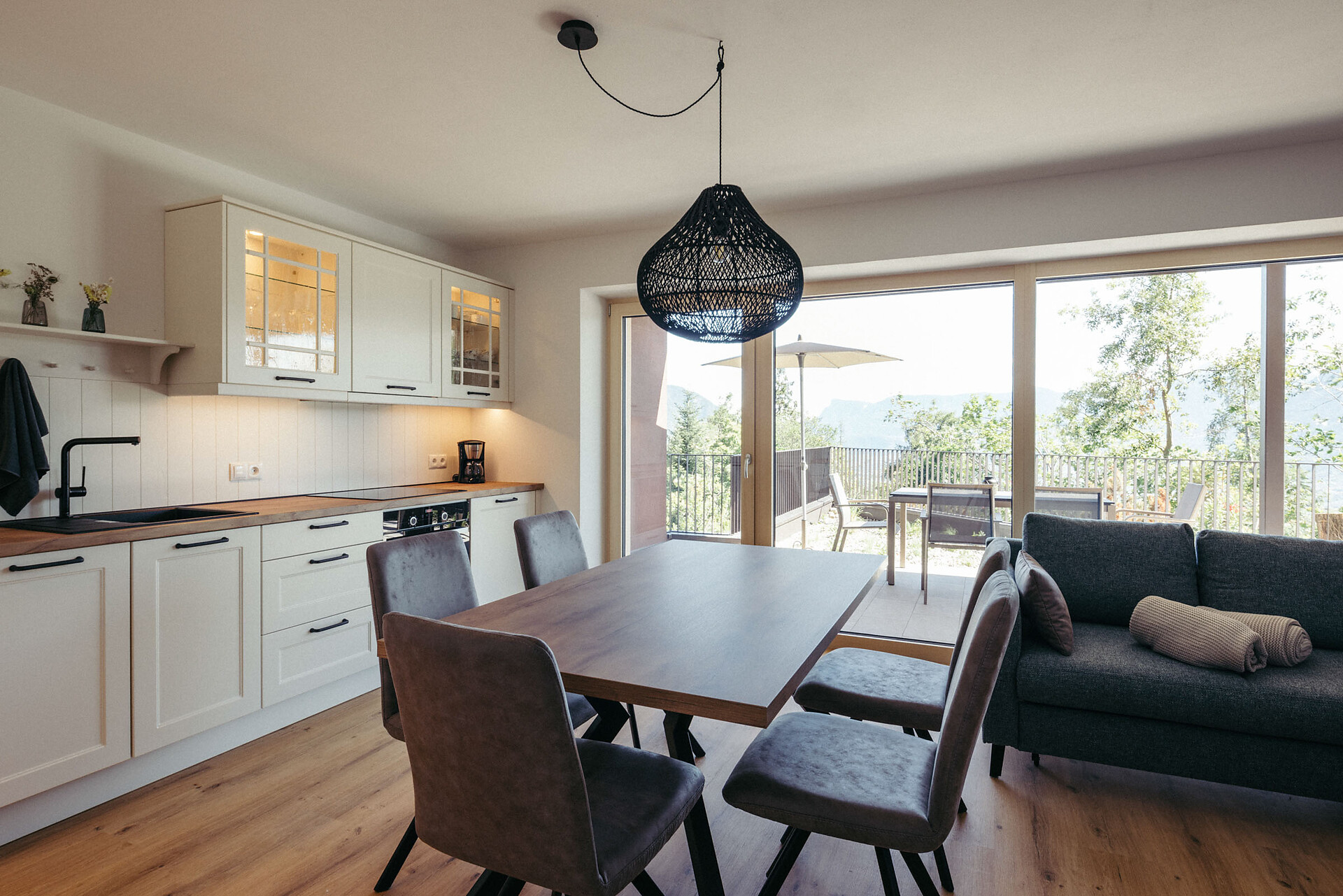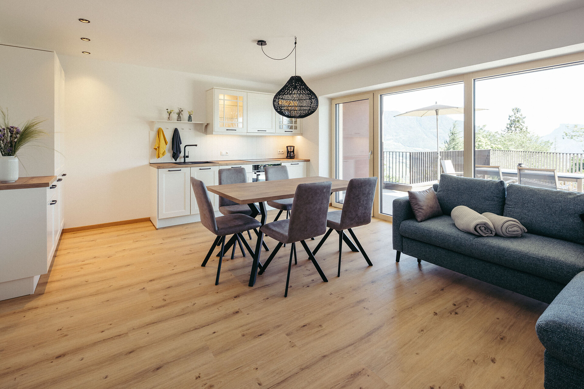 Modern and cozy, with elegant accents in antique rose, gray, and anthracite, the apartment offers a breathtaking view of the surrounding mountains. Enjoy the sunshine from morning until late afternoon, surrounded by the peaceful atmosphere of this special place.