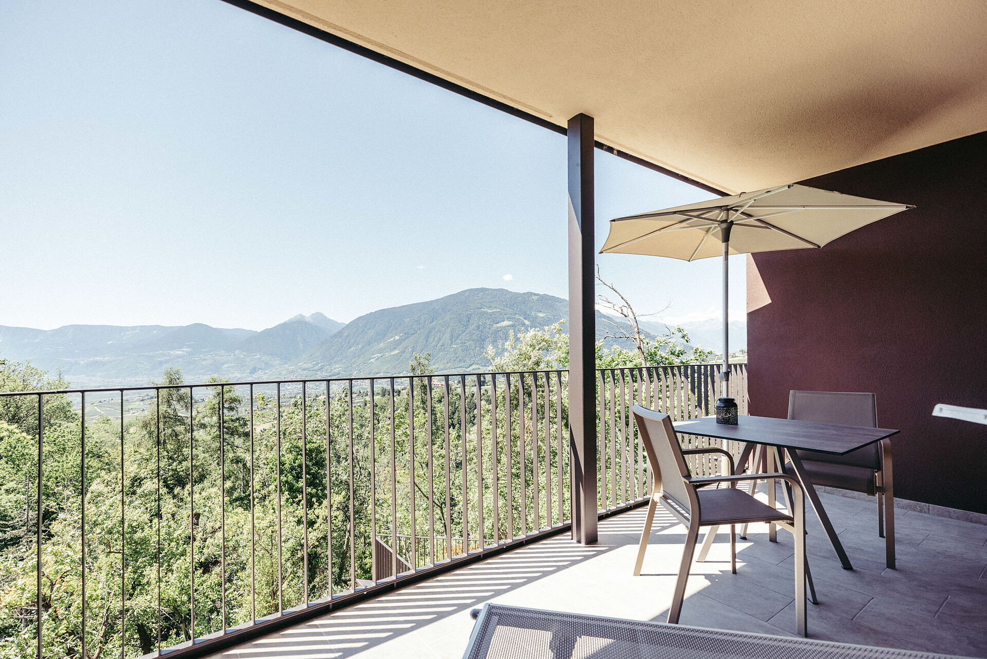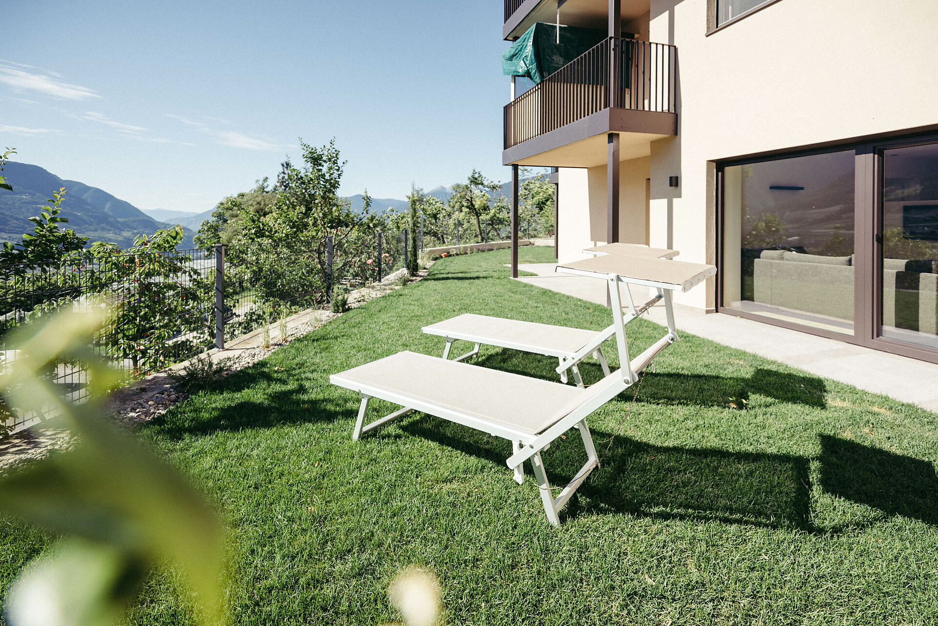 The Meran apartment, approx. 45 m² in total with 35 m² of living space, is located on the first floor and is easily accessible by elevator. It faces completely south. The cozy bedroom offers a wonderful view of the Merano region. The terrace is furnished with a table, chairs, and lounge chairs, inviting you to relax.