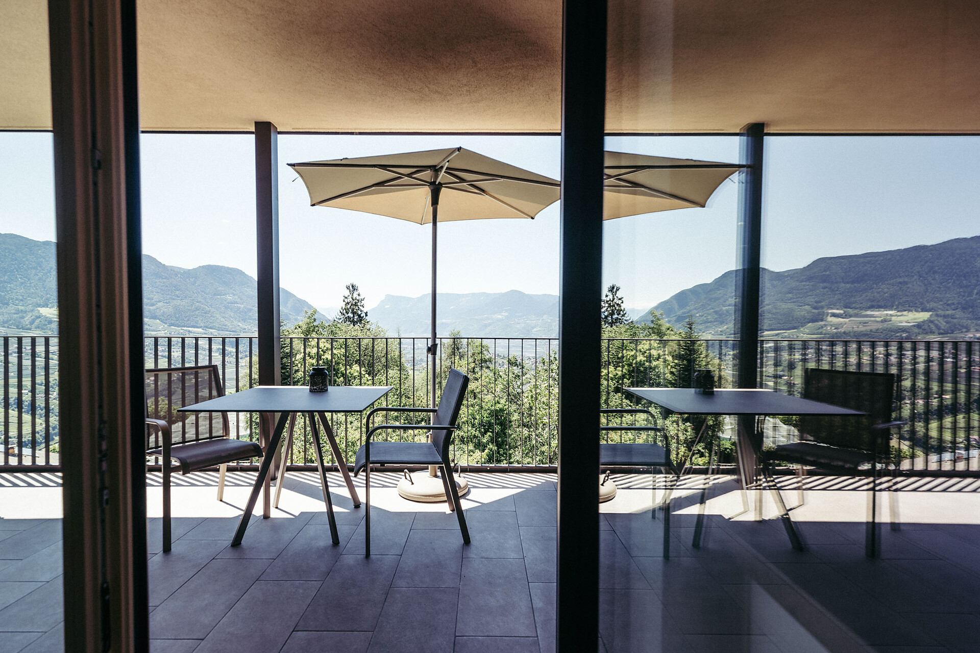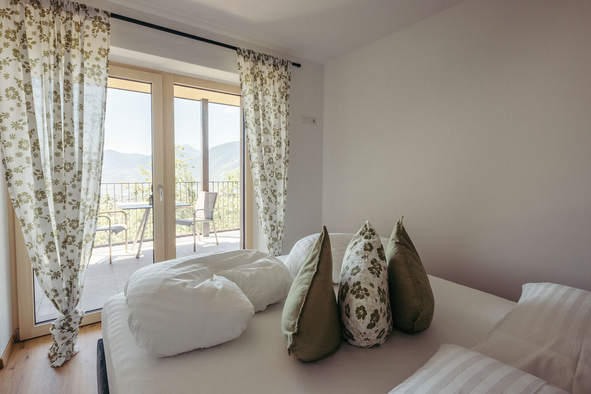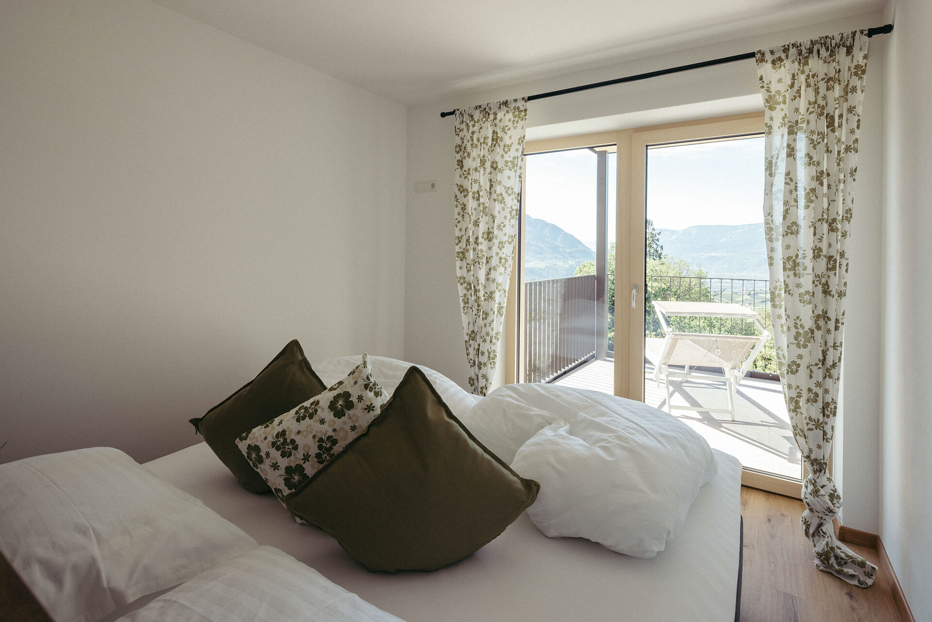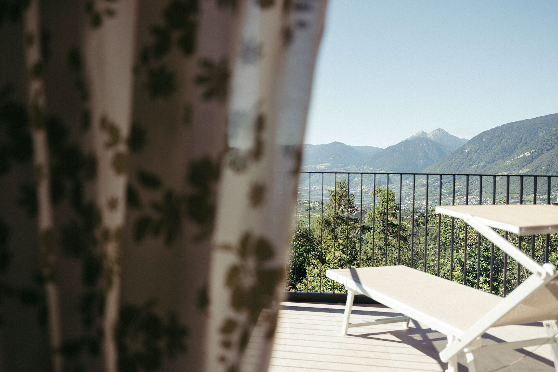 The cozy bedroom offers a stunning view of the Merano region. From the bedroom, you have access to a small balcony (approx. 5 m²) with lounge chairs and a view facing southeast.