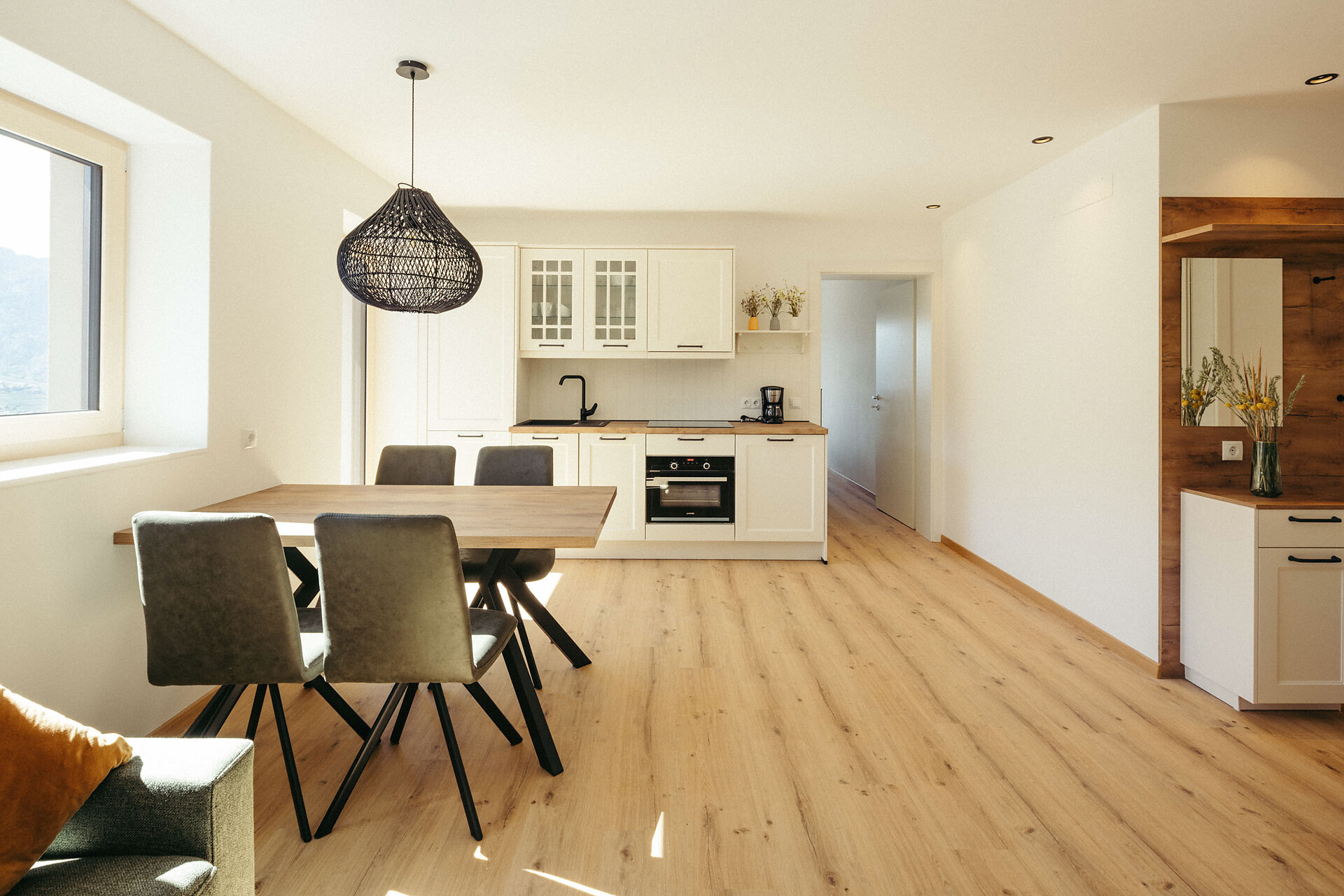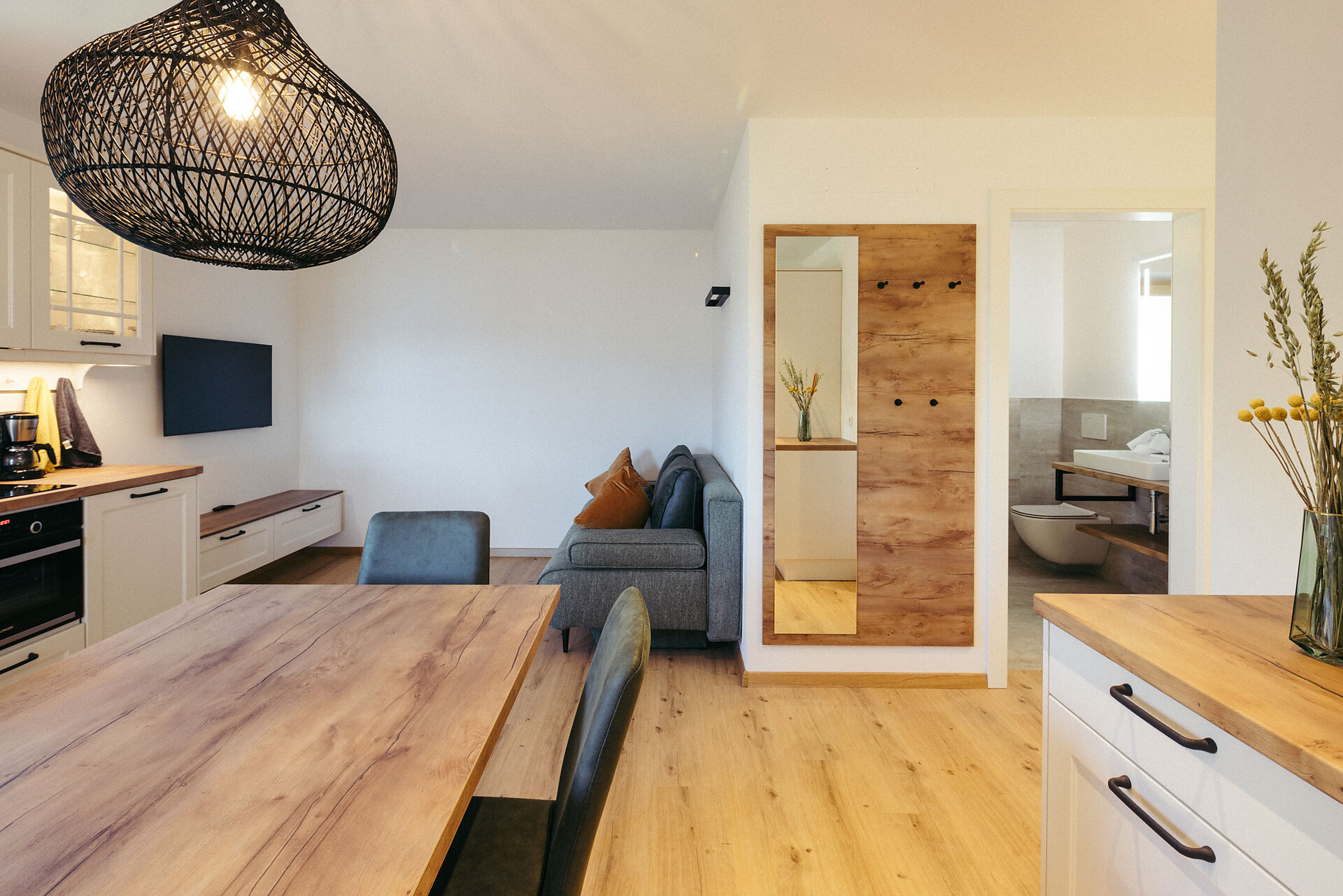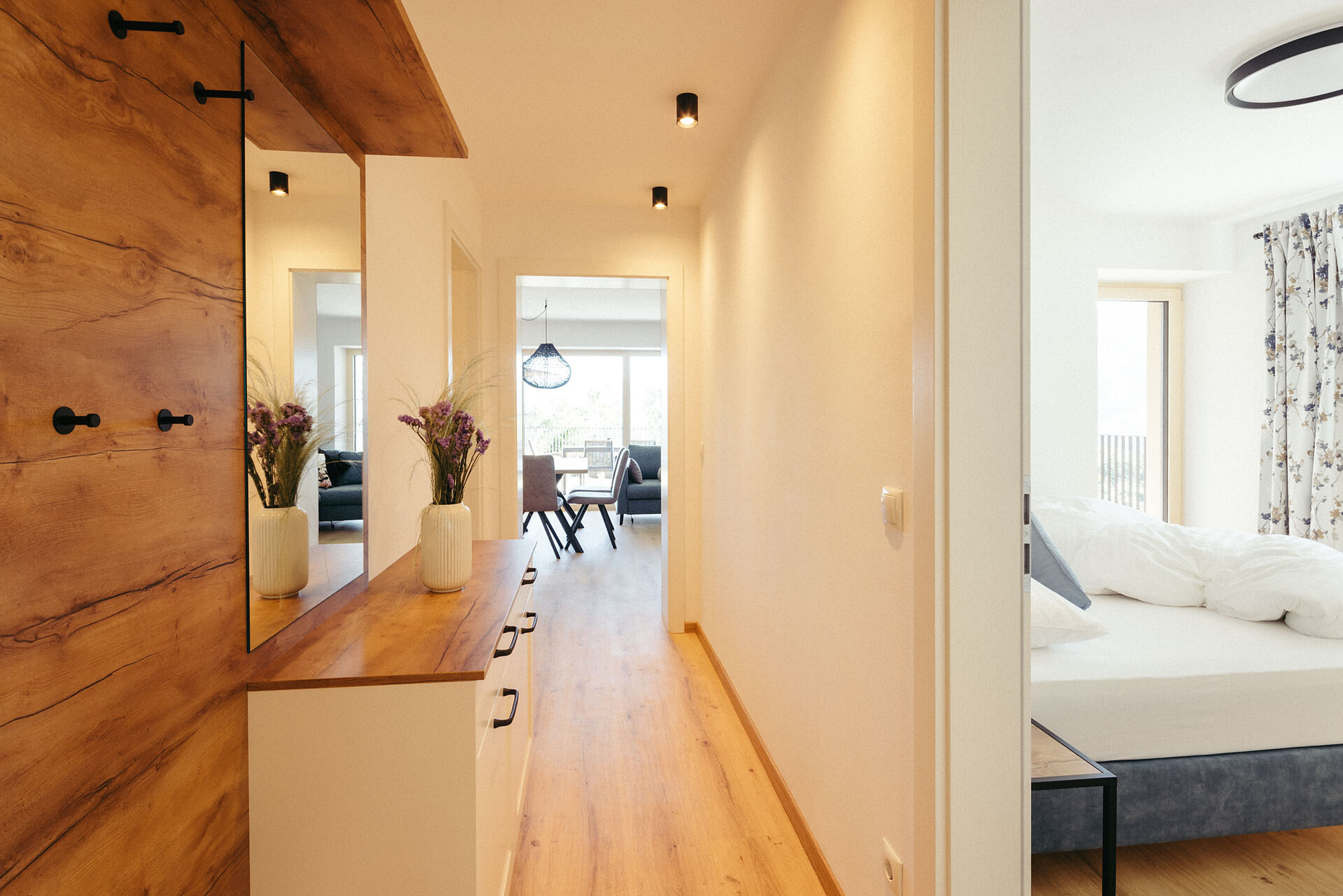 The Vinschgau Apartment (approx. 110 m², of which 60 m² is living space) is located at garden level and is easily accessible by elevator. It offers space for 2 to 6 people and includes a double bedroom with a private bathroom, equipped with a bathtub, panoramic window, and bidet, a small sleeping nook with a bunk bed, and a pull-out couch (1.50 x 2 m). An additional bathroom with a shower adds extra comfort.