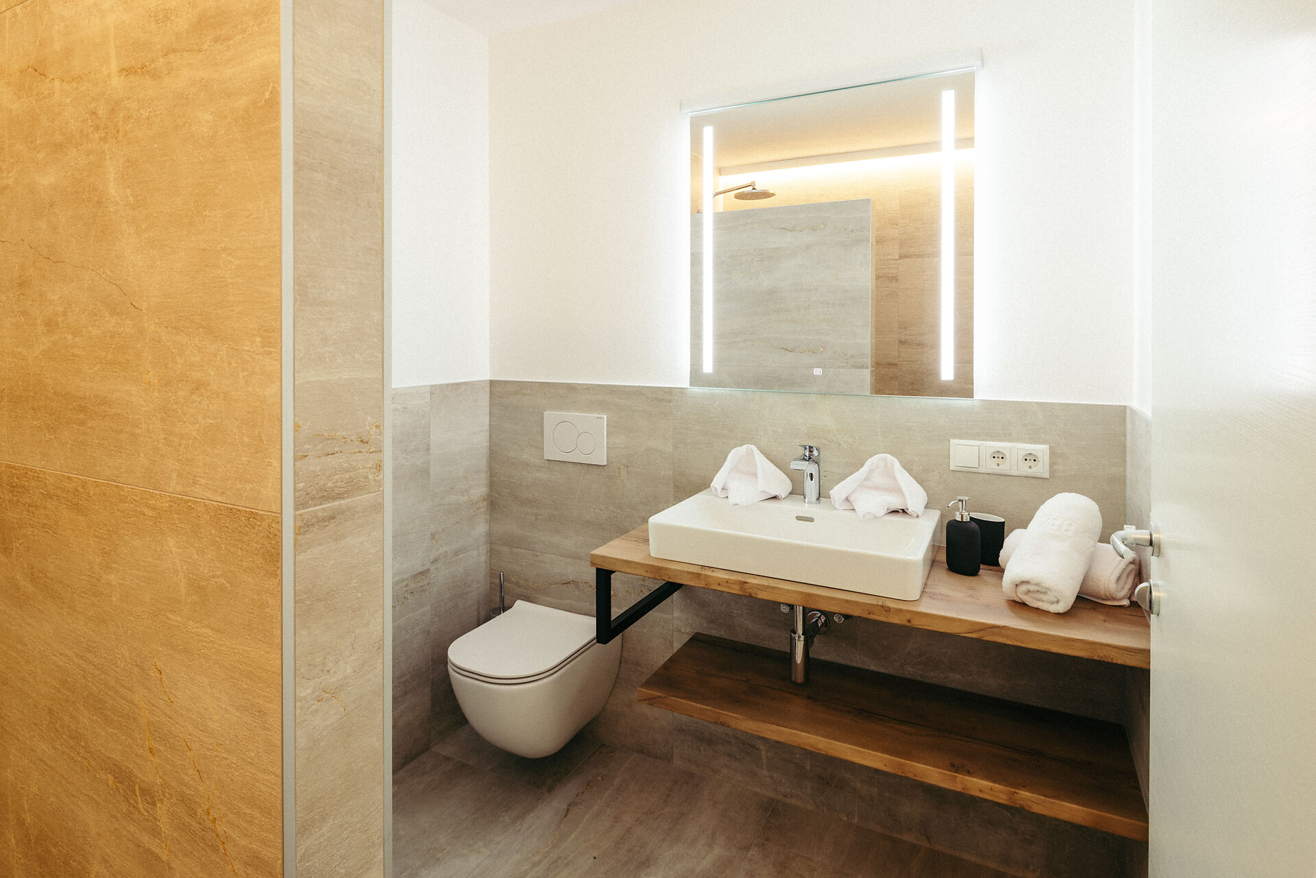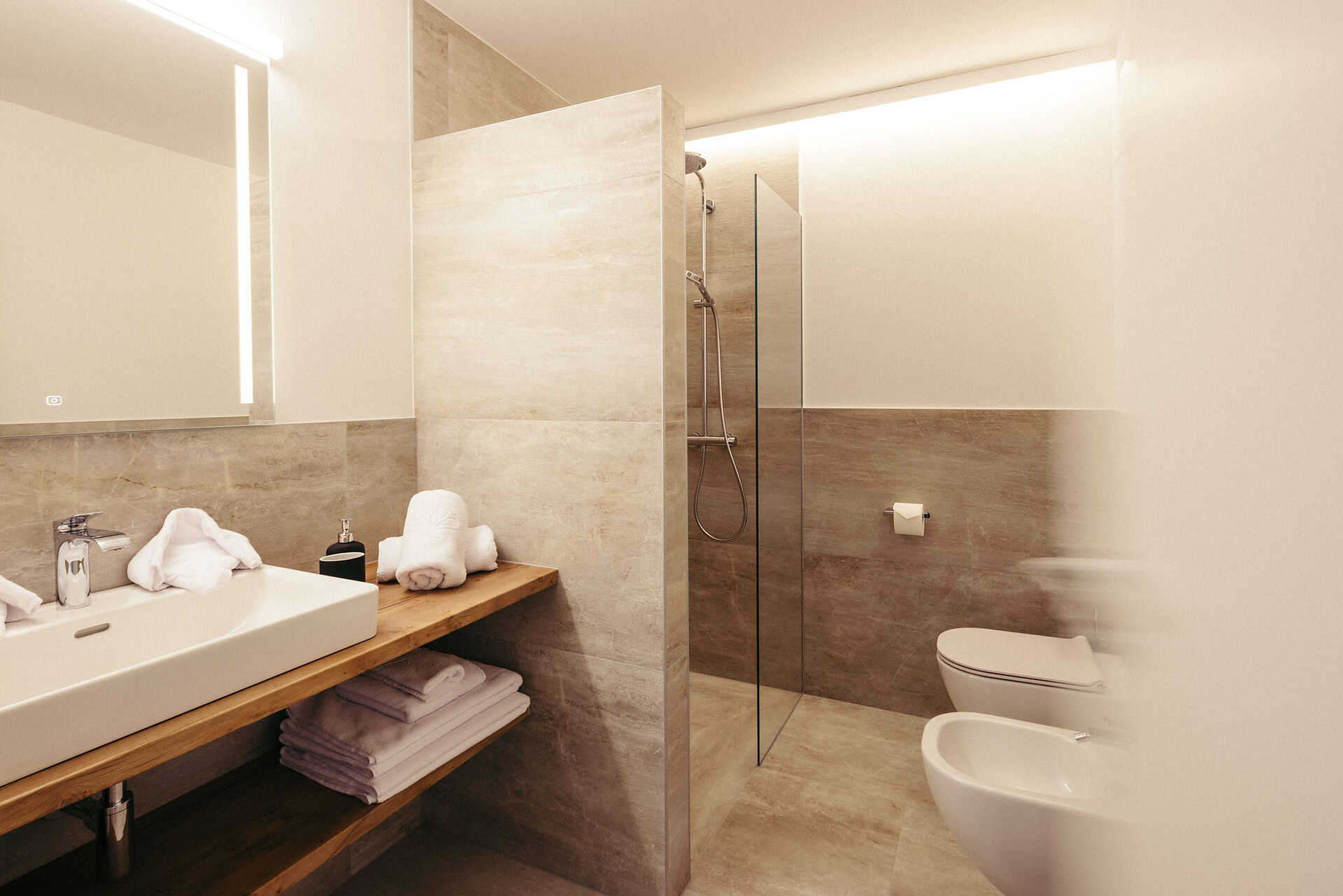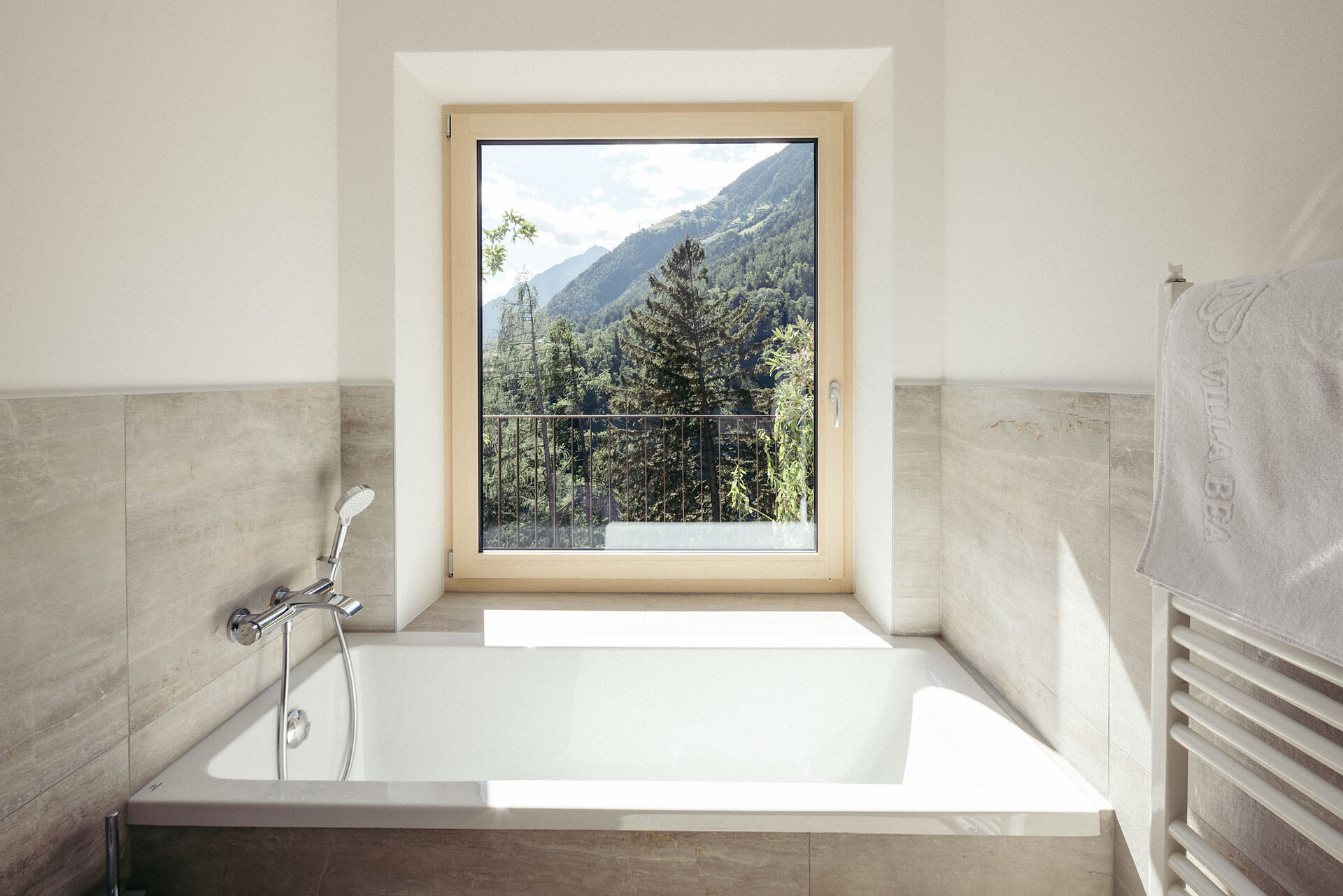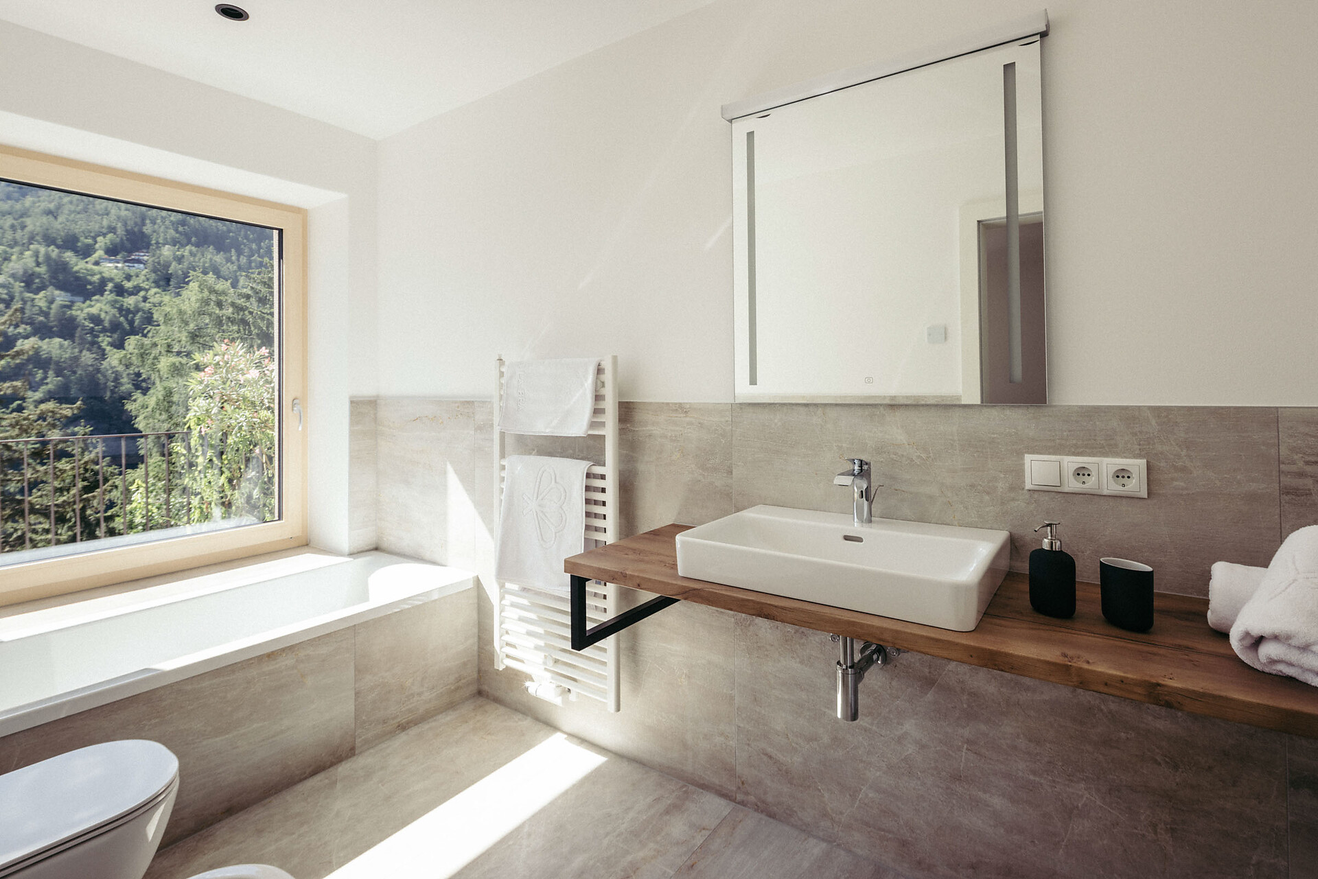 The Vinschgau Apartment (approx. 110 m², of which 60 m² is living space) is located at garden level and is easily accessible by elevator. It offers space for 2 to 6 people and includes a double bedroom with a private bathroom, equipped with a bathtub, panoramic window, and bidet, a small sleeping nook with a bunk bed, and a pull-out couch (1.50 x 2 m). An additional bathroom with a shower adds extra comfort.