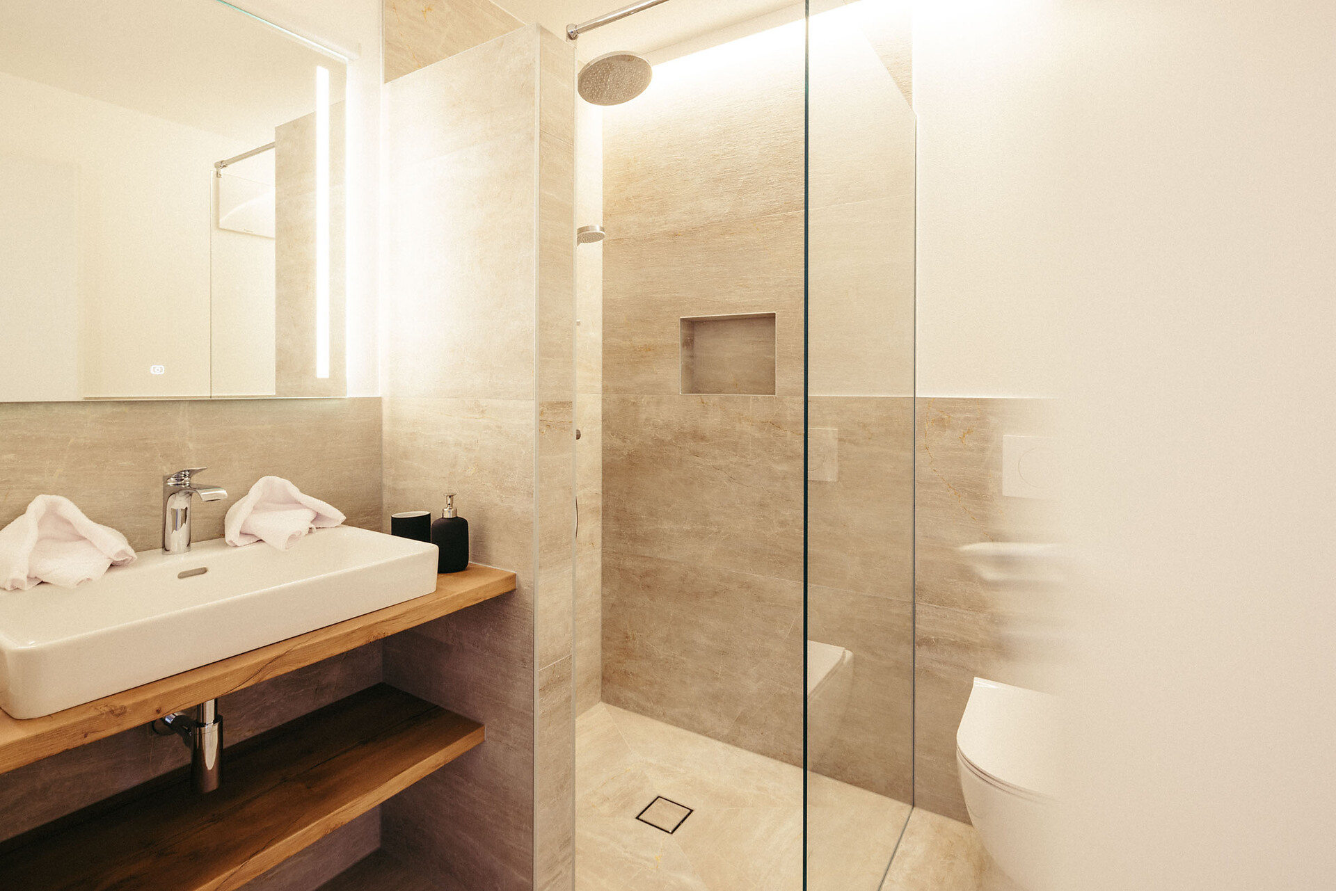 In the living area, air conditioning keeps the apartment cool on hot days, while underfloor heating ensures warmth in the winter. The spacious terrace, facing southeast, is perfect for relaxing, with lounge chairs and a table. A further balcony, facing east, offers a private sauna for moments of relaxation.