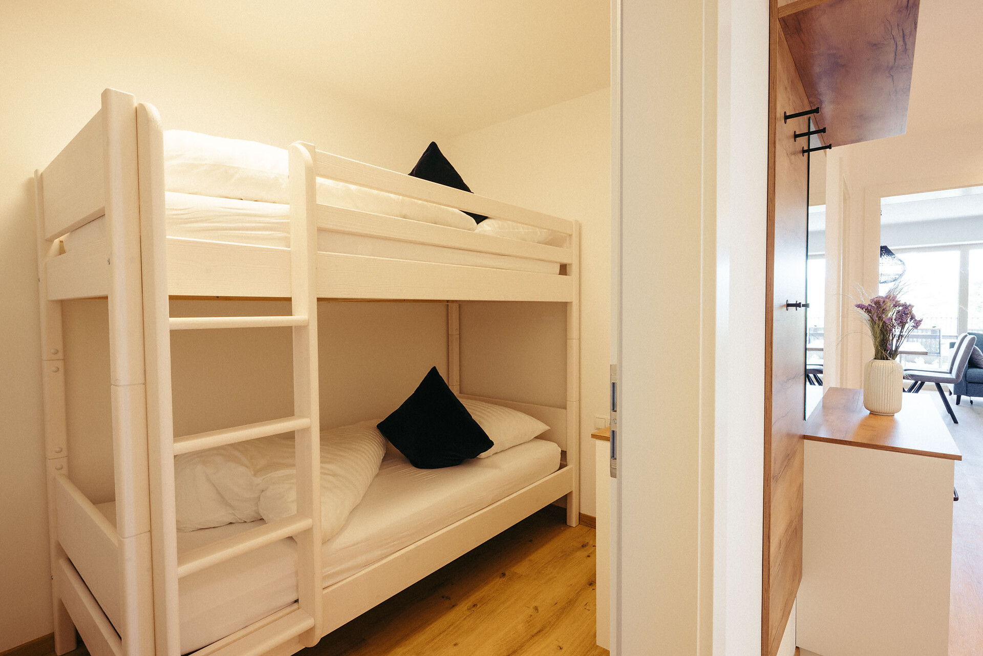The Passeier Apartment (approx. 80 m²) is located at garden level and is easily accessible by elevator. It offers space for 2 to 6 people and features a double bedroom with a private bathroom, equipped with a bathtub and panoramic window, a small sleeping nook with a bunk bed, and a pull-out couch. An additional bathroom with a shower provides extra comfort.