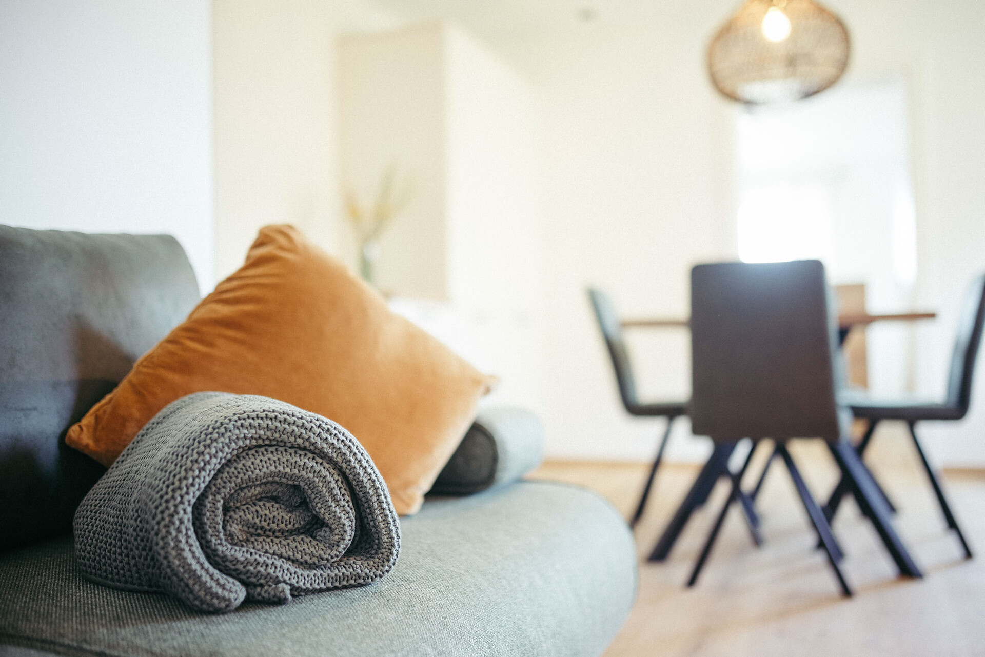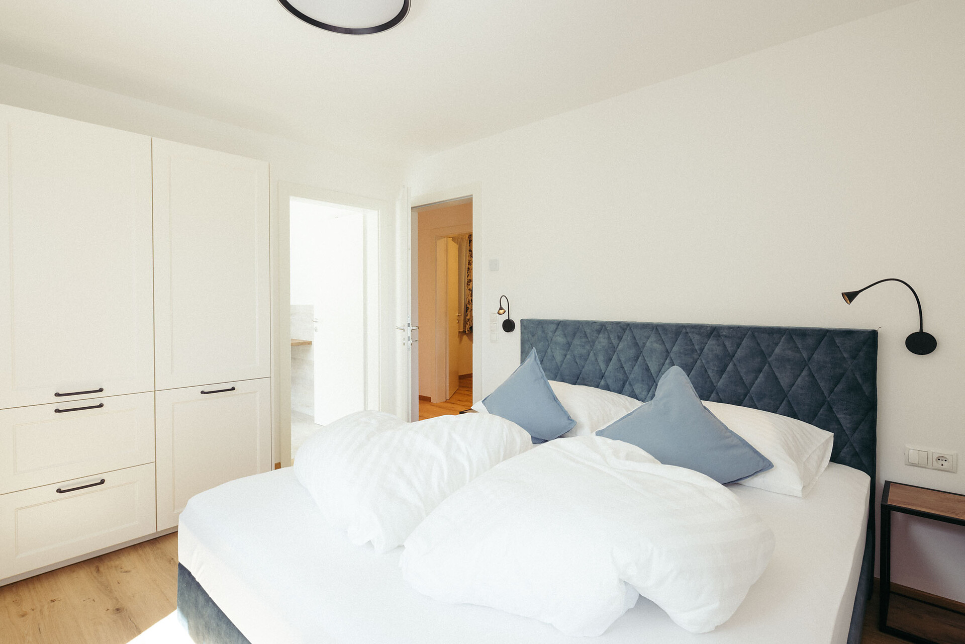 Modern and cozy, with accents of blue, gray, and petrol, the apartment offers sunshine throughout the day, lasting until the late evening.