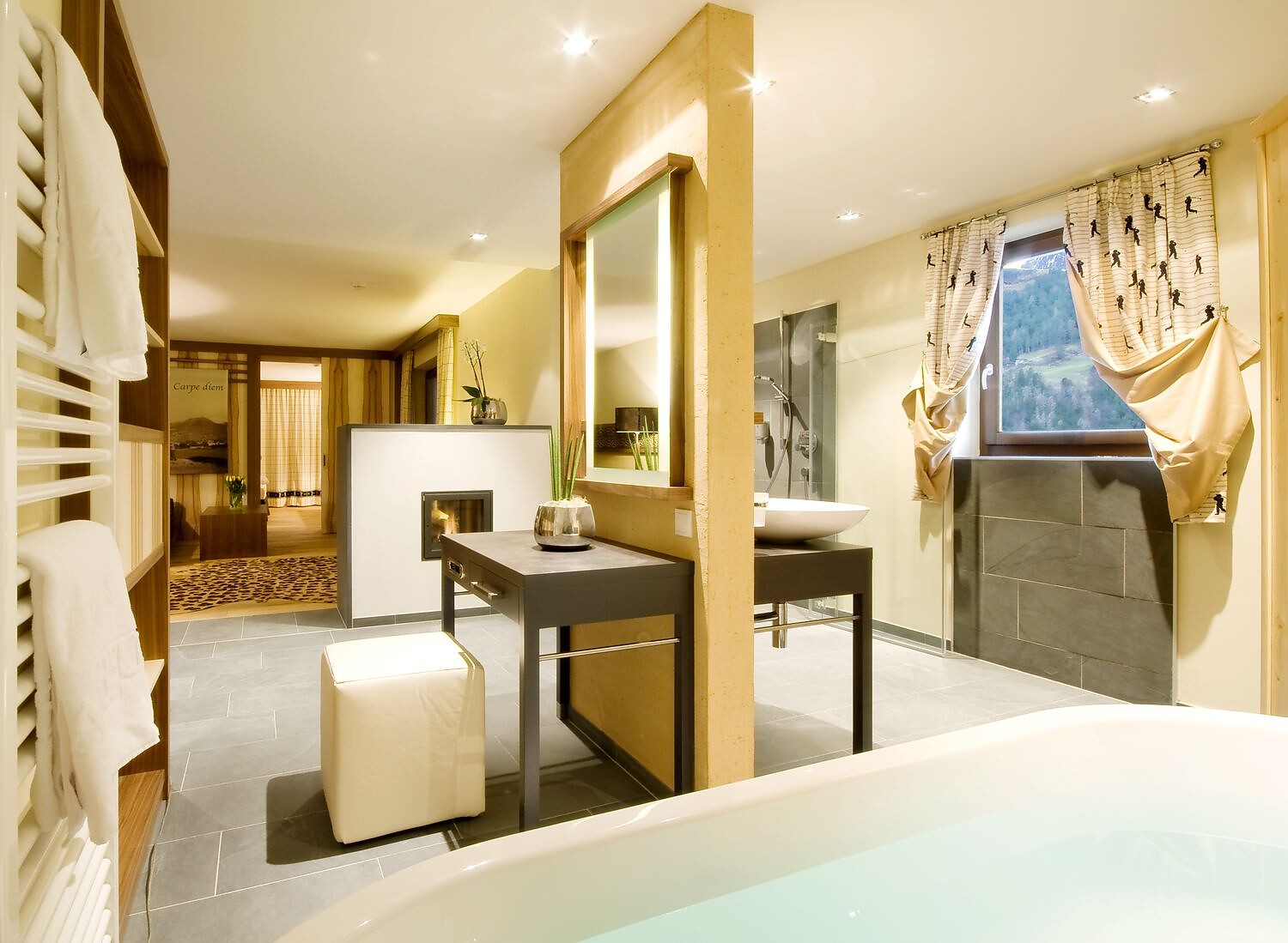 Vital Suite (2-4 guests) - ca. 87m², including 27m² balcony or terrace as the case may be, honeymoon suite in maple with separate bedroom, open fireplace wiht relaxation lounger, Espresso machine, open bathroom wiht infra-red cabin, whirl tub and make-up corner, starry sky