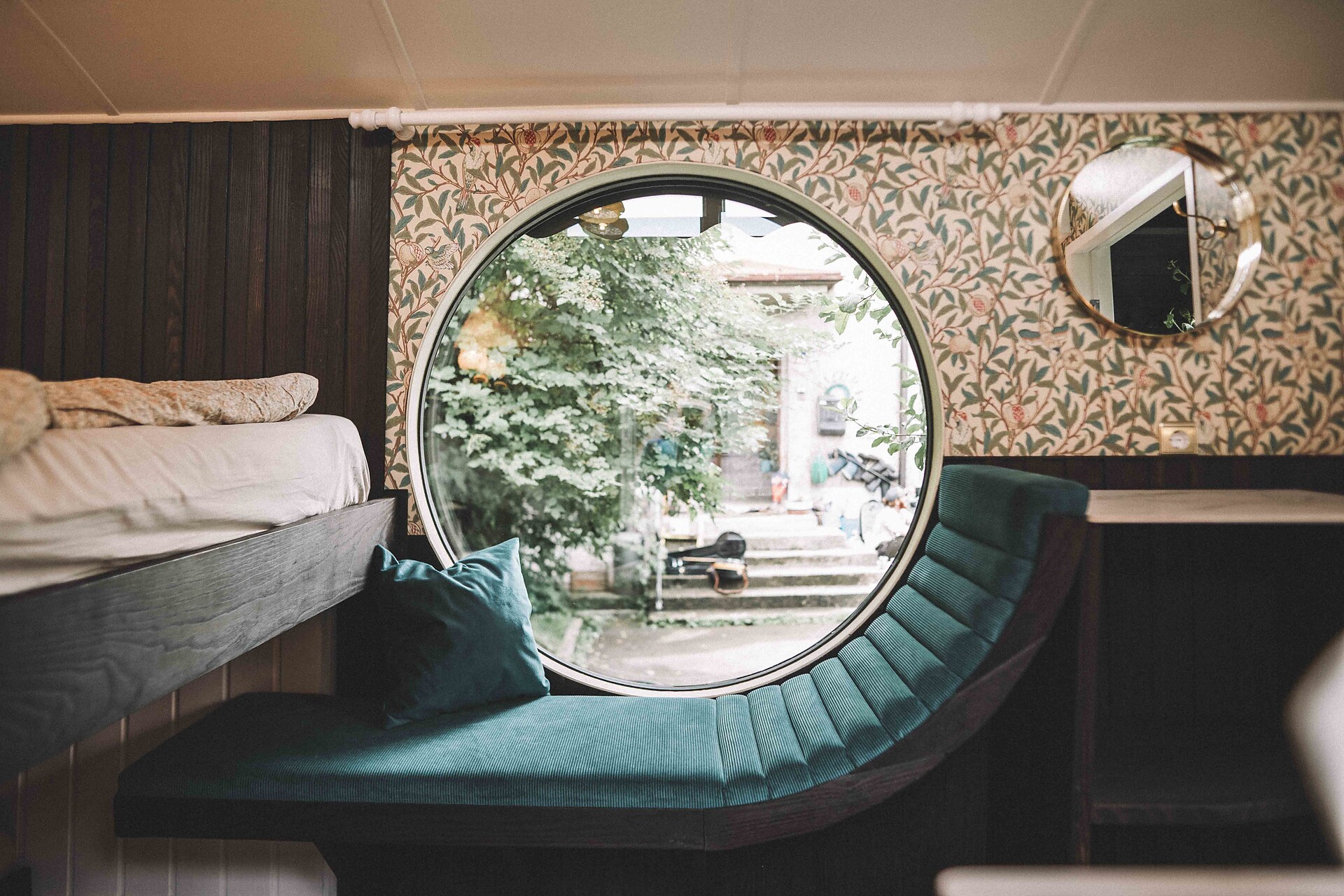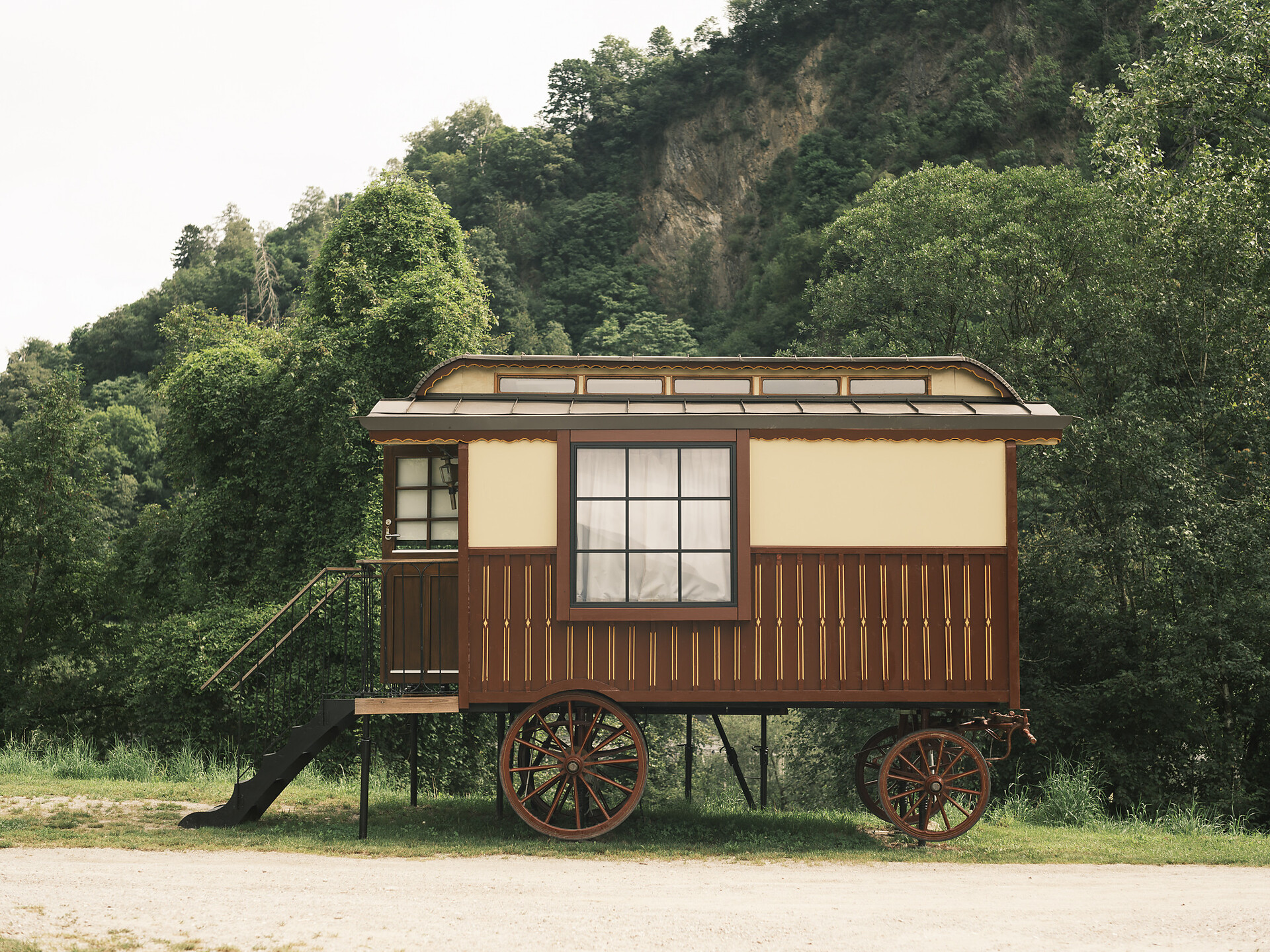 Wagon "Tilia", double bed, equipped kitchen (cooker, sink, bench, small table), wardrobe, large window with mountain view, nice outdoor area with loungers and parasol, bench with river view.