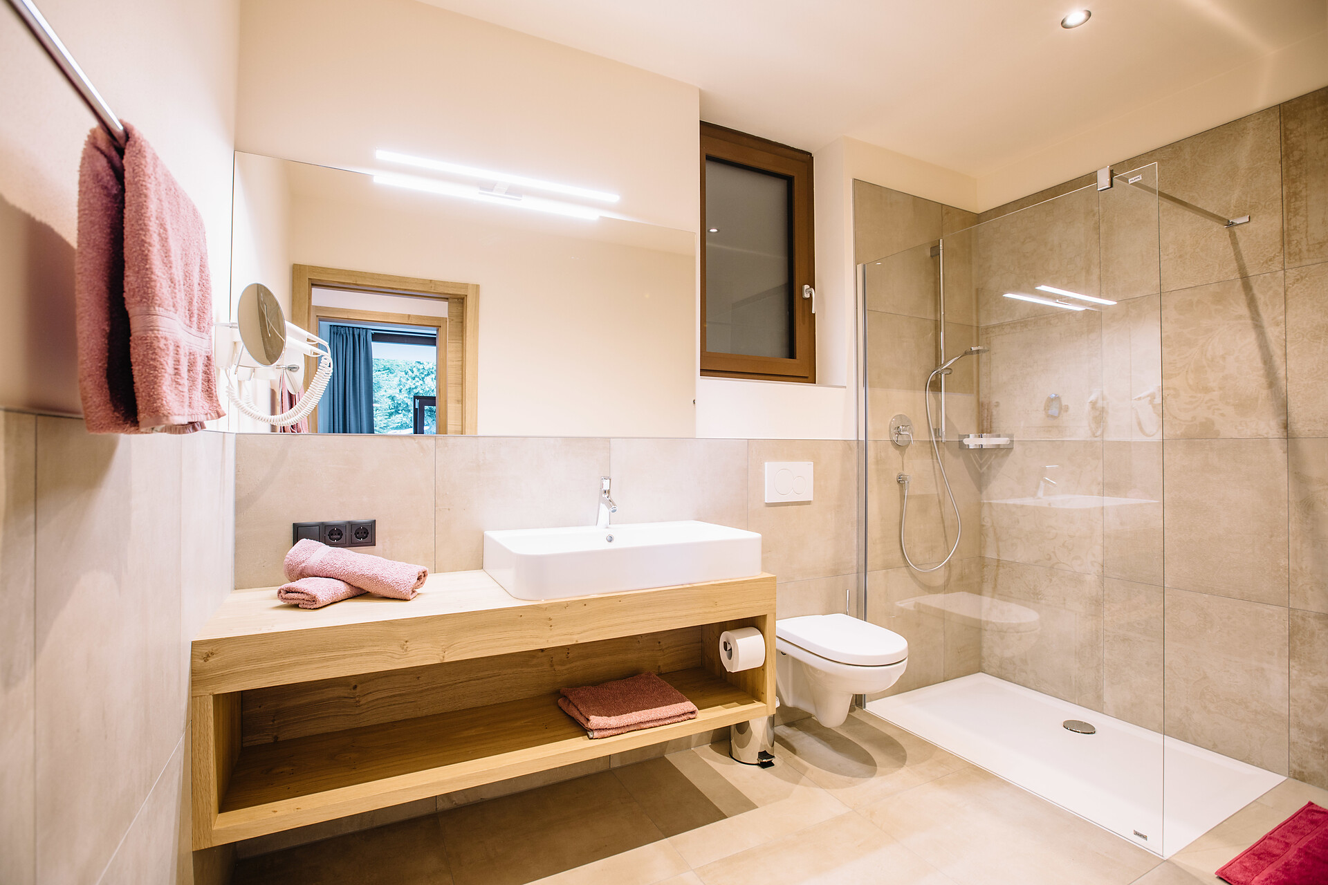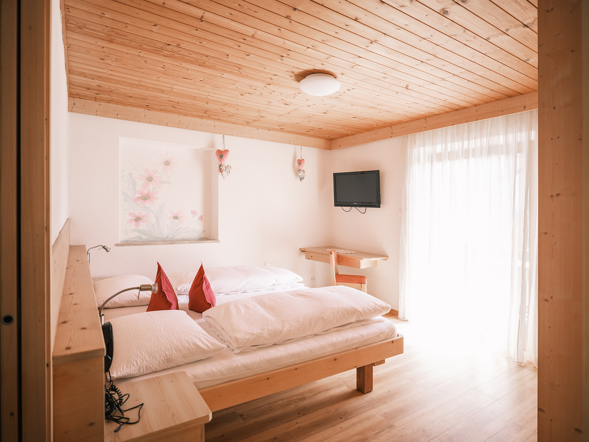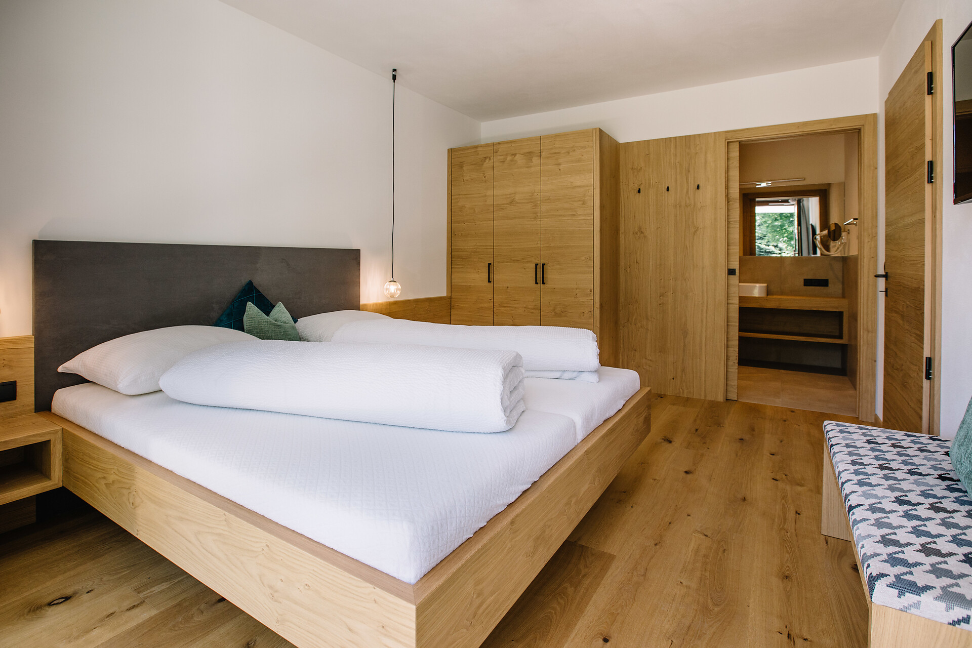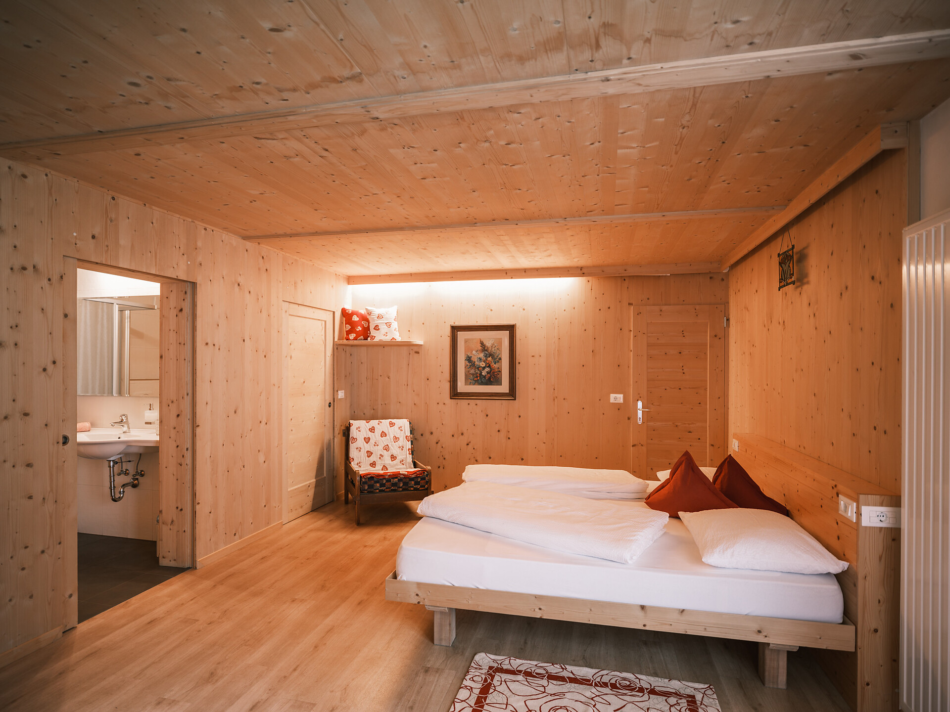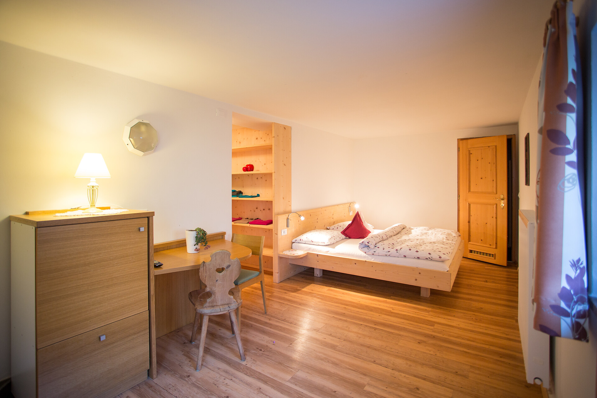 Double room with bathroom, walk-in wardrobe, and table with chair.