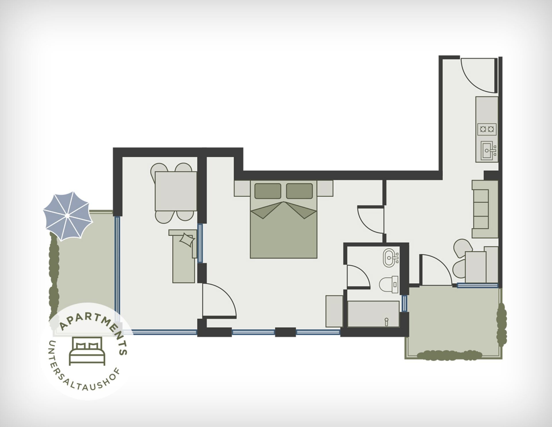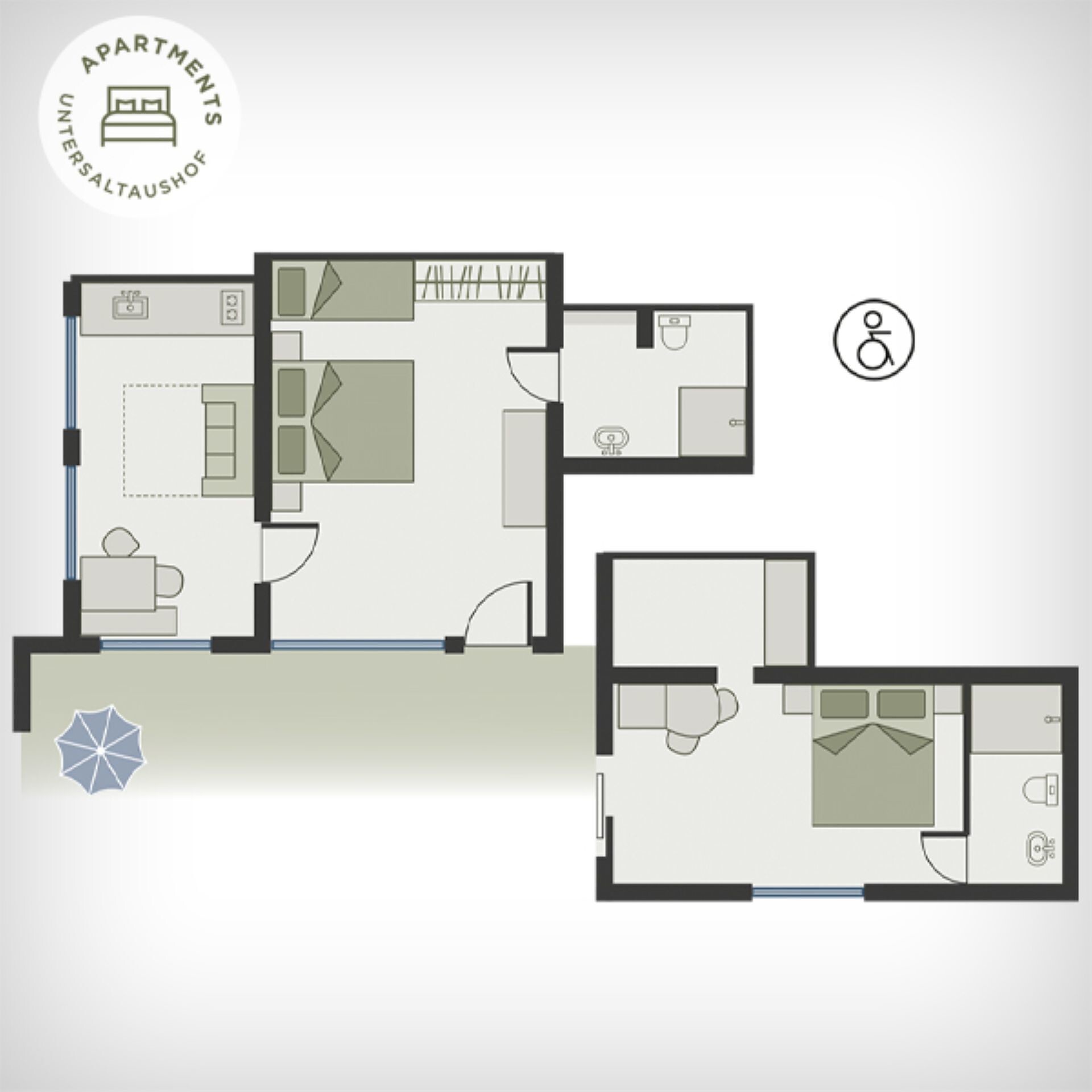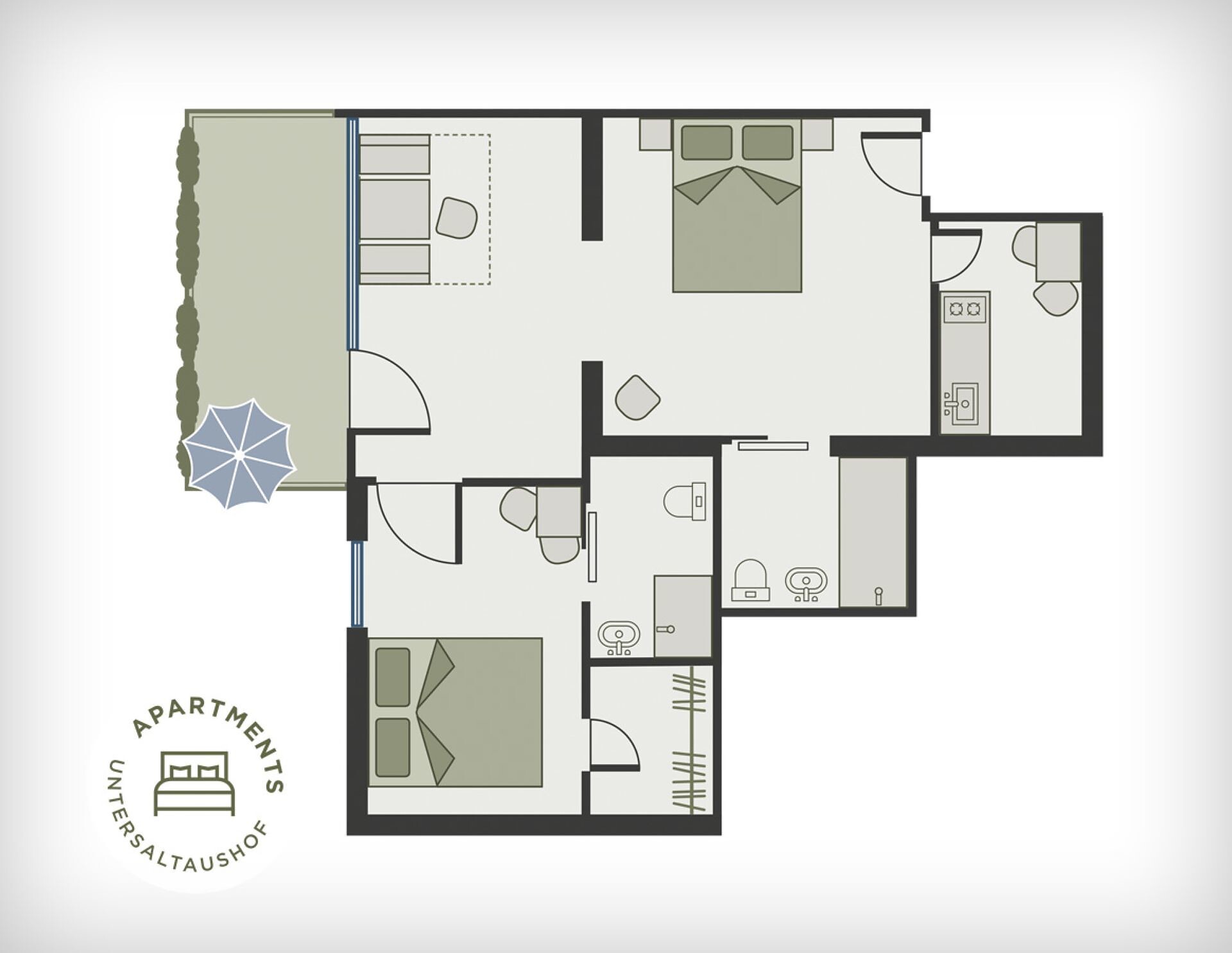 Apartment of 70m², 80m² terrace and garden, 1 twin room, 1 double or twin room, 1 shower/WC, eat-in-kitchen, sofa bed, safe, SAT-TV, sitting area, crockery and kitchenware, dishwasher, coffee machine, hair dryer.