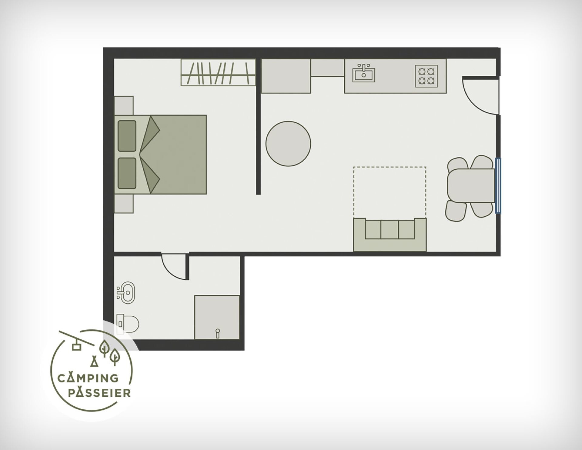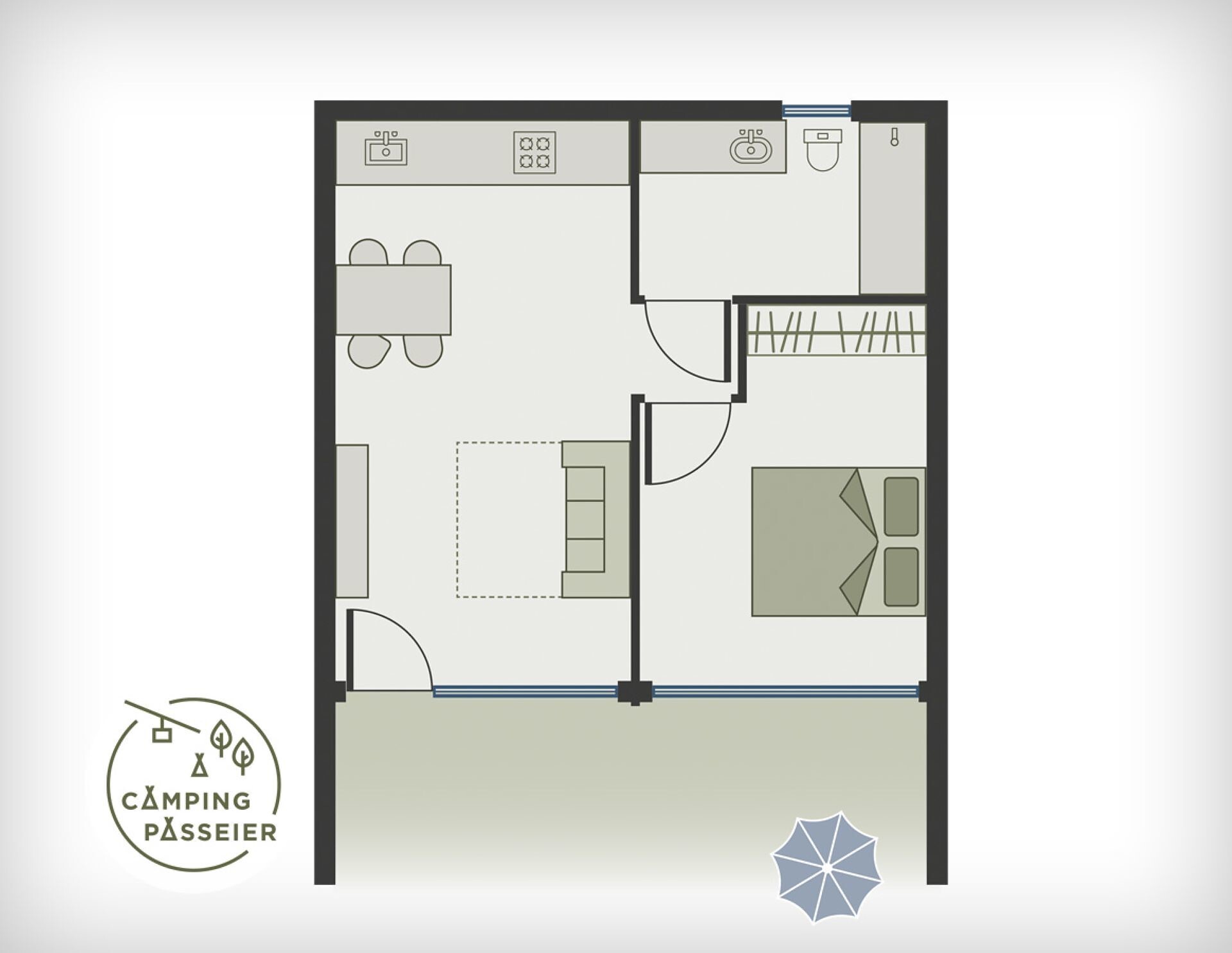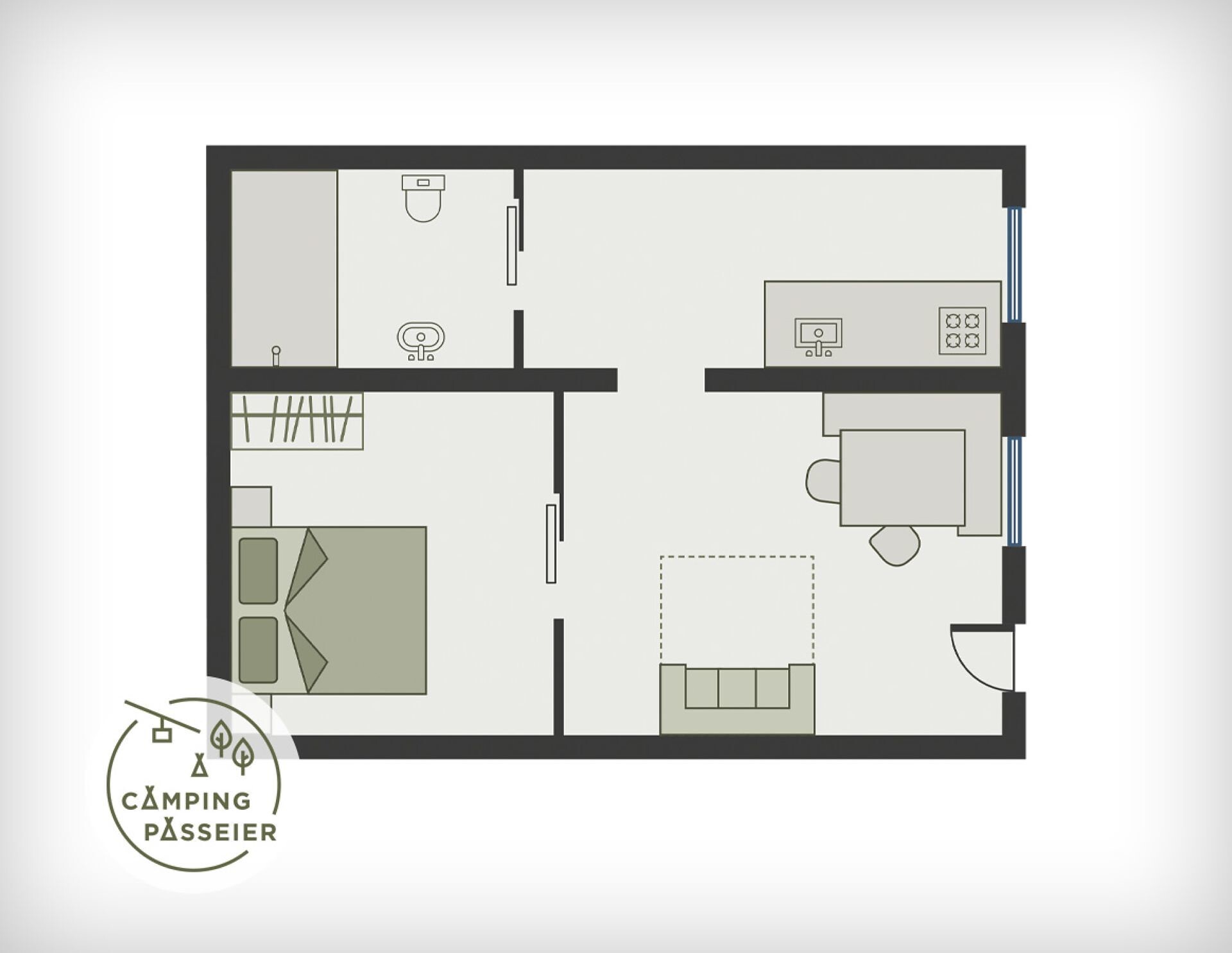 This 45 m² apartment is on the campsite! Comprising kitchen, living room and, separated by a partition, bedroom, sofa, sitting area, shower / WC, SAT / TV, single storey, dining & cookware, sitting area in front of the apartment.