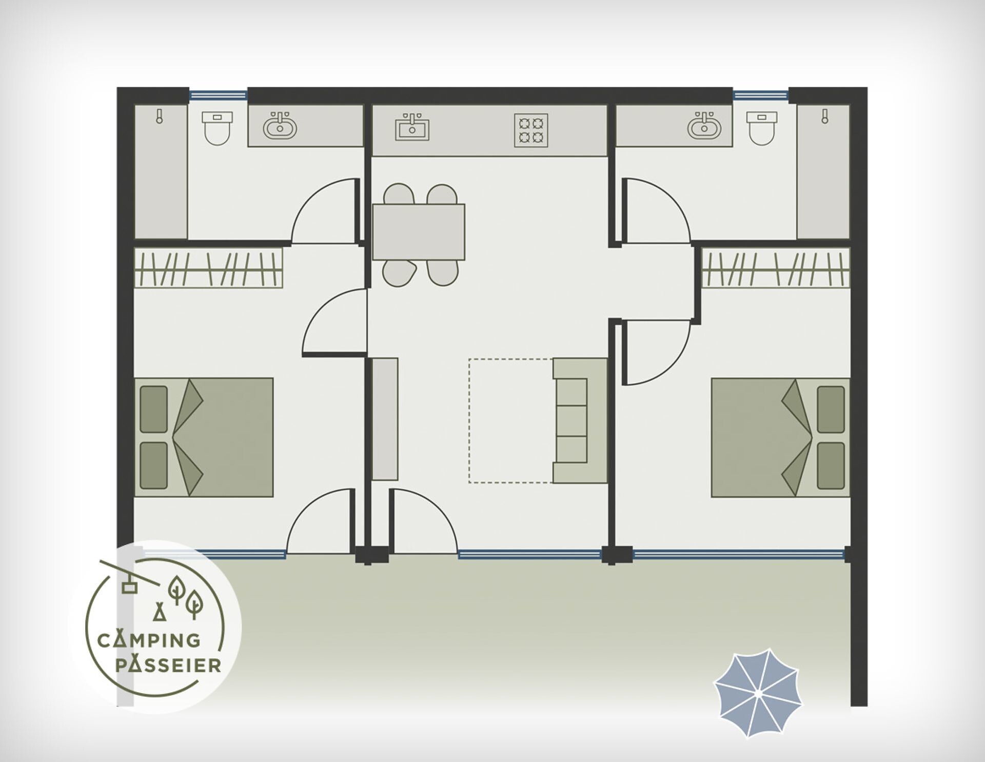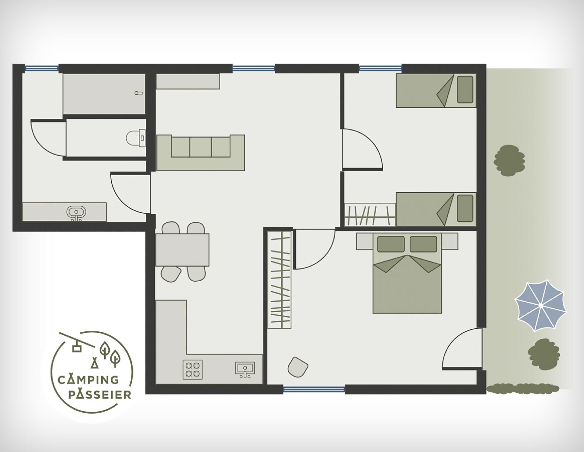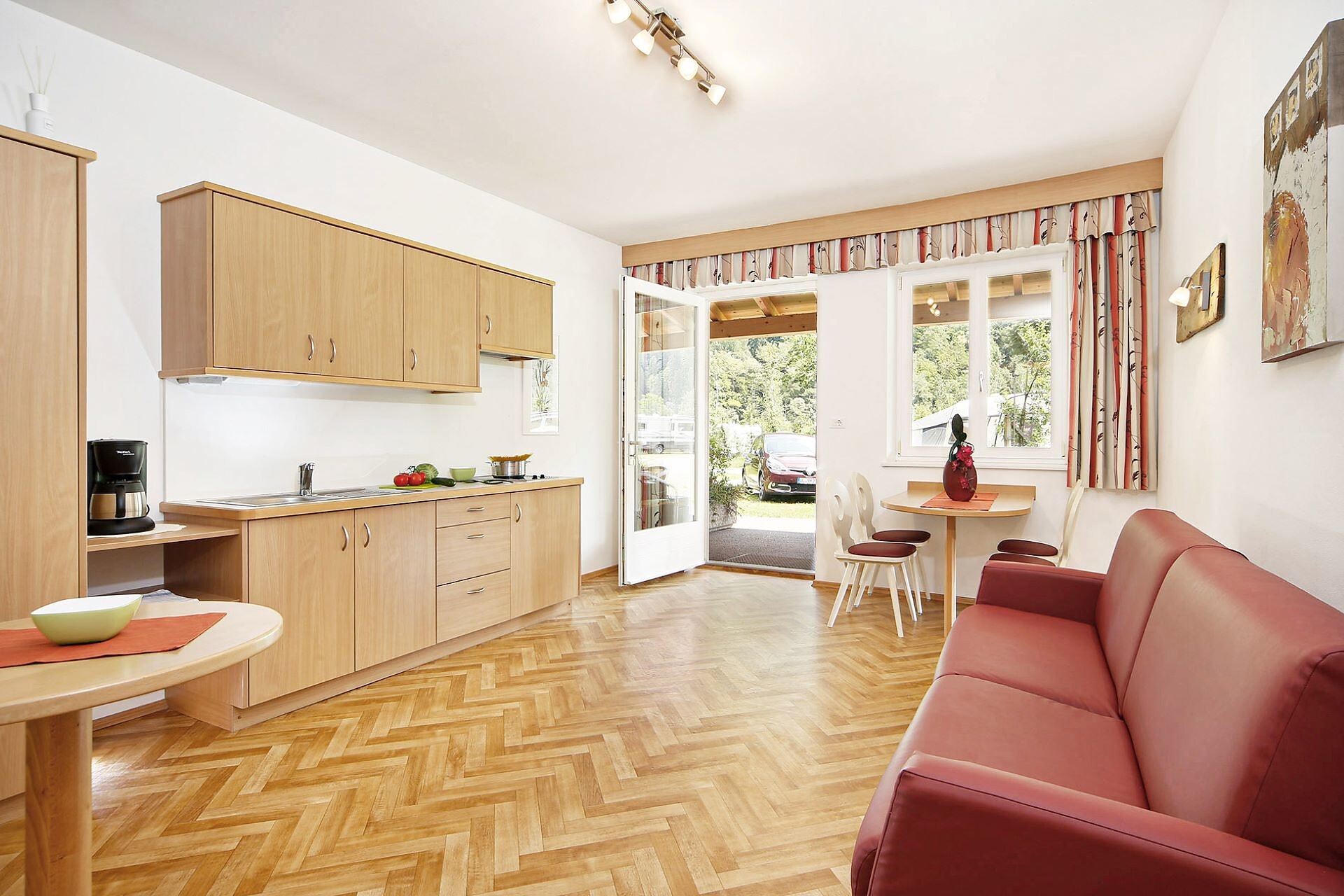 This 45 m² apartment is on the campsite! Comprising kitchen, living room and, separated by a partition, bedroom, sofa, sitting area, shower / WC, SAT / TV, single storey, dining & cookware, sitting area in front of the apartment.