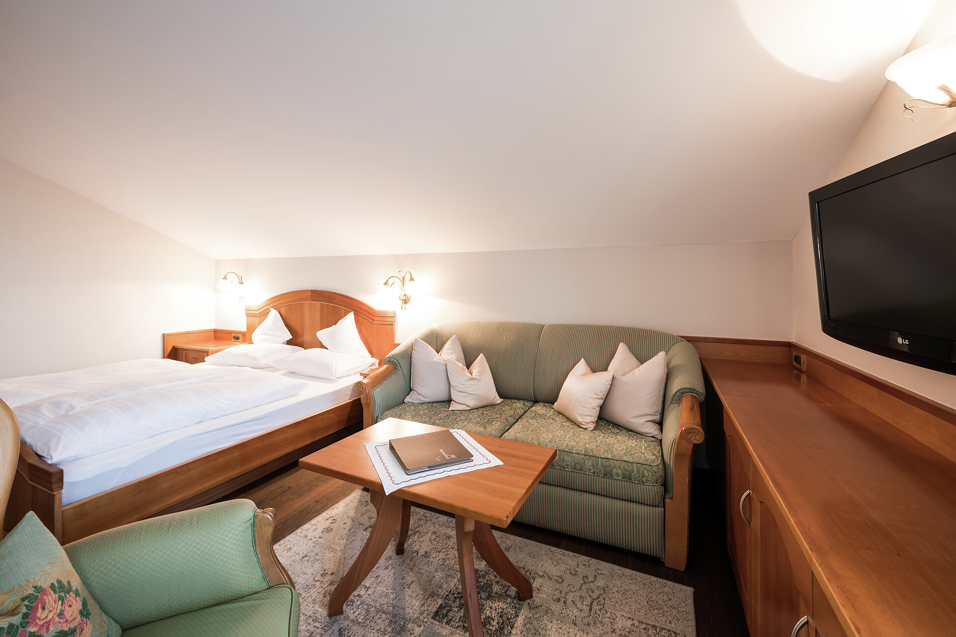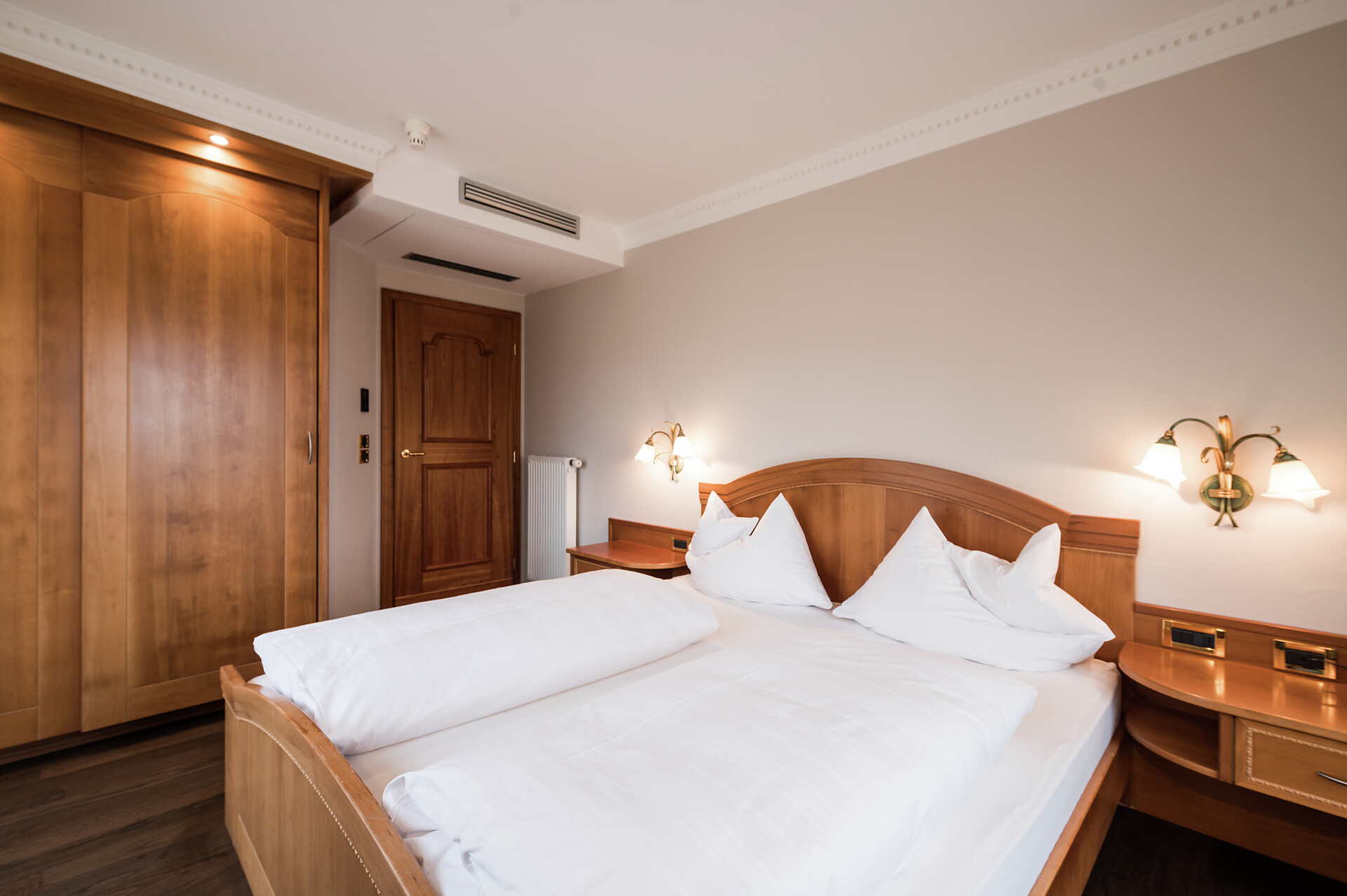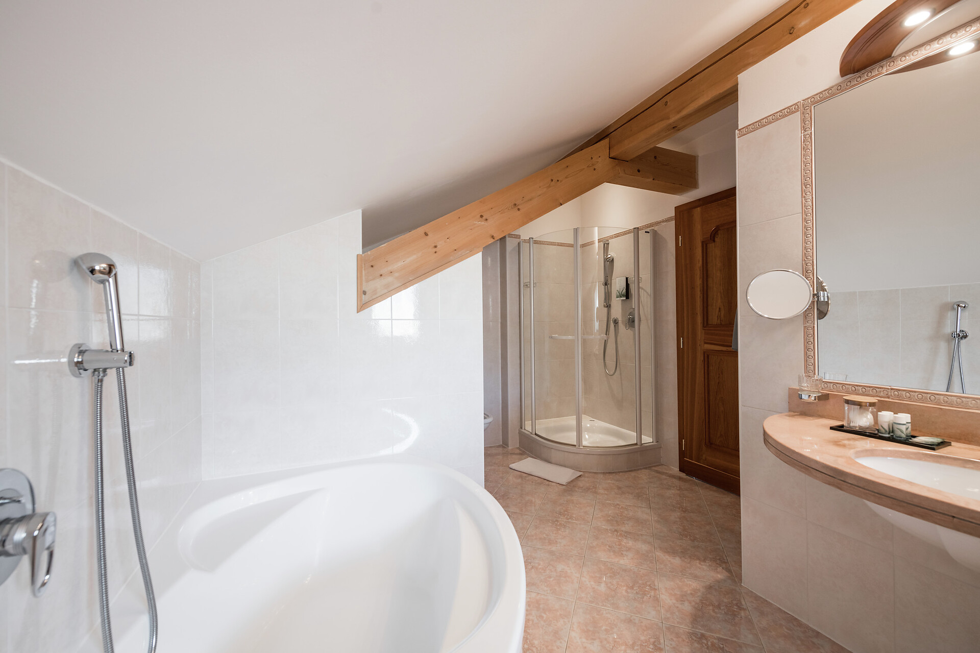 Suite (95 m²) with two separate bedrooms, spacious living room, bath and shower, separate WC/bidet, double washbasin, hairdryer, make-up mirror, bath robes and slippers, flat-screen satellite TV, telephone, radio, safe, minibar, internet access, air conditioning and a large roof terrace with whirlpool as well as a southwest-facing balcony with a fabulous panoramic view of Merano and the surrounding mountain region.