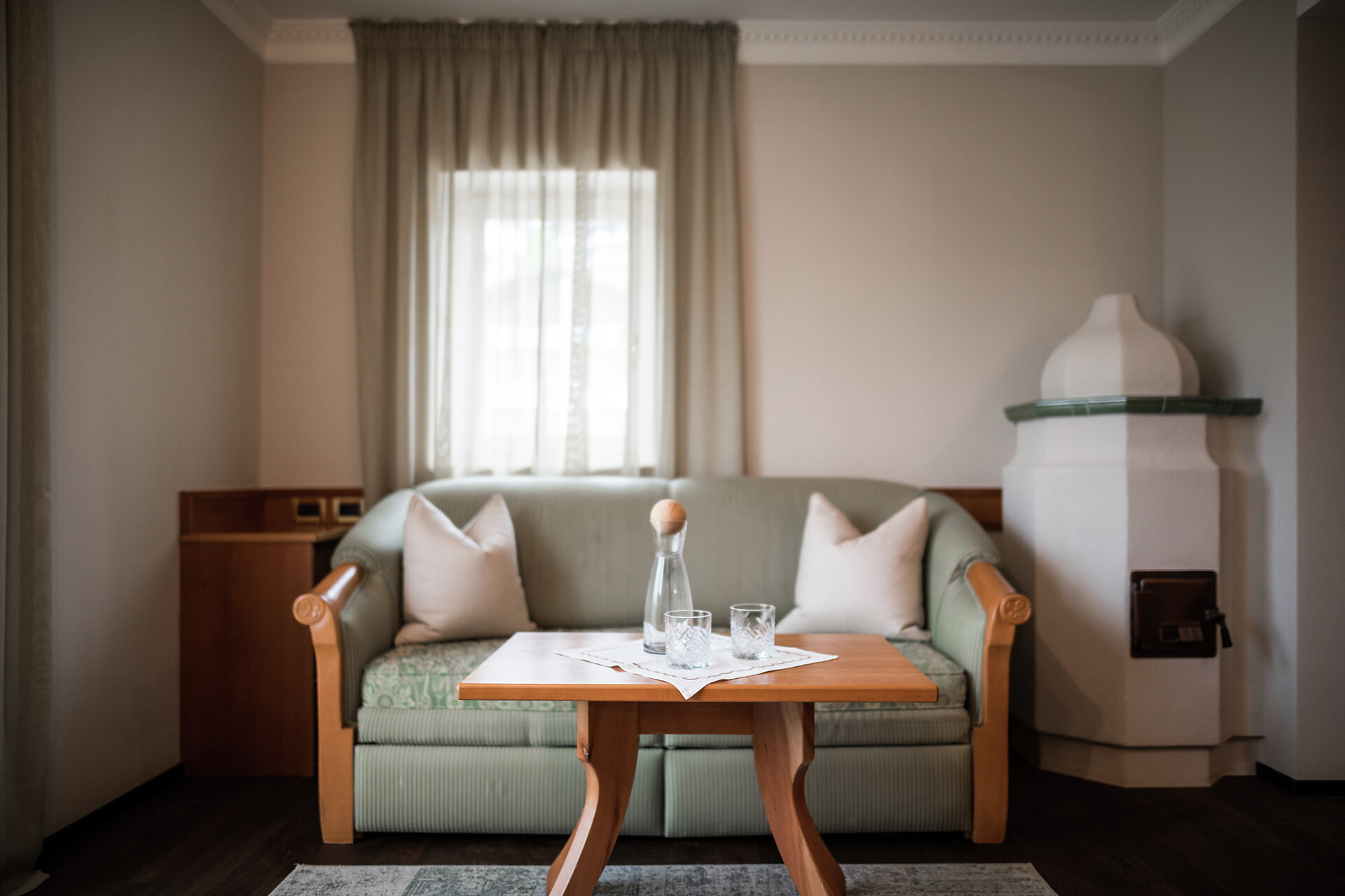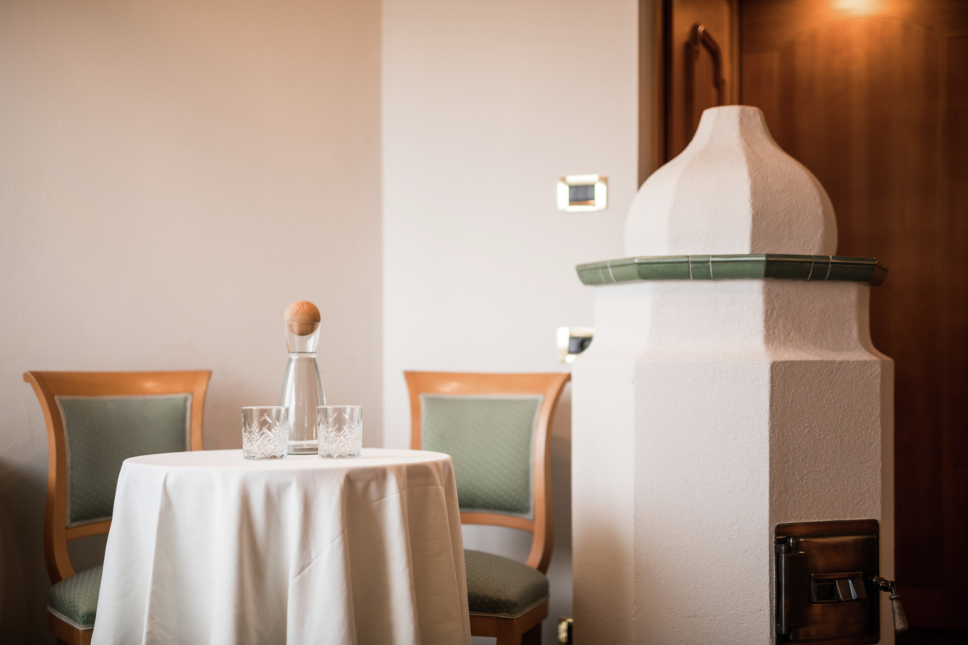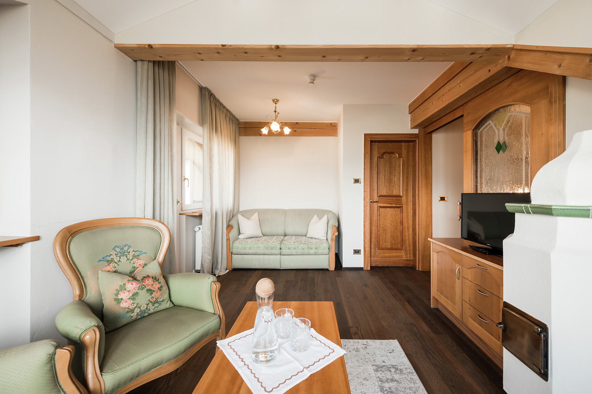 Suite (95 m²) with two separate bedrooms, spacious living room, bath and shower, separate WC/bidet, double washbasin, hairdryer, make-up mirror, bath robes and slippers, flat-screen satellite TV, telephone, radio, safe, minibar, internet access, air conditioning and a large roof terrace with whirlpool as well as a southwest-facing balcony with a fabulous panoramic view of Merano and the surrounding mountain region.