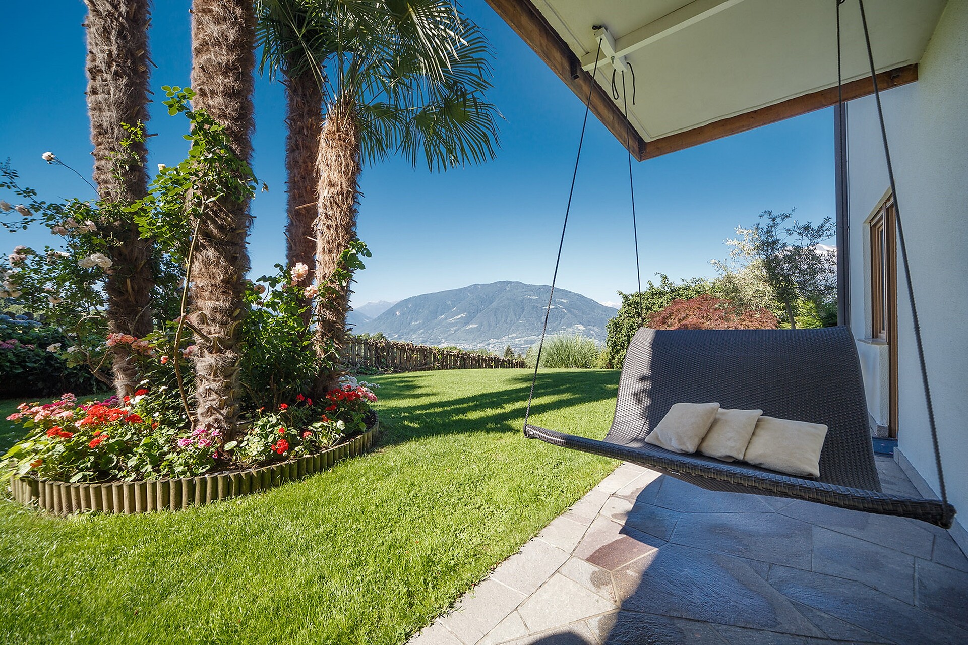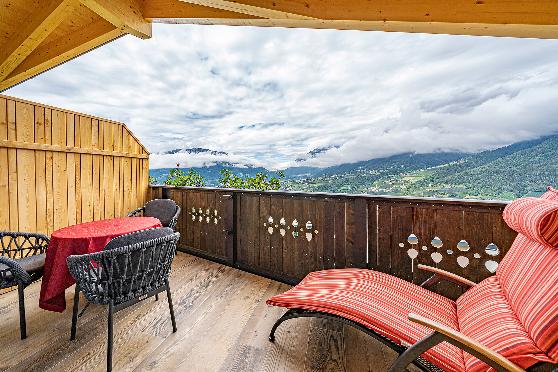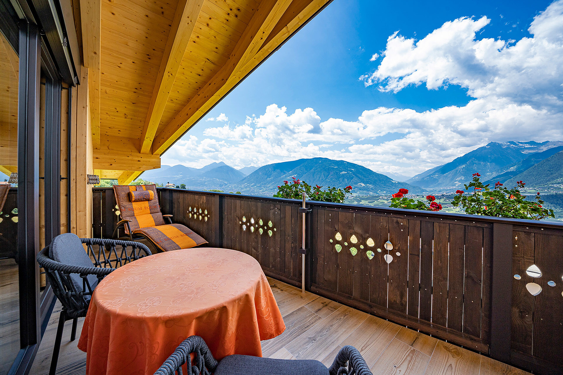 New, modern apartment für 1-5 persons with west-facing balcony with a fantastic view over the Meraner Land and the Texel Group. 55 qm. Bedroom - living room with panoramic window, large family table, comfortable reading chair, WiFi, satellite TV and safe, fully equipped kitchenette with dishwasher, coffee machine and toaster, separates bedrooms. Bathroom with walk-in rain shower, toilet and bidet and hair dryer as well as an additional day toilet.