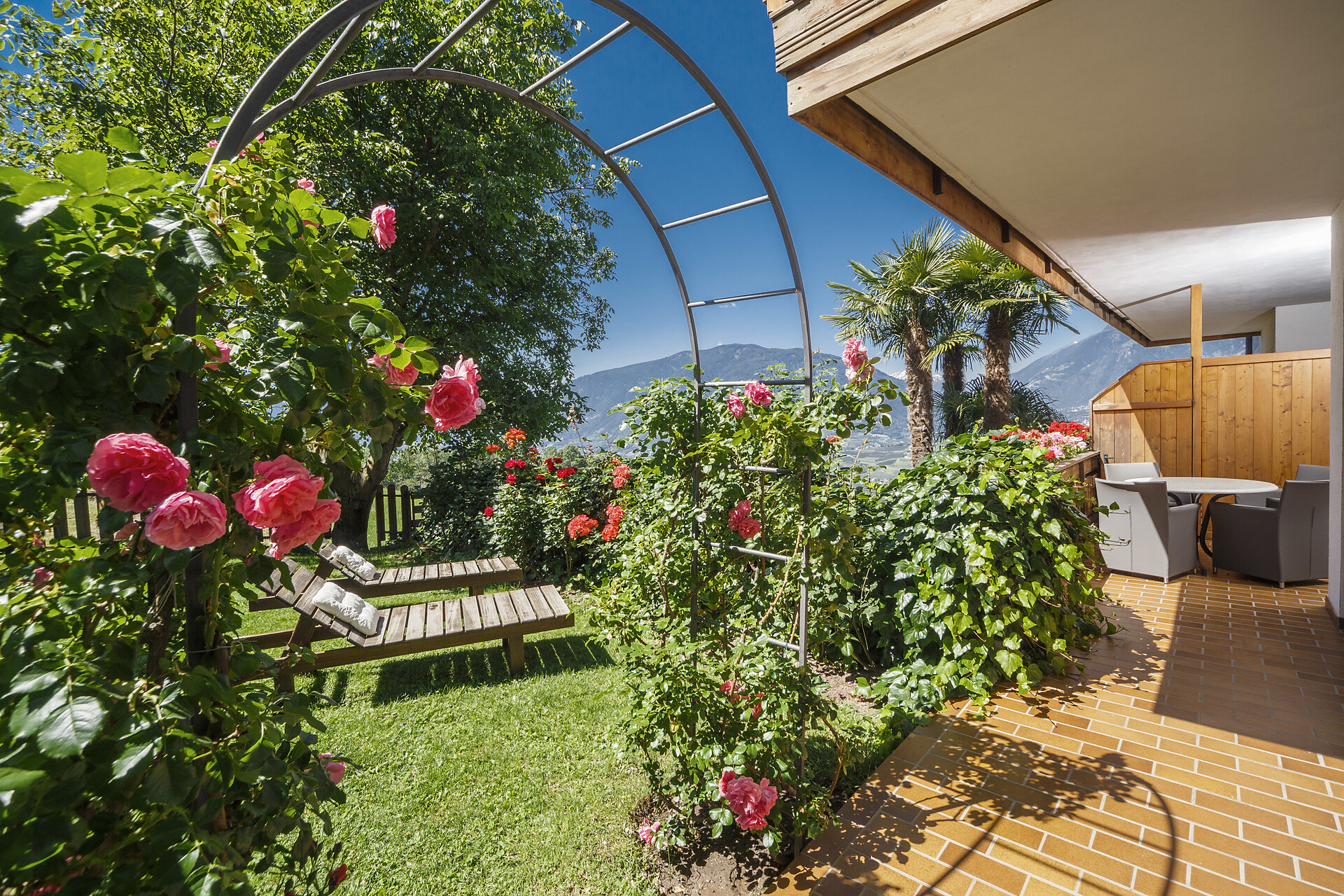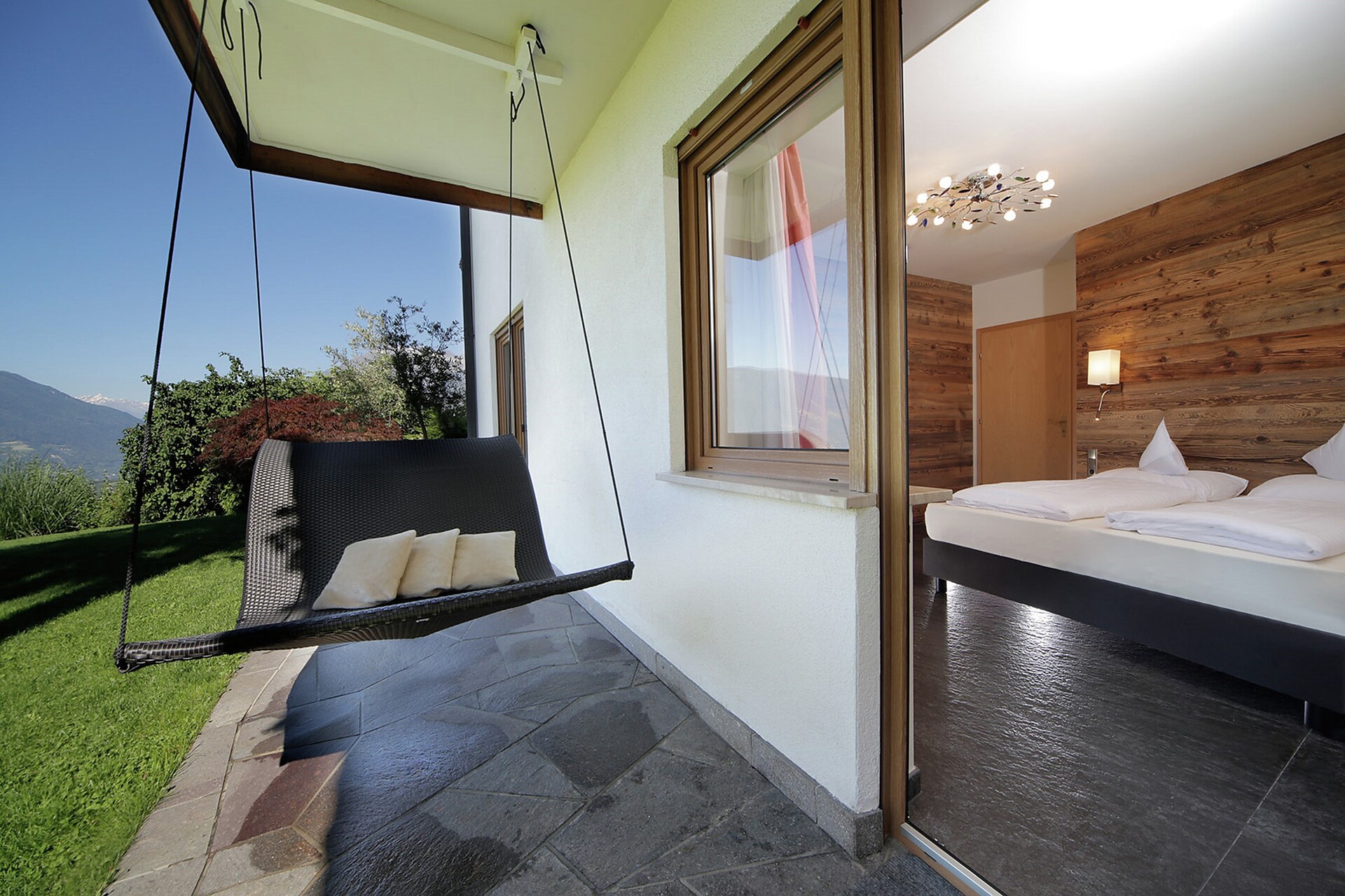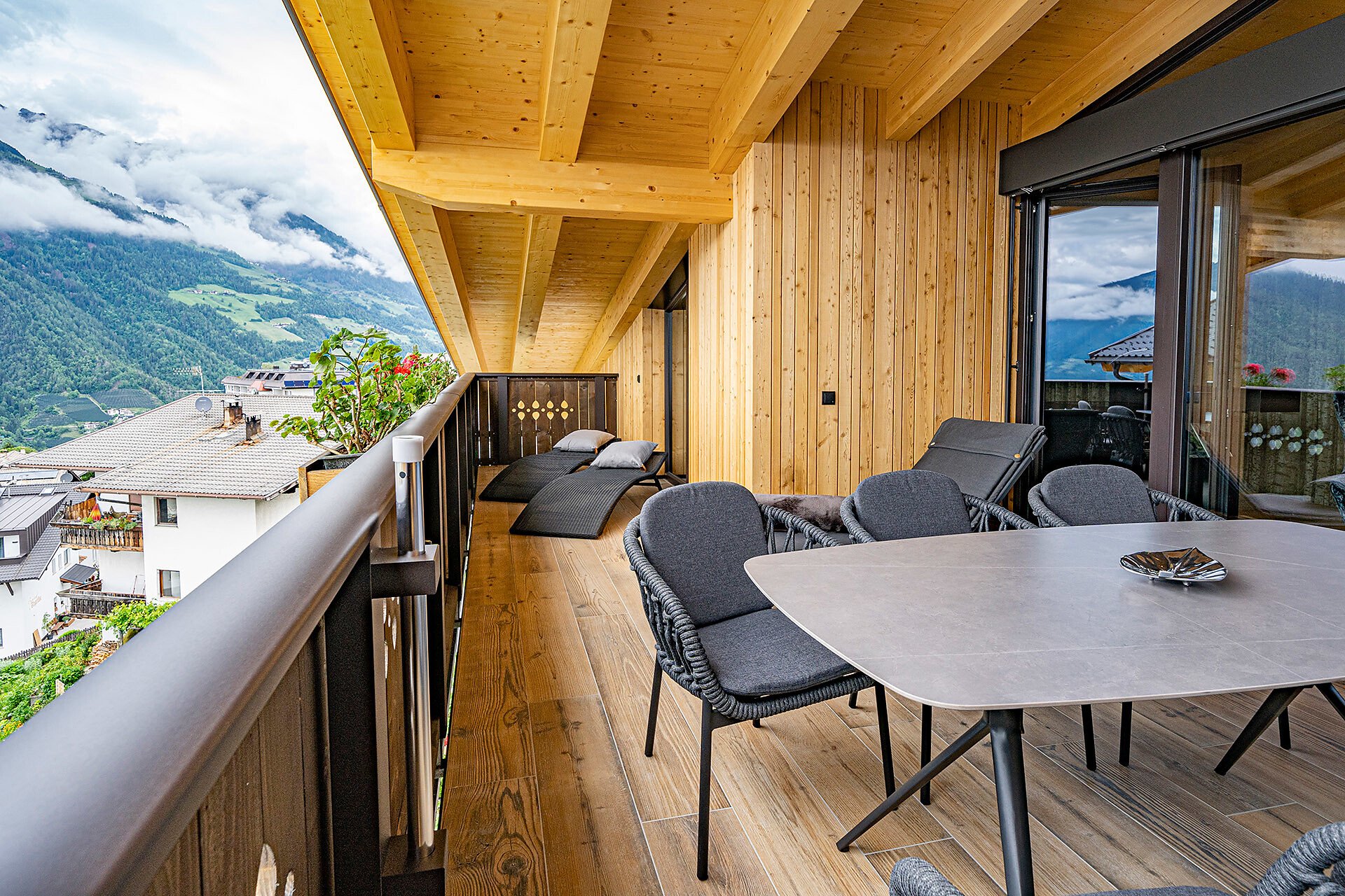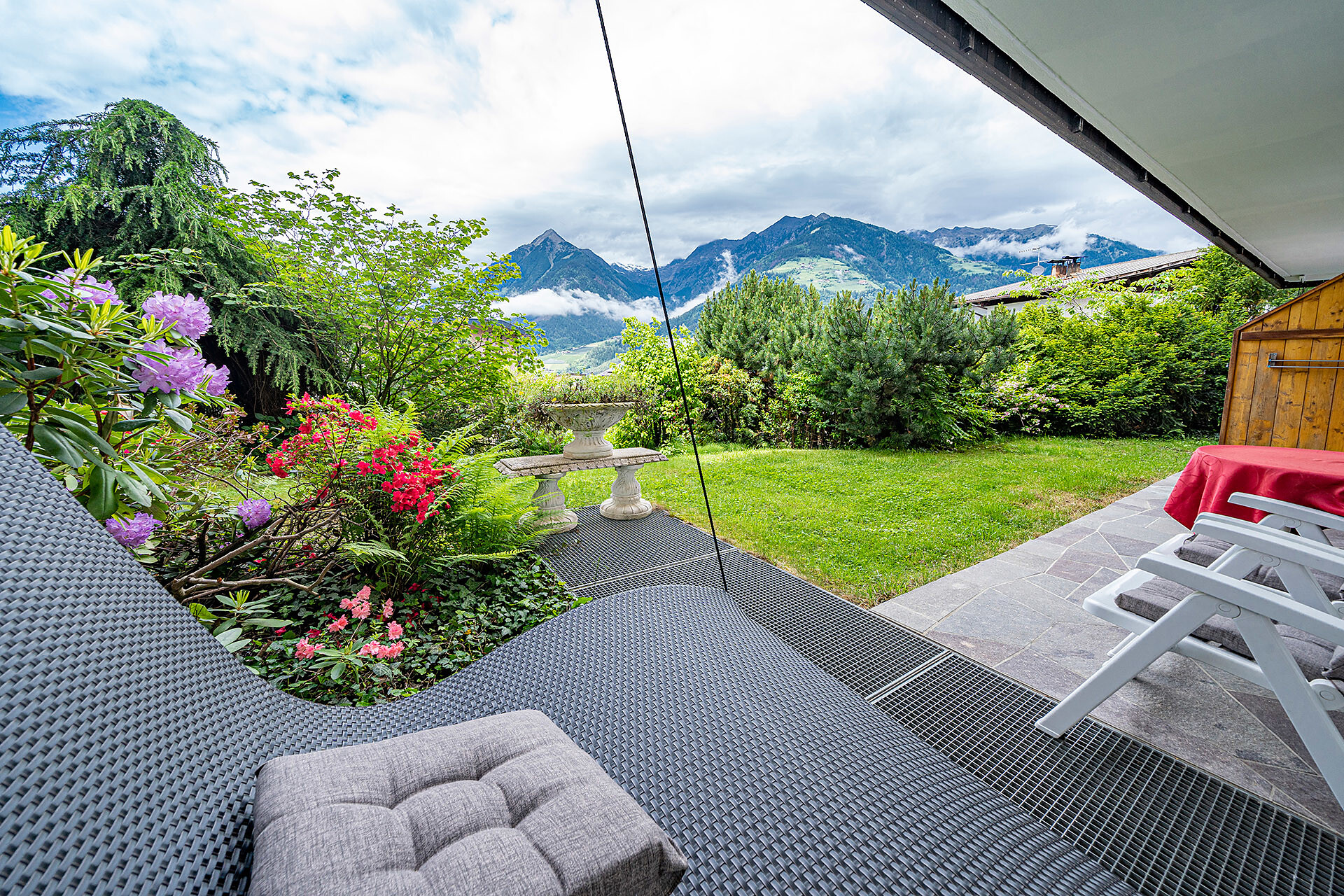 New, modern apartment für 1-5 persons with west-facing balcony with a fantastic view over the Meraner Land and the Texel Group. 55 qm. Bedroom - living room with panoramic window, large family table, comfortable reading chair, WiFi, satellite TV and safe, fully equipped kitchenette with dishwasher, coffee machine and toaster, separates bedrooms. Bathroom with walk-in rain shower, toilet and bidet and hair dryer as well as an additional day toilet.