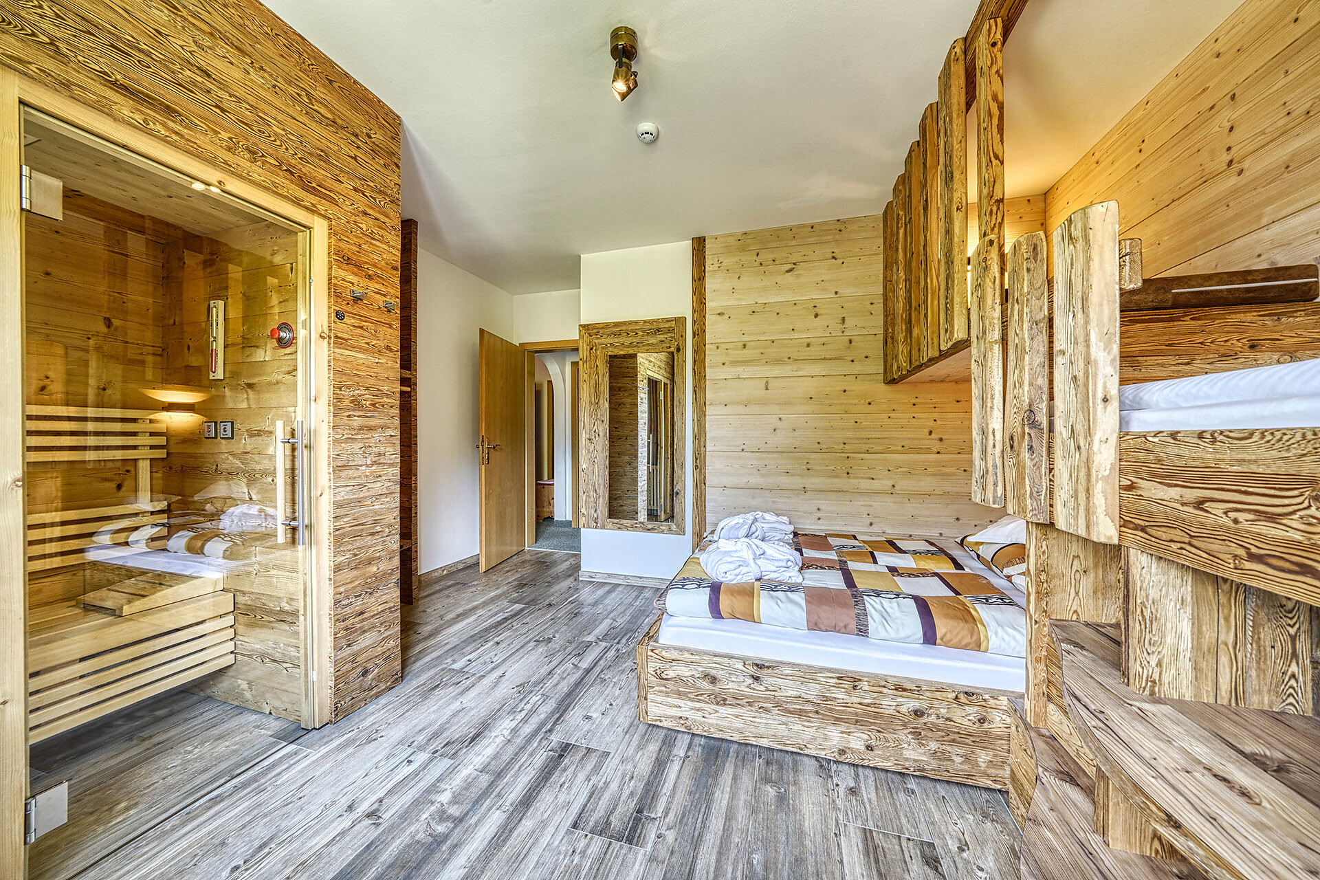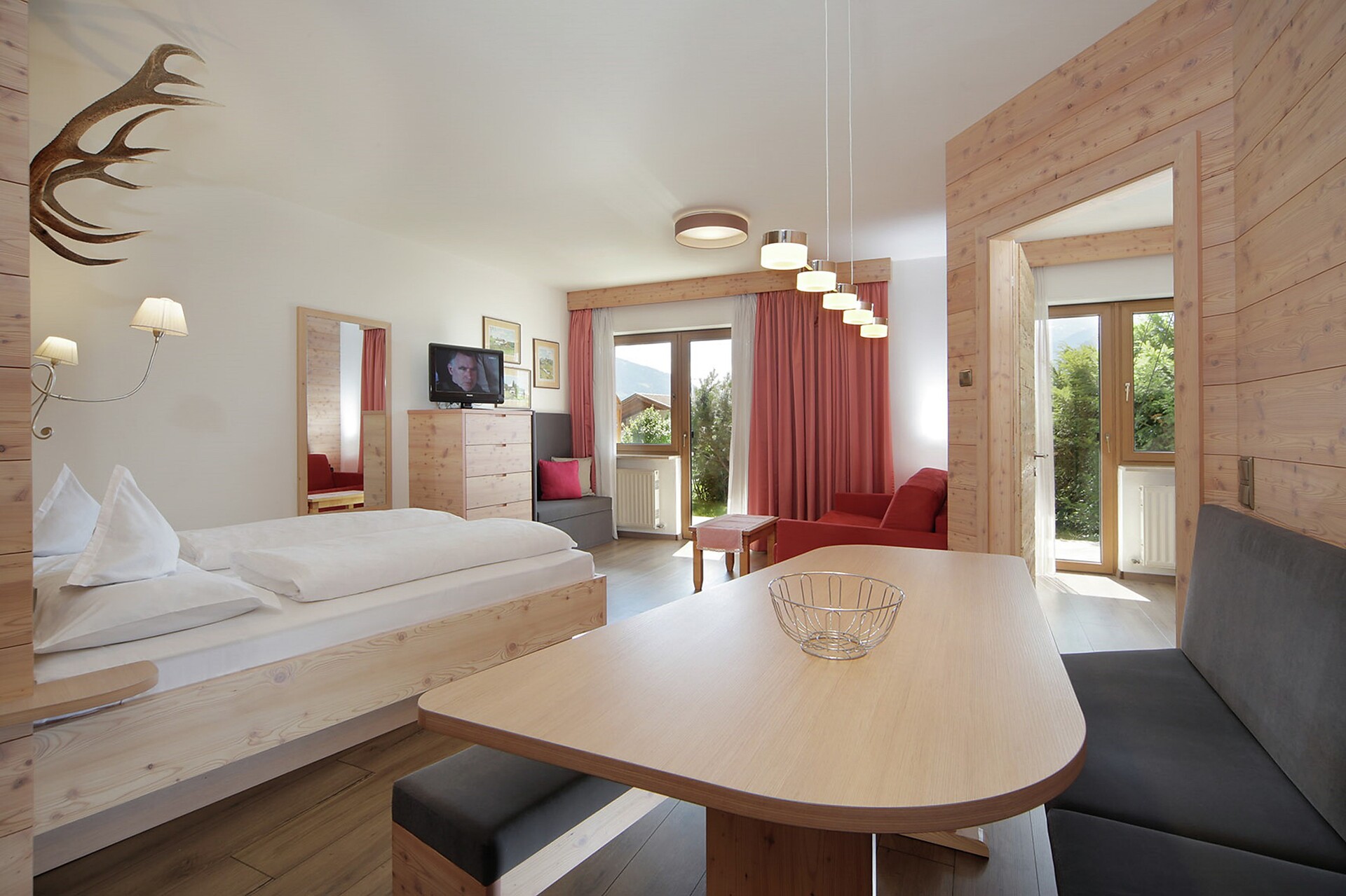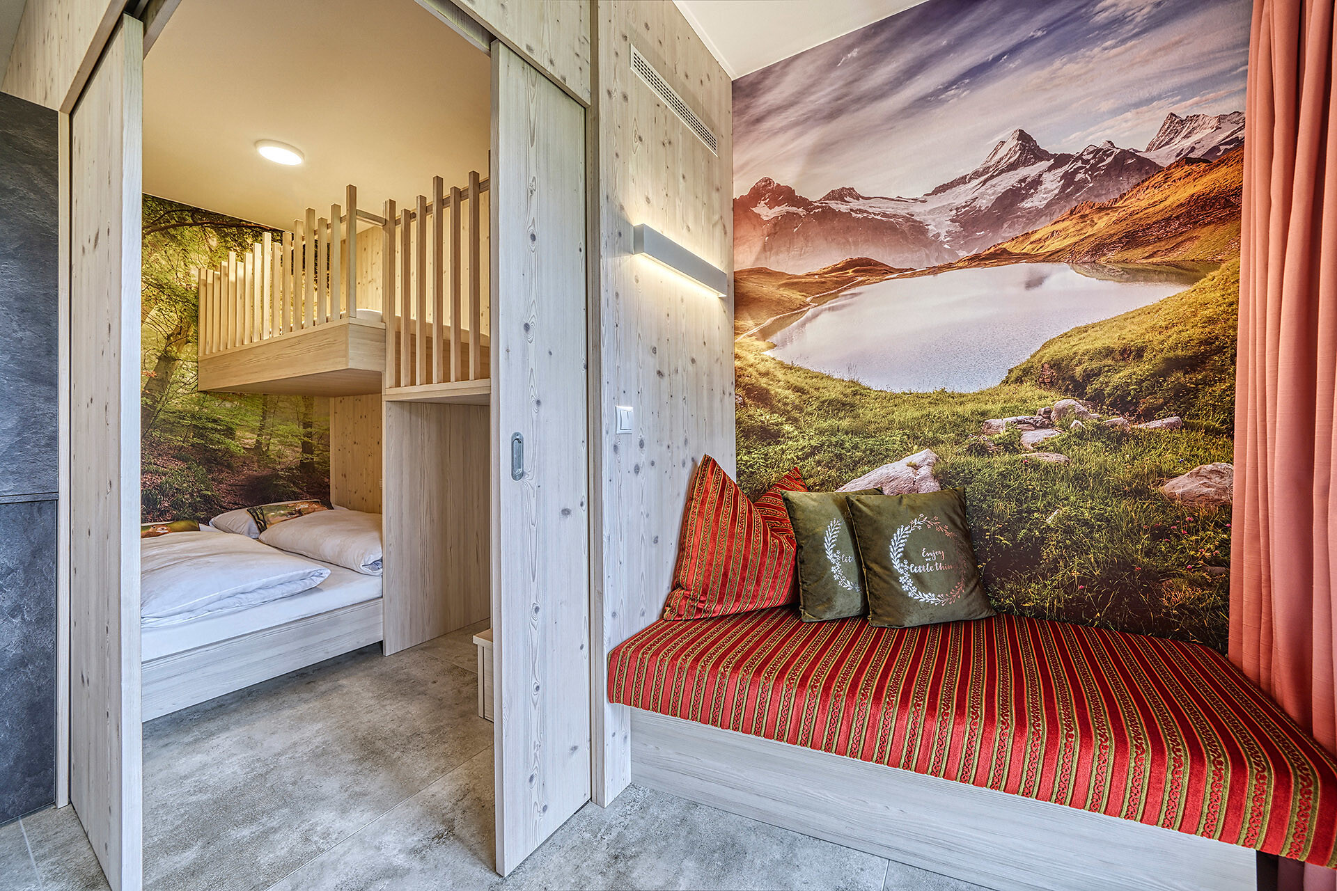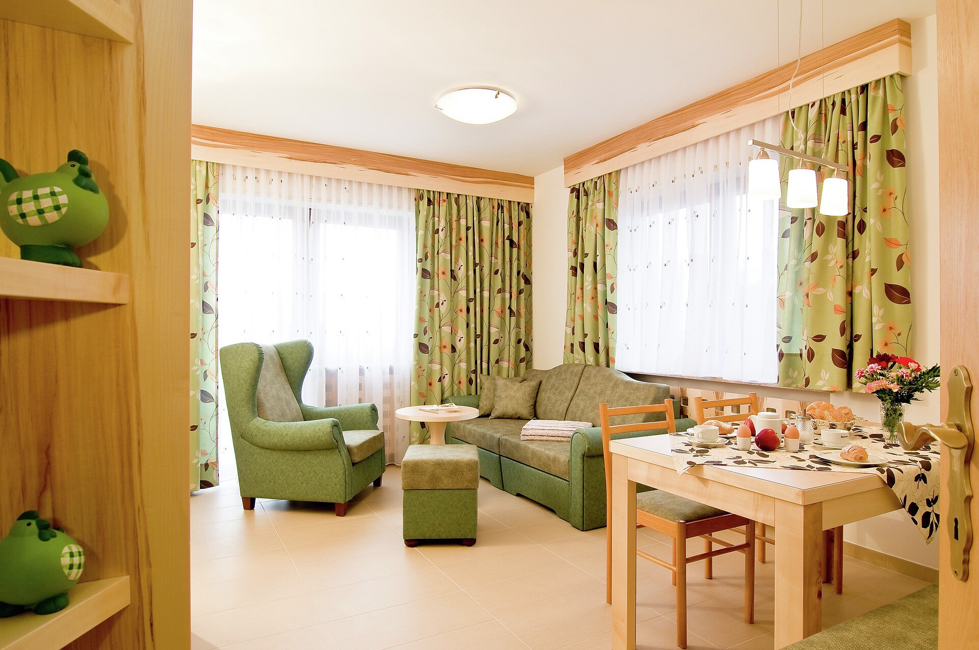 Our spacious holiday apartments can sleep up to six people. Each apartment has a balcony or a terrace. The welcoming ambience ensures guests feel at home. Each apartment has an extendable couch and a seating area. The price includes the use of all the hotel’s infrastructure, the wellness area, indoor swimming pool and provision of childcare.