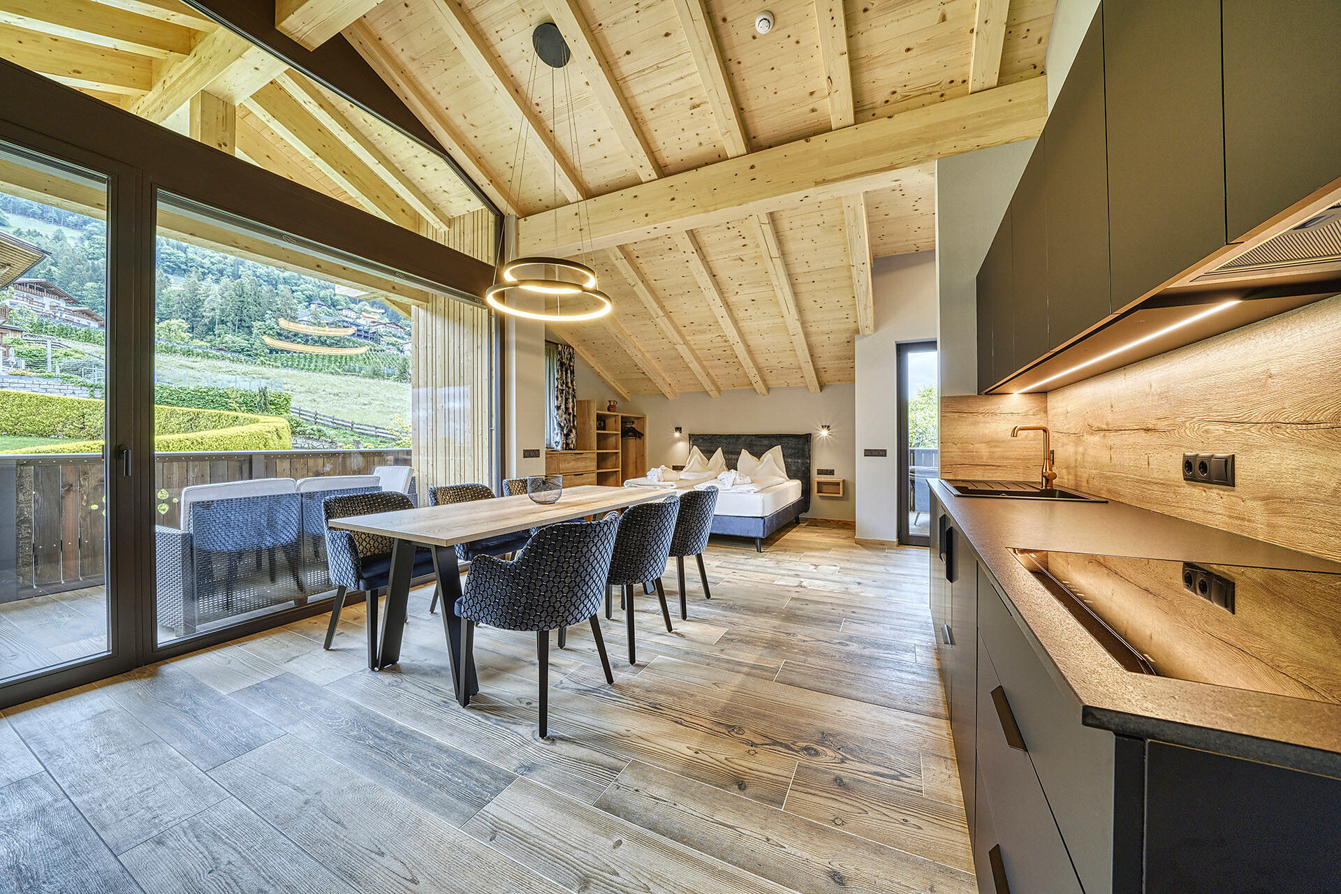 New, modern family apartment (100 m2) for 3-6 persons with a 15 m2 balcony on the west side with a dream view over the Meraner Land and the Texel Group. 99 qm. 3 bedrooms, 2 bathrooms with walk-in rain shower, toilet and bidet and hairdryer. Large living area (49 m2) with panoramic windows, XXL family table, fully equipped kitchen with dishwasher, coffee maker, toaster and modern cooking island. W-Lan and couch with satellite TV.