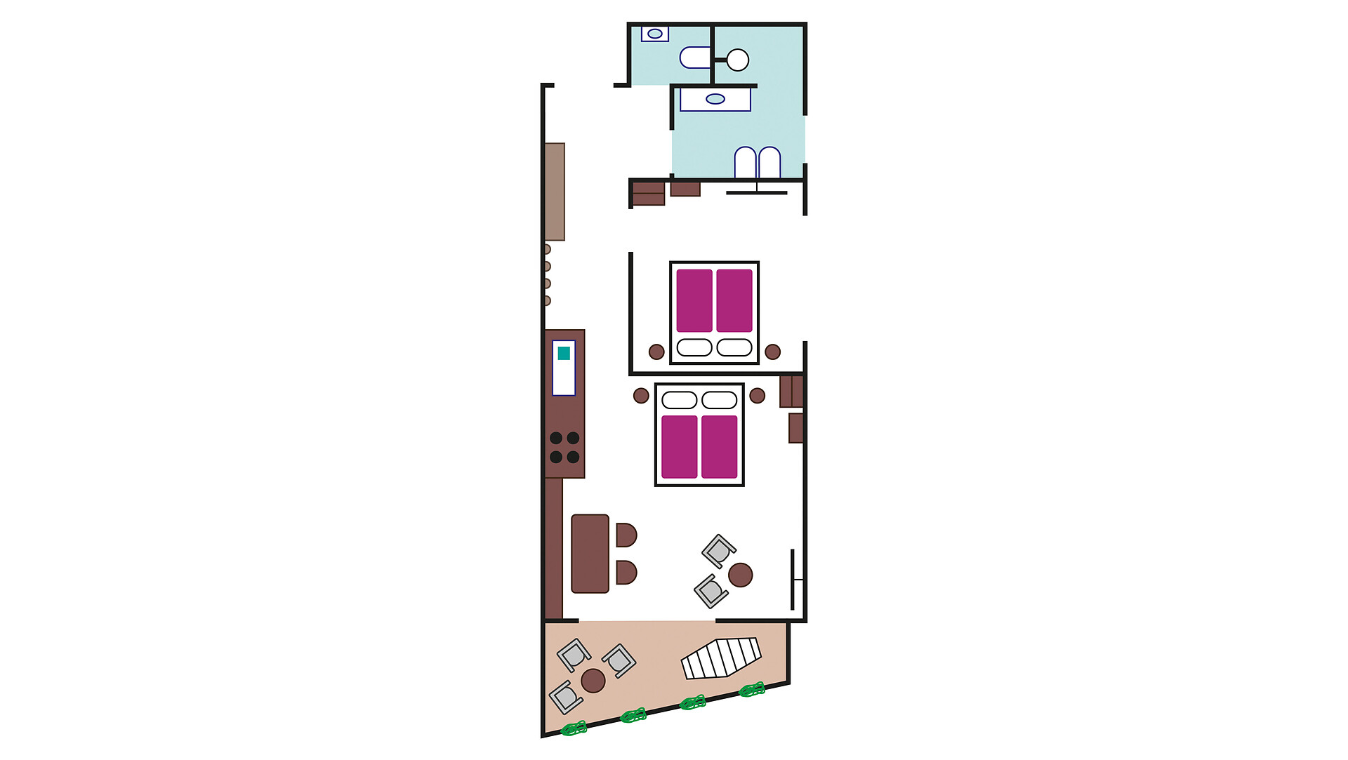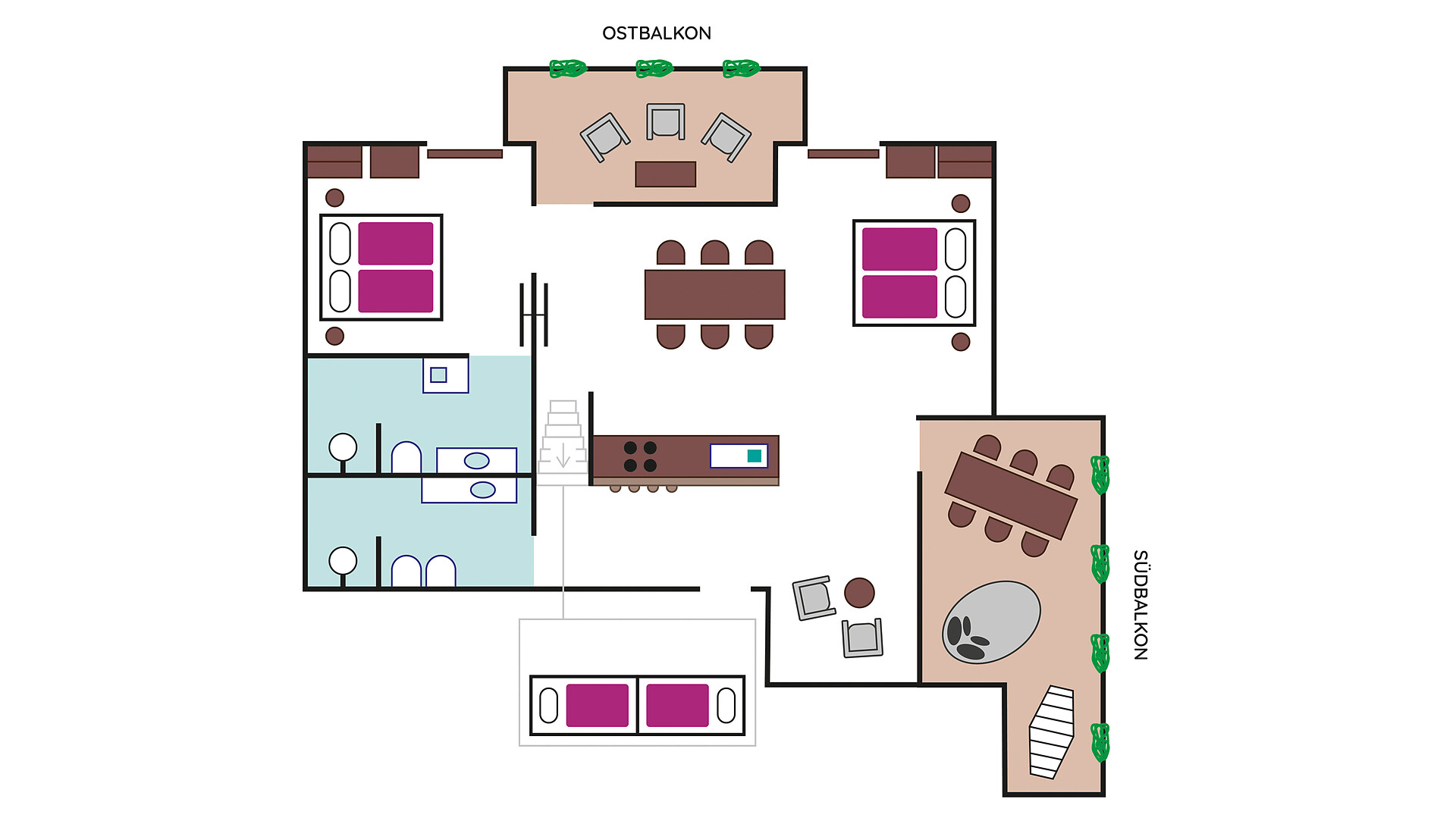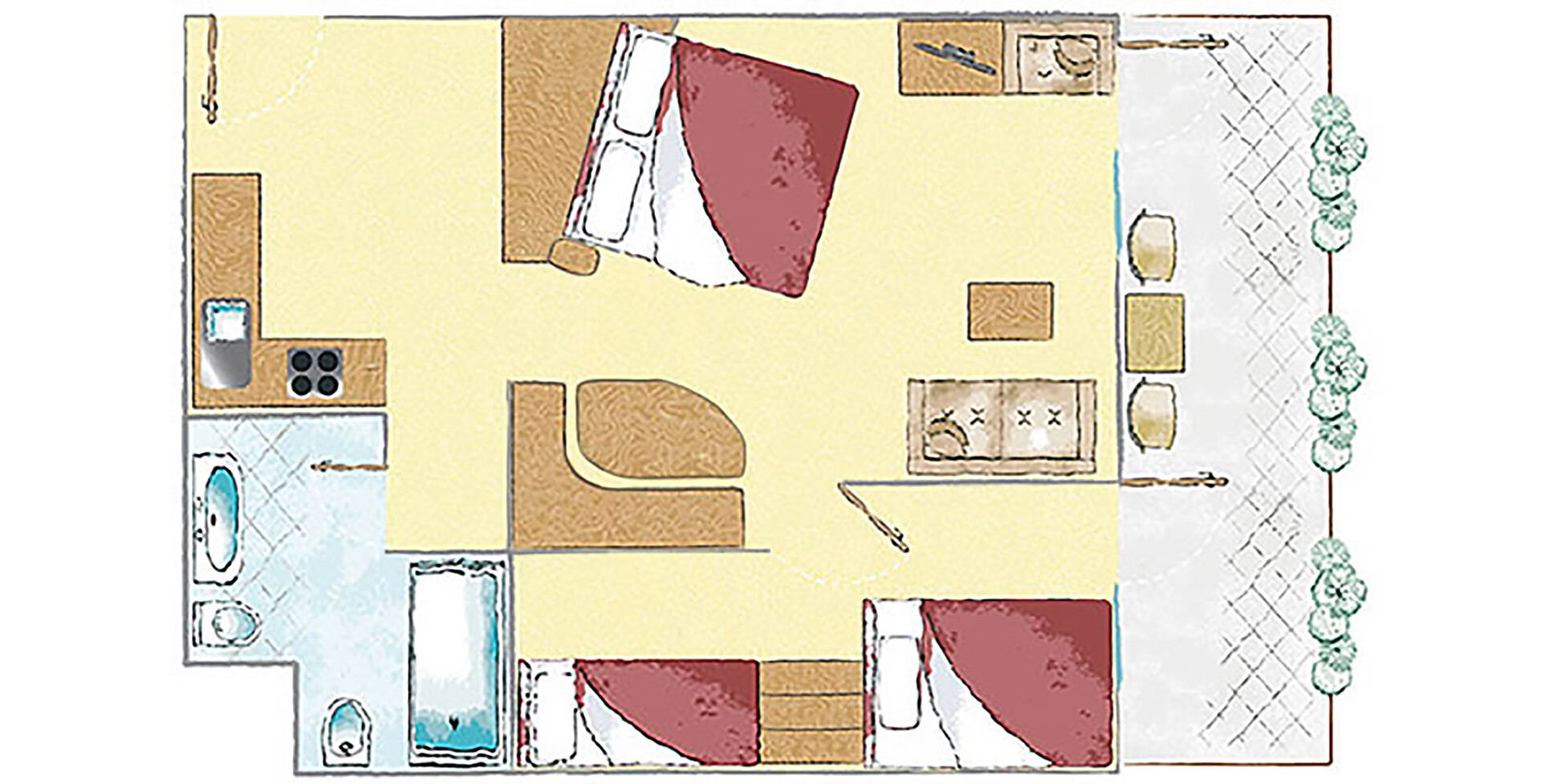 South and west side 50 m² Living room with kitchenette, bedroom, bathroom. Sitting corner, couch, satellite TV, safe, telephone, radio alarm clock, linen, towels, hairdryer, crockery, coffee machine, separate children's room with 2 beds