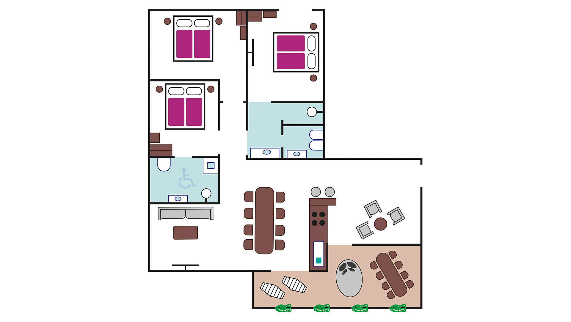 South side and west side 40 m² living room with kitchenette, bedroom, bathroom with walk in rain shower,. sitting corner, couch, satellite TV, safe, telephone, radio alarm clock, linen, towels, hairdryer, crockery, coffee machine, separate children's room with 2 beds.