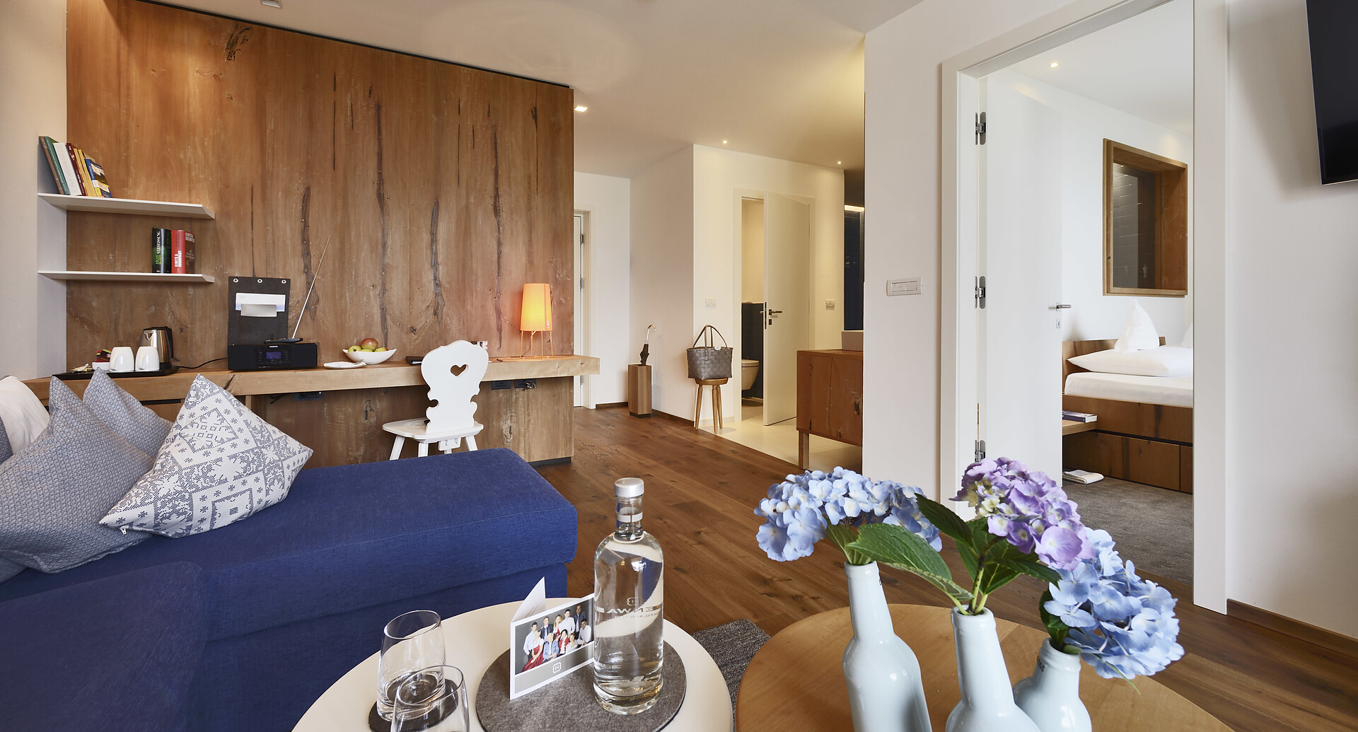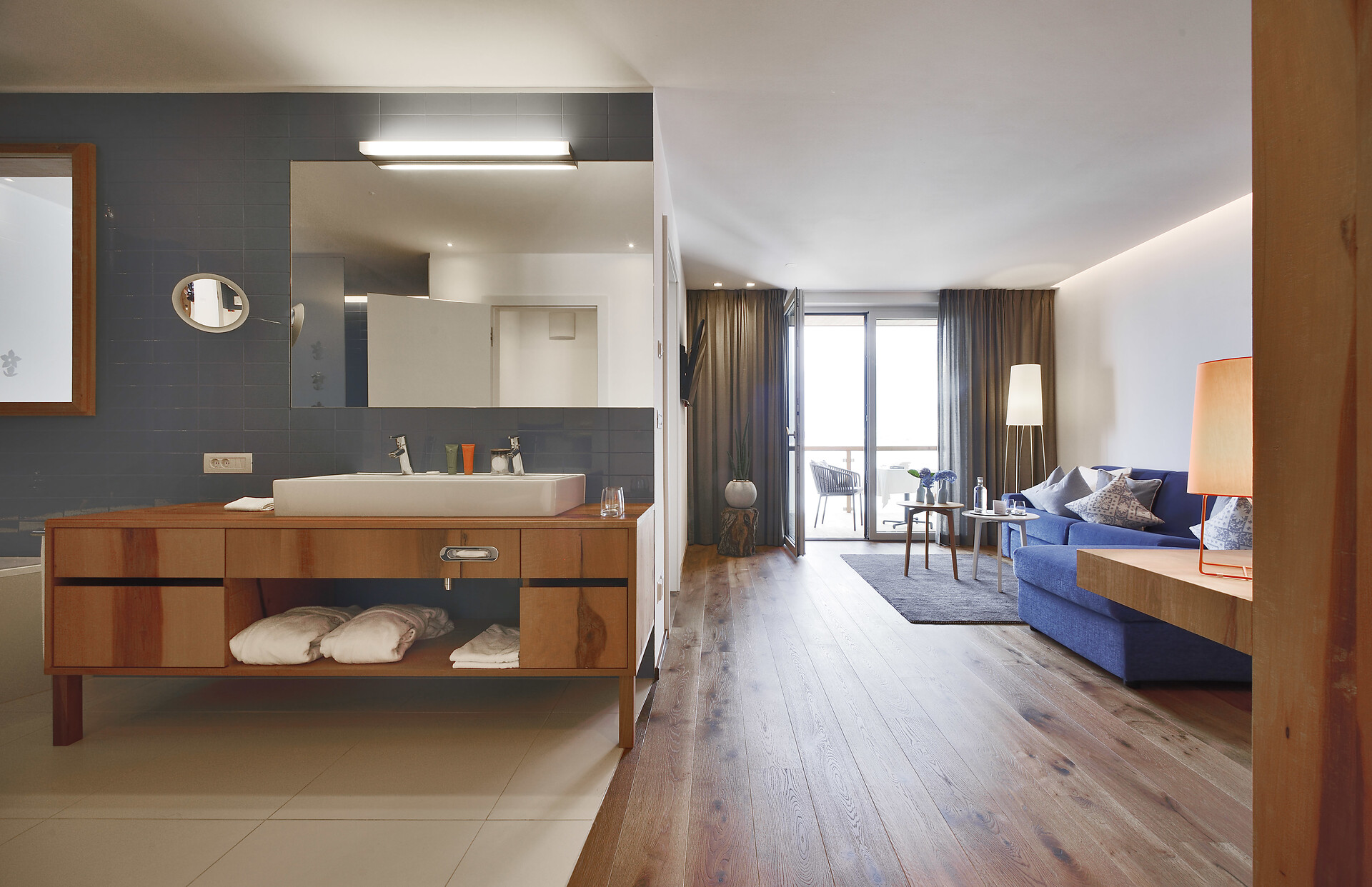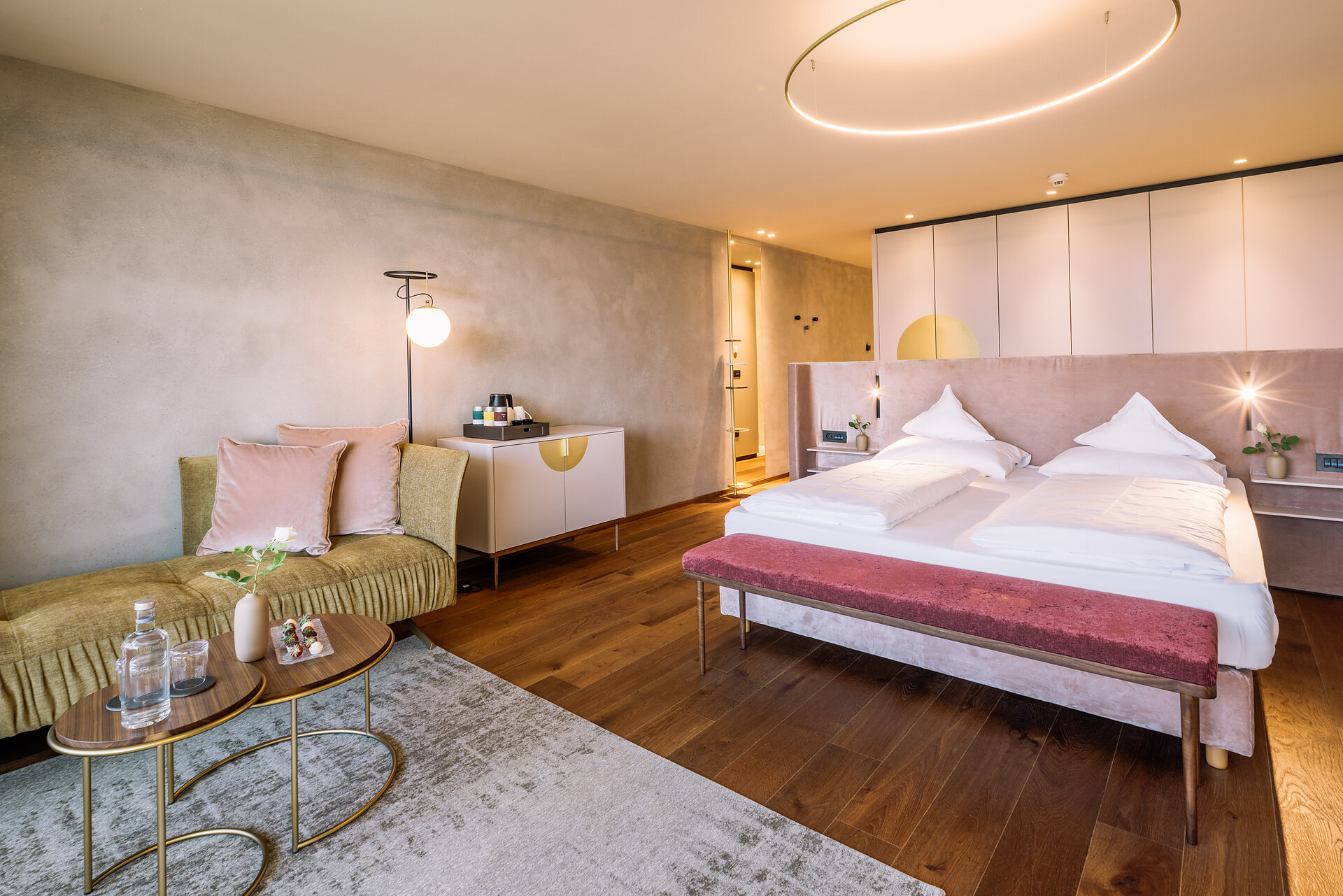 The double room has a modern look, with handmade solid pear wood furnishings, retro-style seating and accessories made of local felt – for an authentic Tyrolean feel-good ambience. The panoramic window offers fantastic views of the surrounding mountains. With modern climate ceiling for pleasant temperatures in every season.