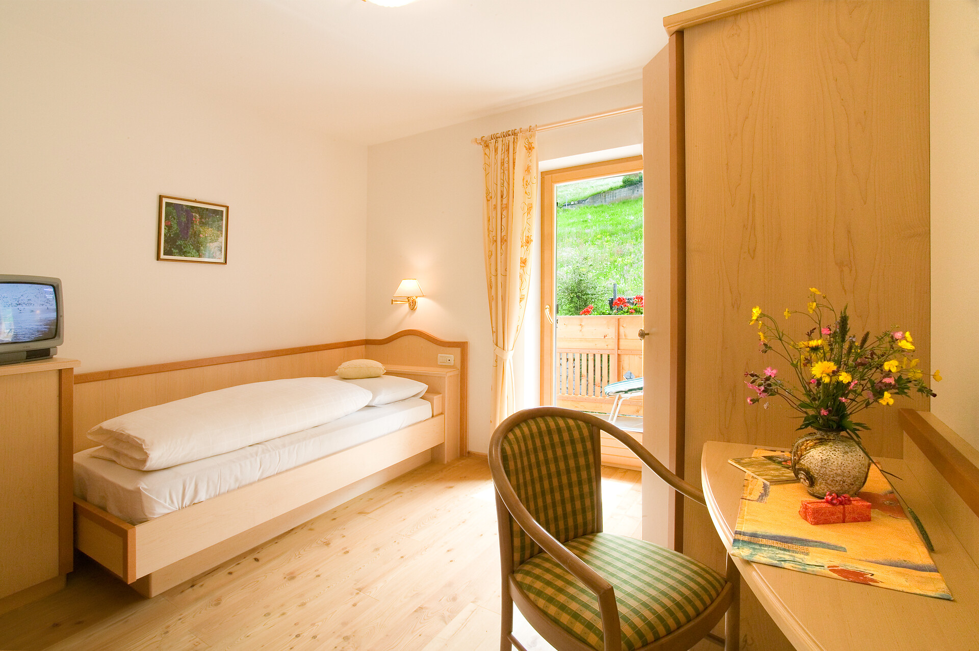 The Ifinger single room (approx. 14 m²) is a retreat for solo travellers looking for peace and comfort in the South Tyrolean mountains - a relaxing break is guaranteed here. With its natural wooden floor and tasteful furnishings, it radiates an inviting warmth.