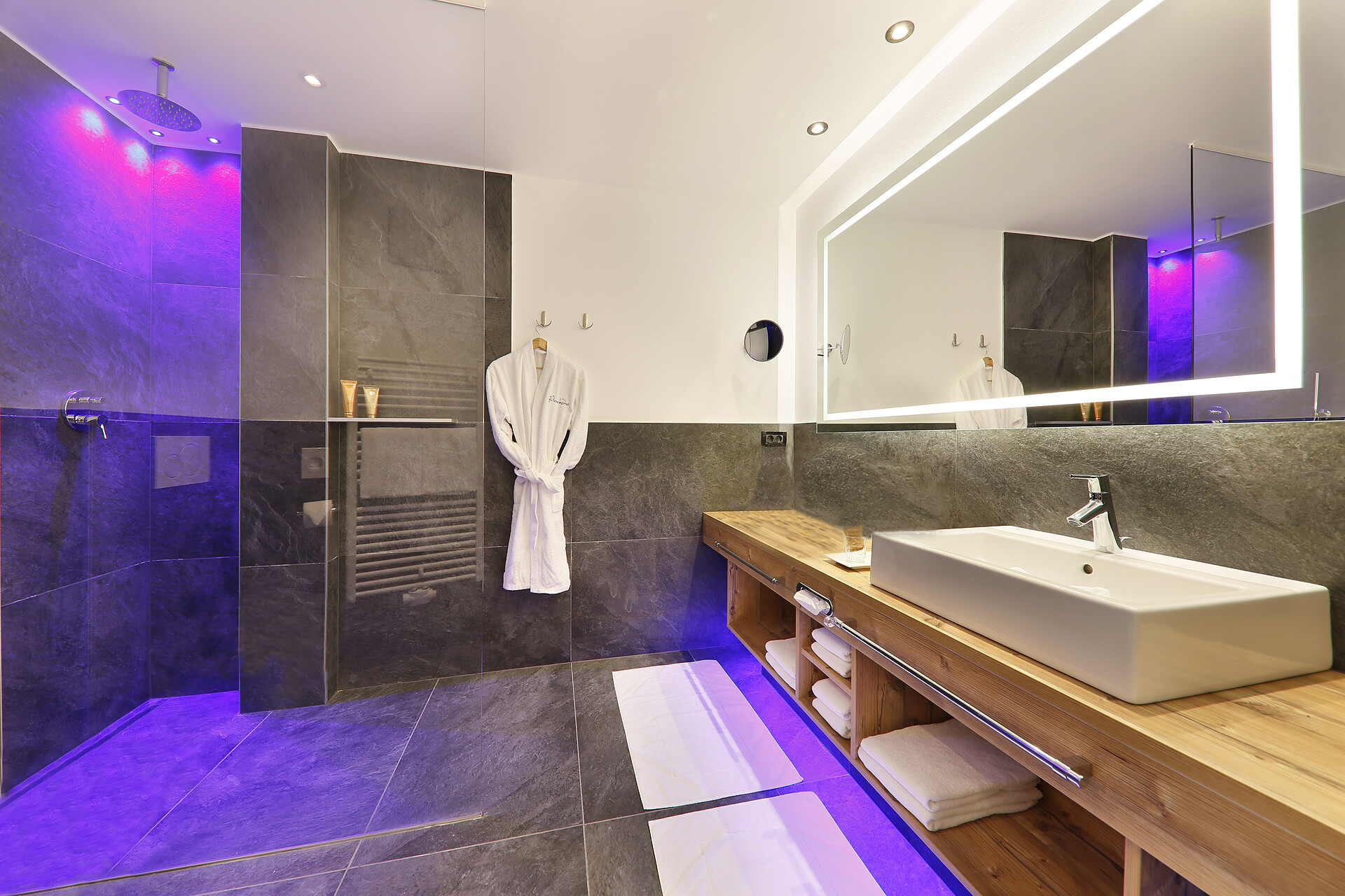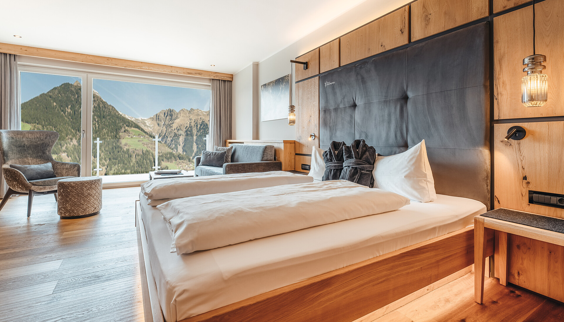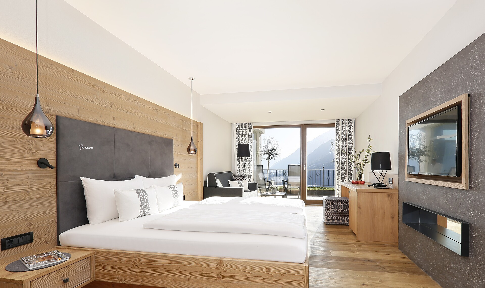 Double room deluxe with showerbath, toilette, hairdryer, wellness bag with bathrobe and slippers, telefon, safe, mini fridge, Flat Screen TV, WIFI, living space, big balcony with valley view.