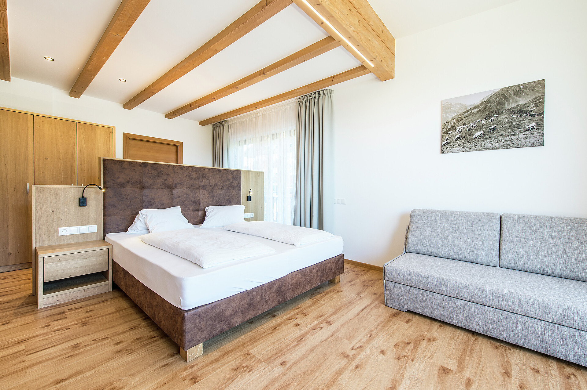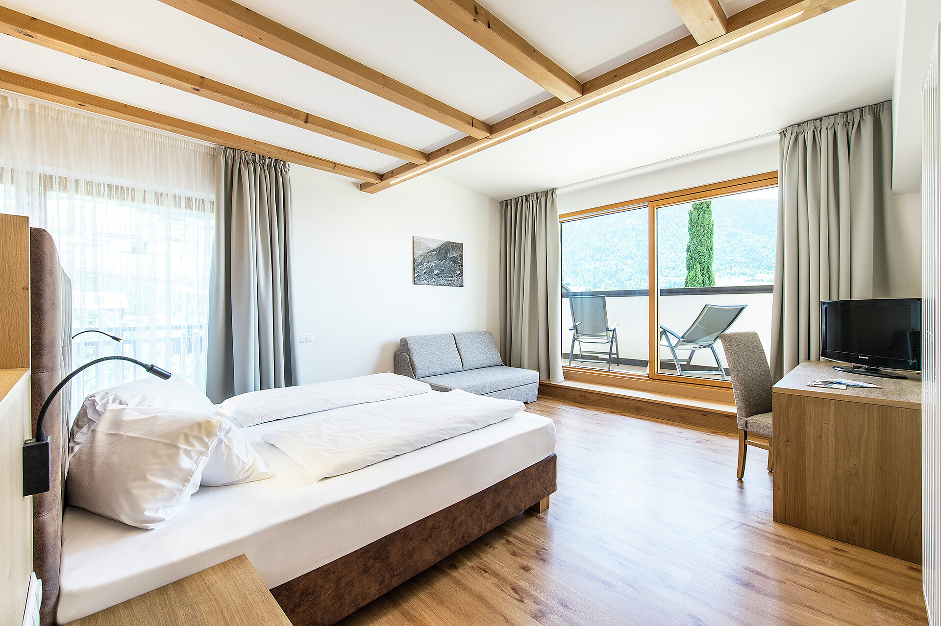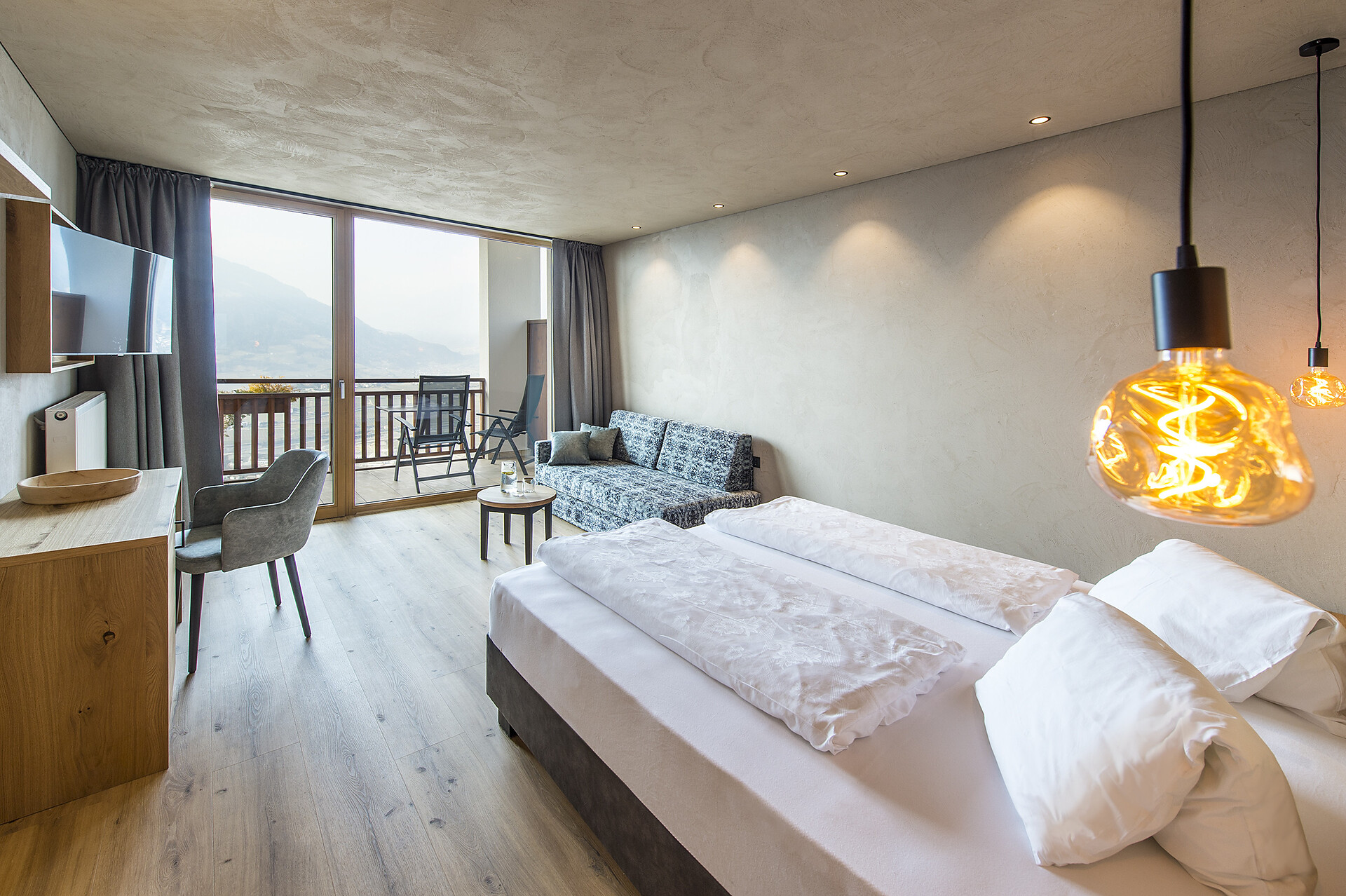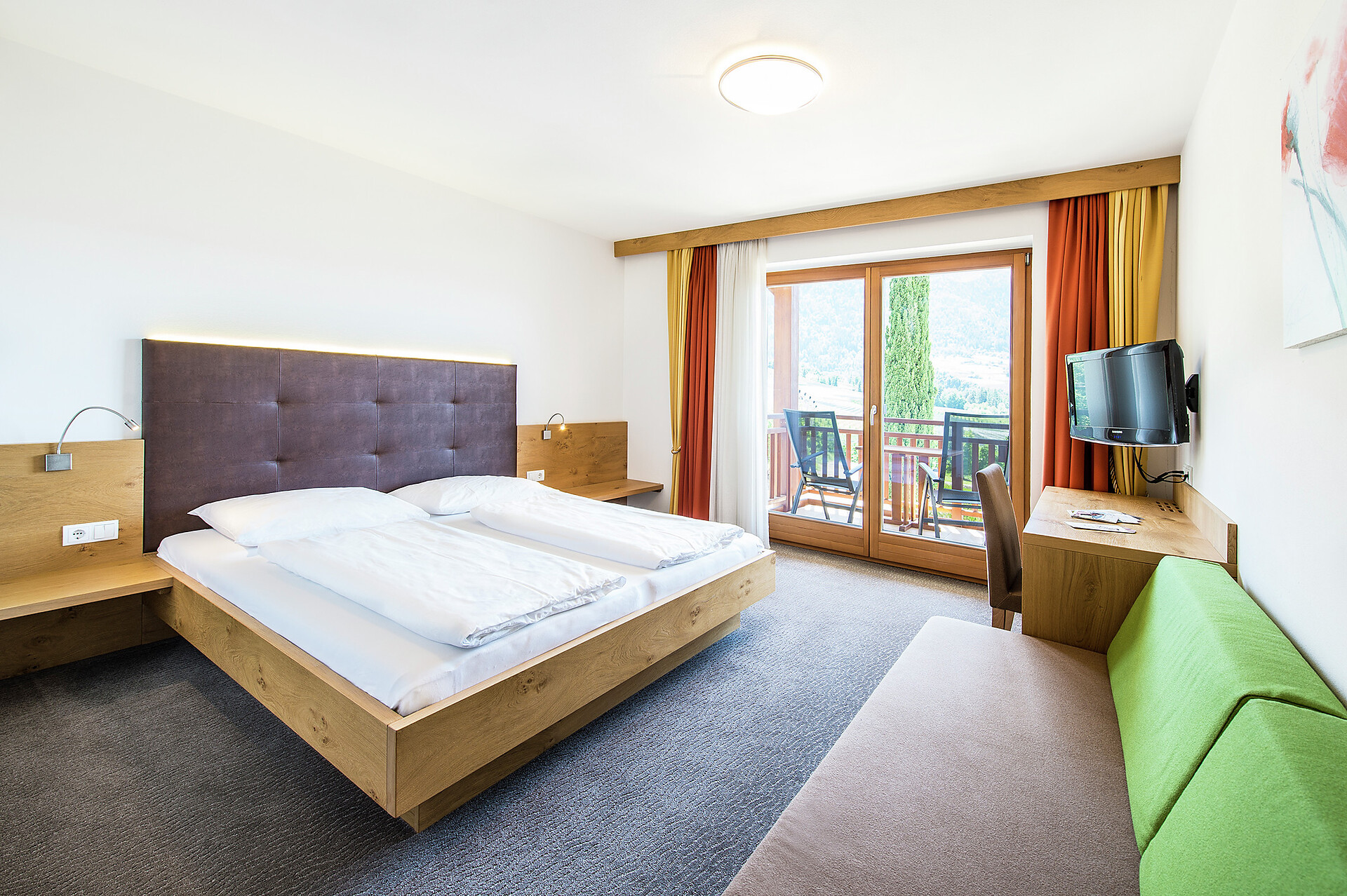 Double bed , Cot, Balcony, Air conditioning, Room with connecting door, Mini-bar, Safe, Shower / Bath tub, Separate WC, Hair dryer, TV, WLAN, Panoramic view, South view