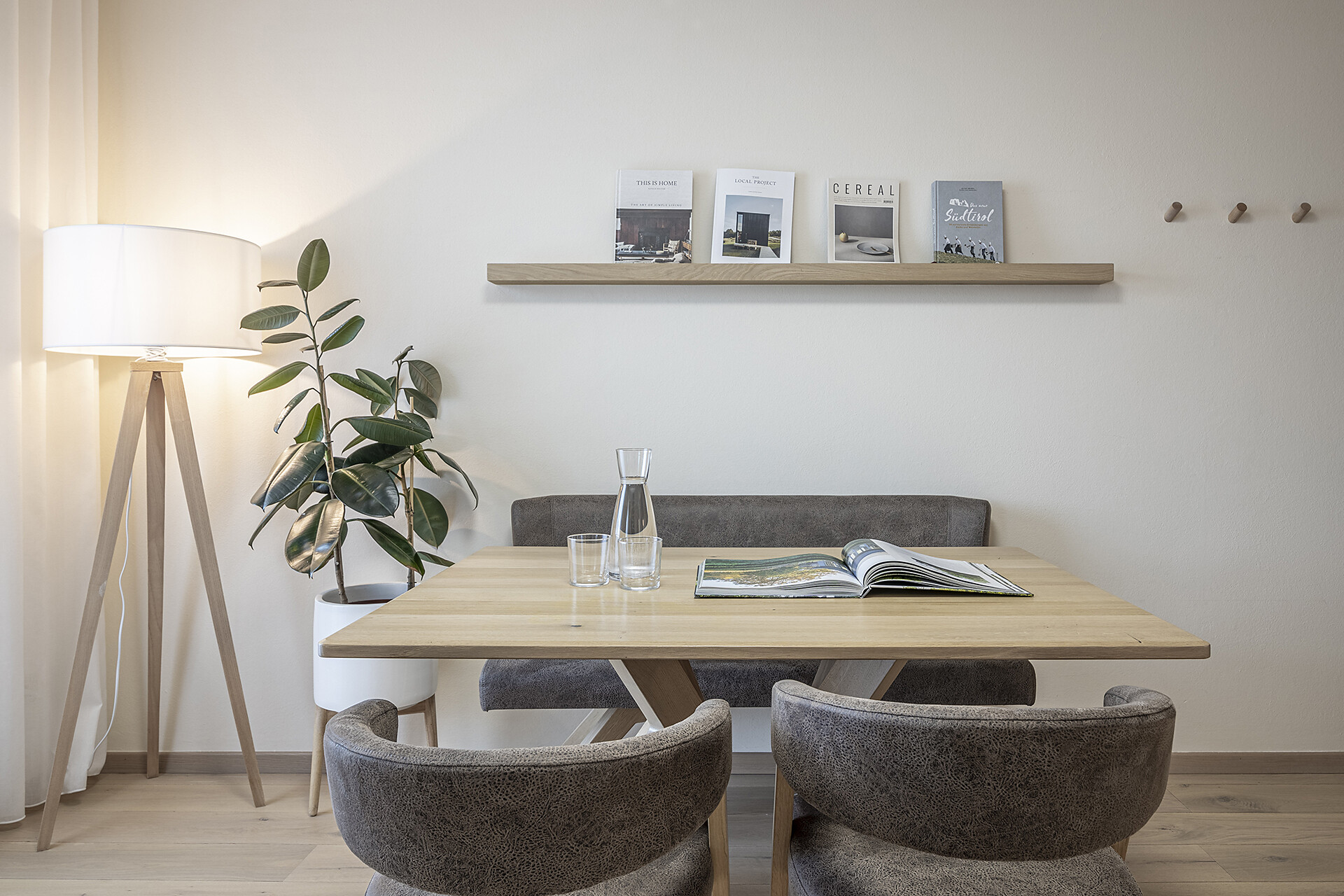 A thoughtful design creates a modern, stylish atmosphere: clean lines, warm materials, high-quality designer furniture, elegant oak parquet flooring. Everything reduced to the essentials: peace, style, space for thoughts.