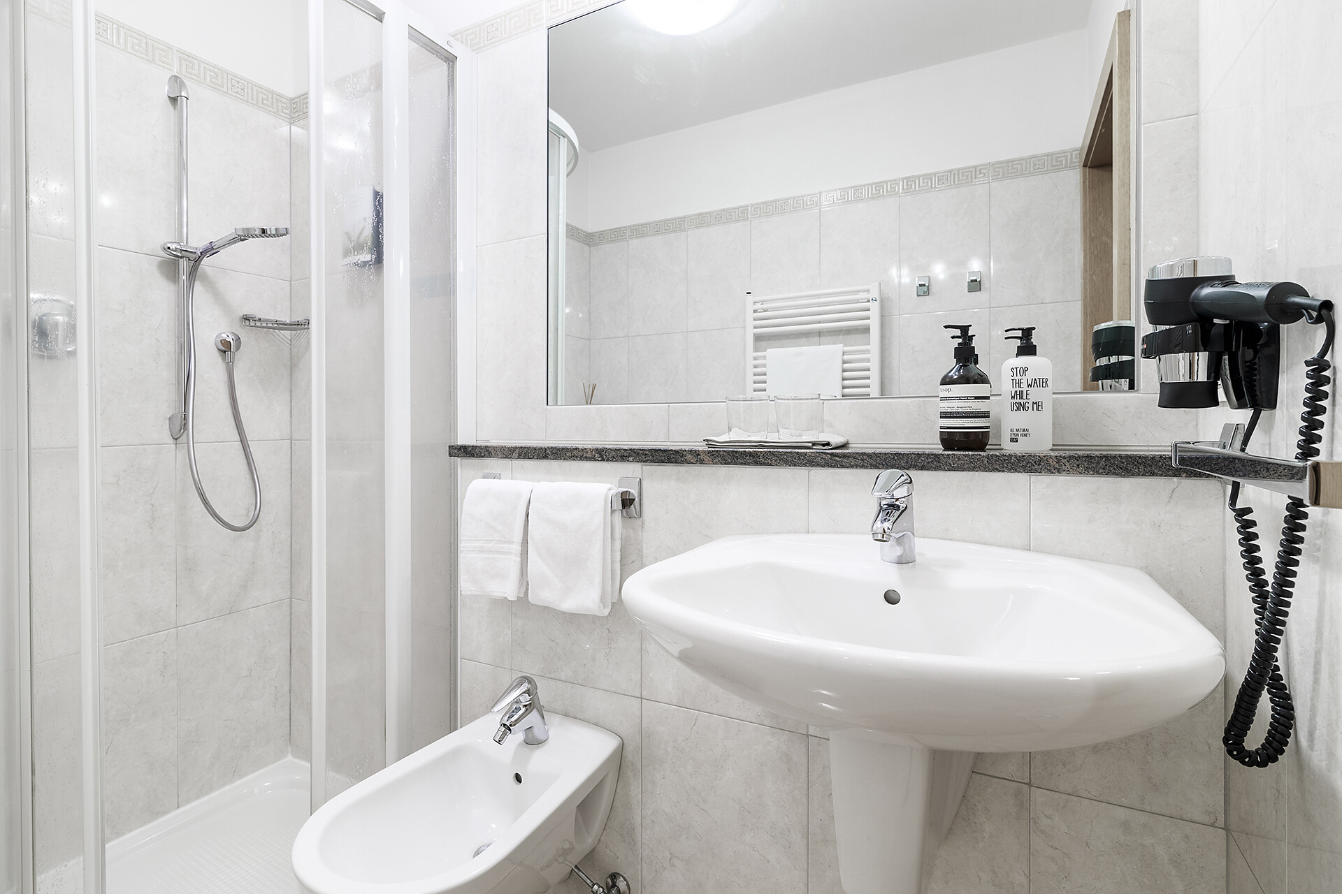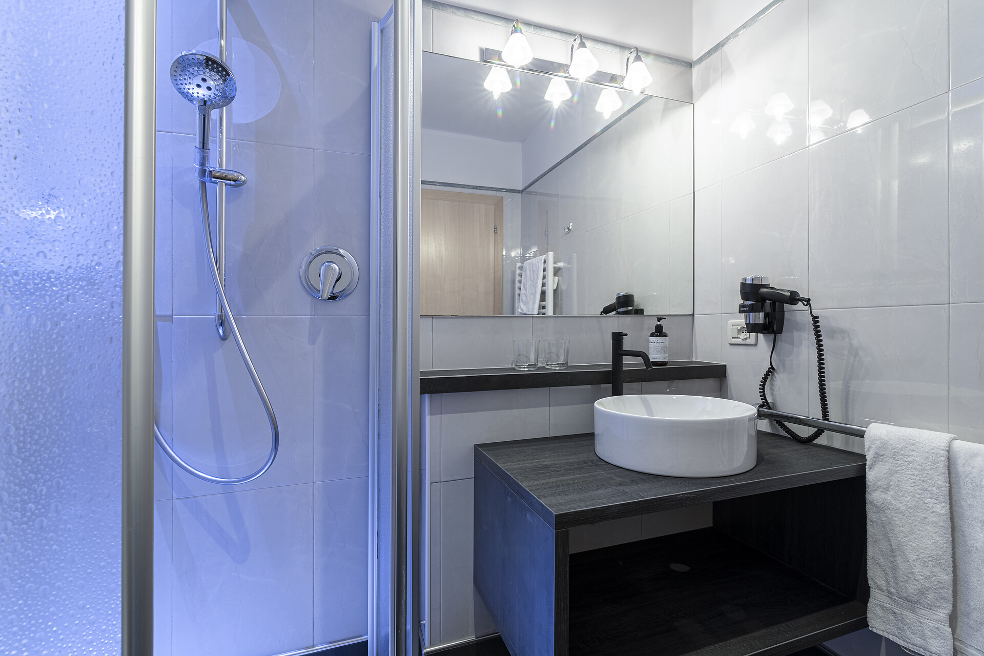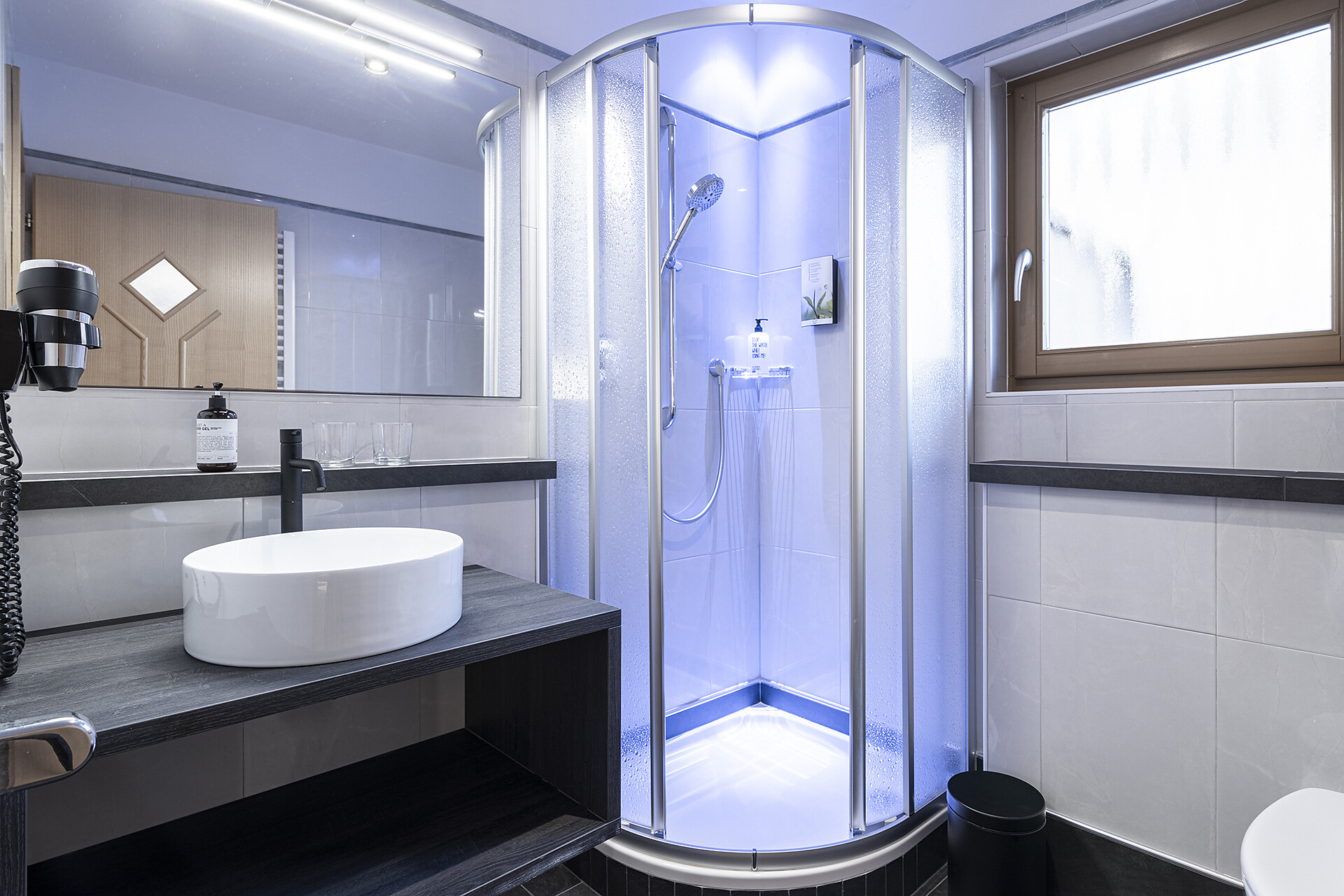 The modern bathroom focuses on refined restraint and timeless elegance: frosted glass for stylish privacy, the spacious walk-in rain shower promises pure refreshment.